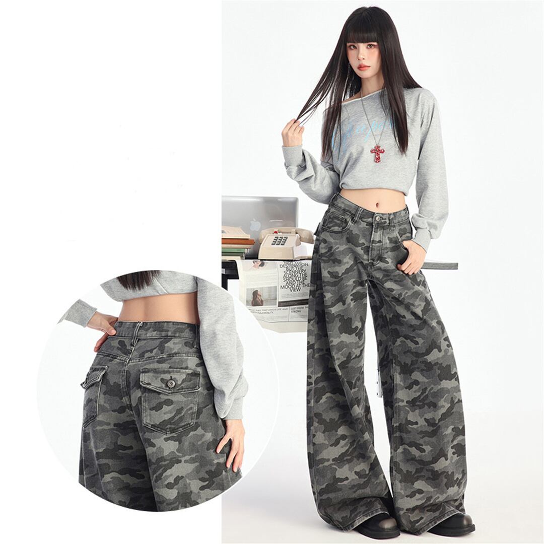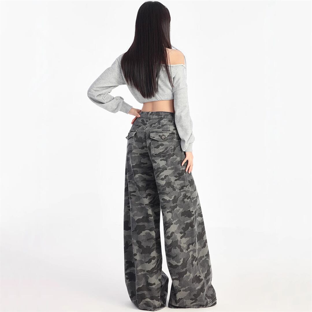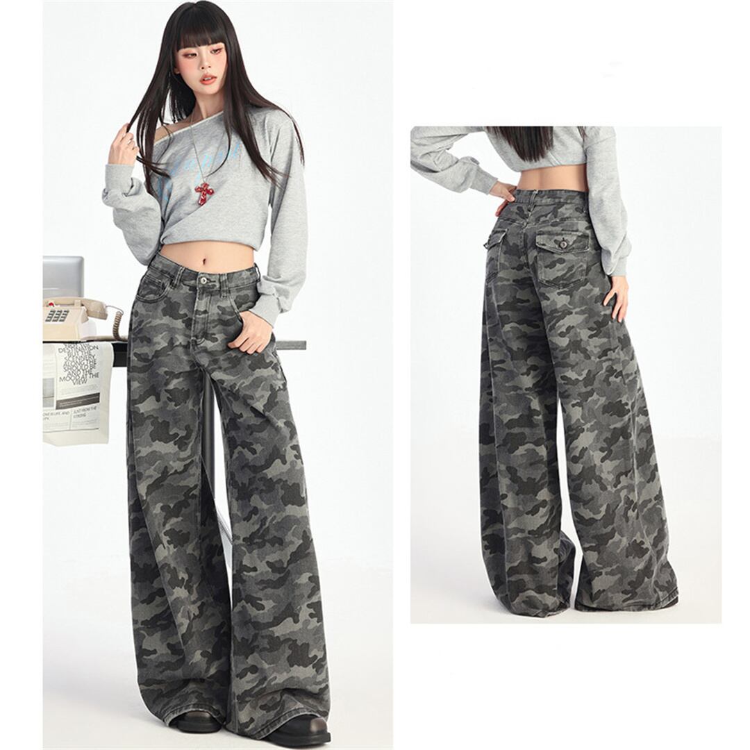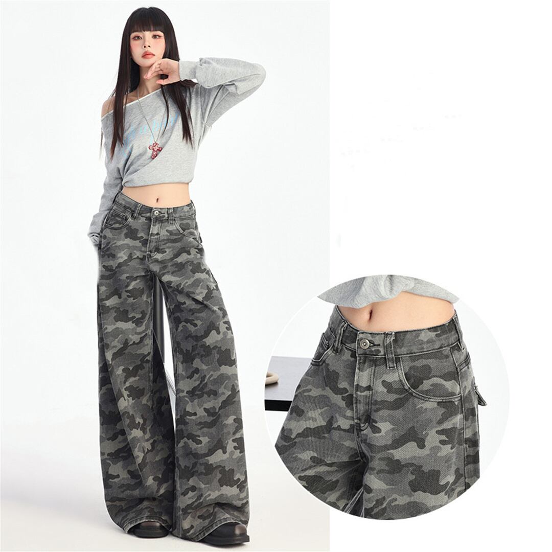 【JXシリーズ】ボトムス レトロ 迷彩 デニムパンツ ハイウエスト 細見え XS S M L XL