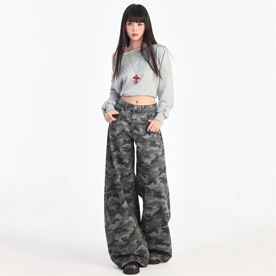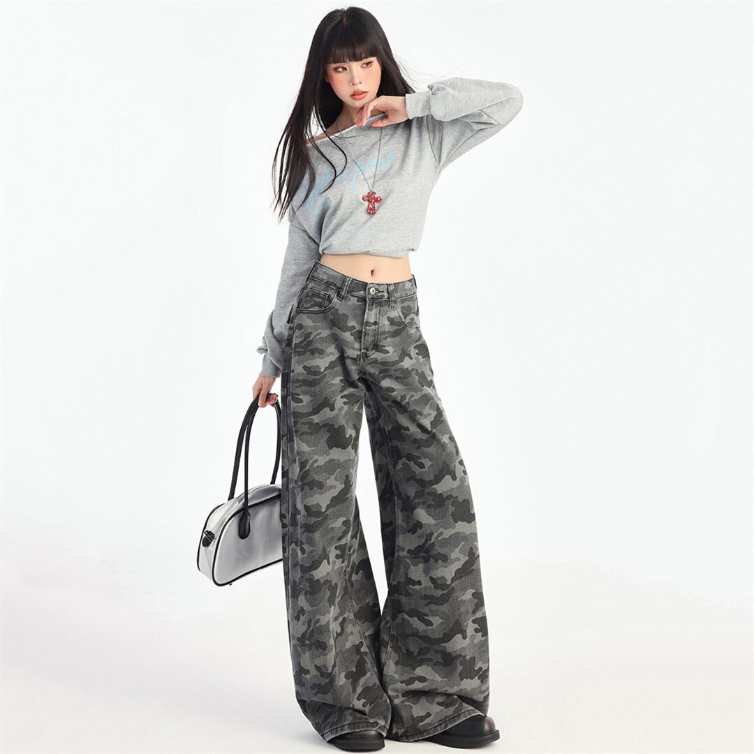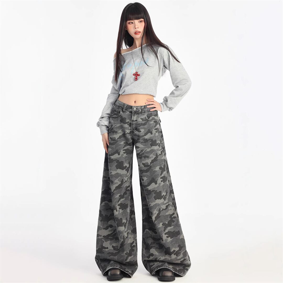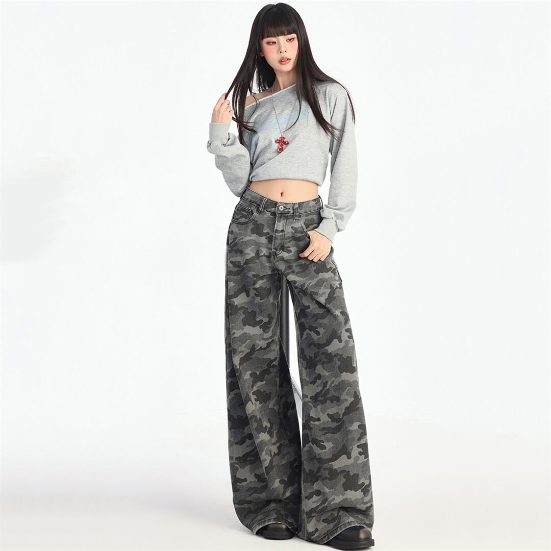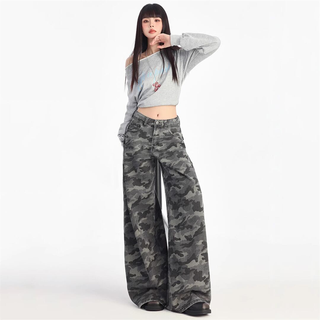 【JXシリーズ】ボトムス レトロ 迷彩 デニムパンツ ハイウエスト 細見え XS S M L XL