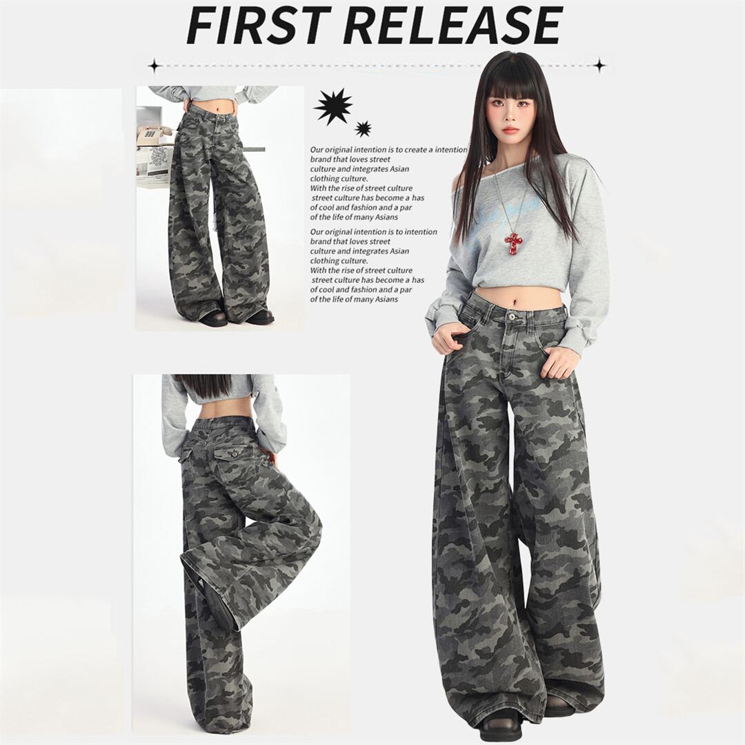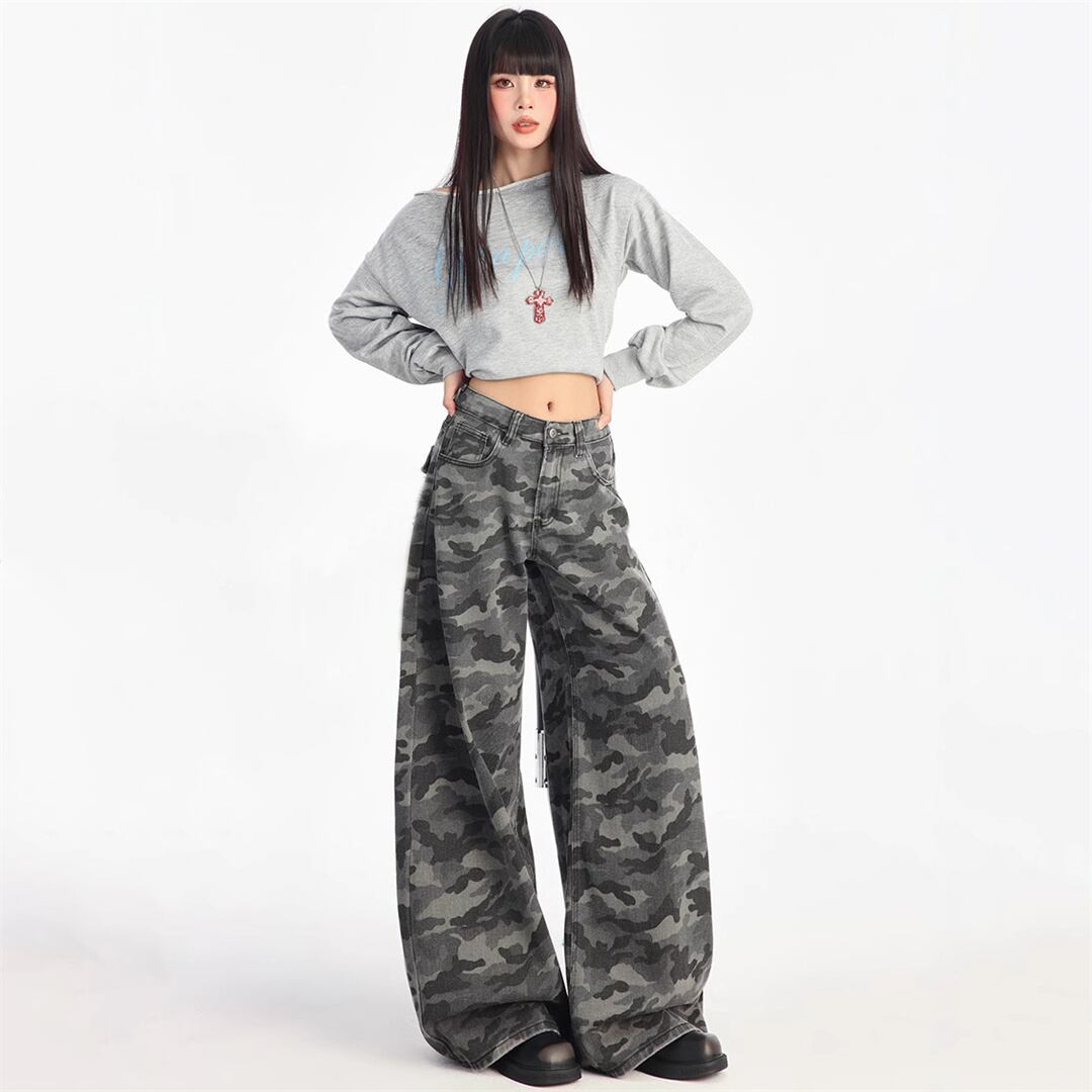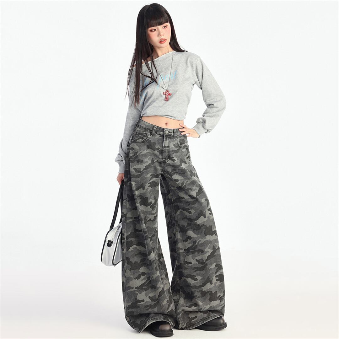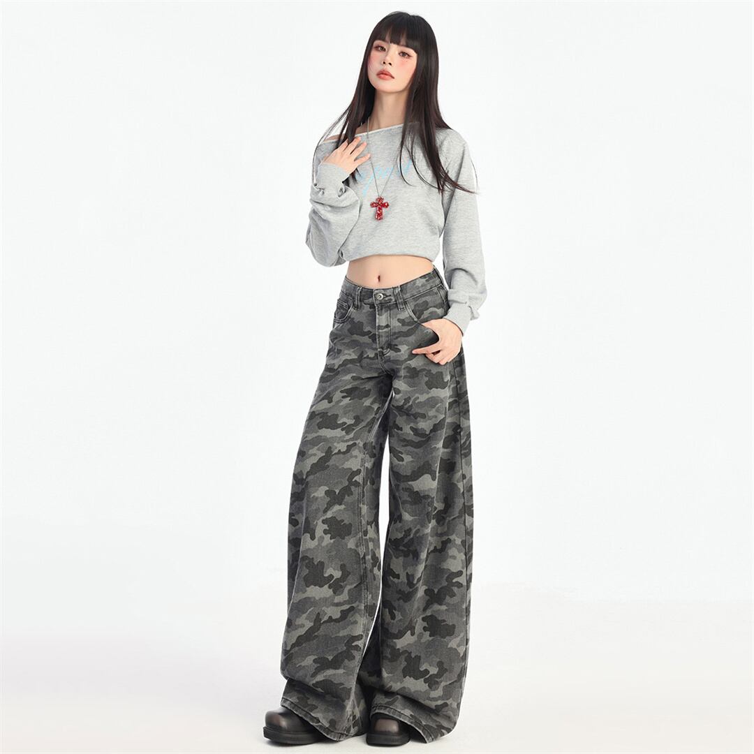 【JXシリーズ】ボトムス レトロ 迷彩 デニムパンツ ハイウエスト 細見え XS S M L XL