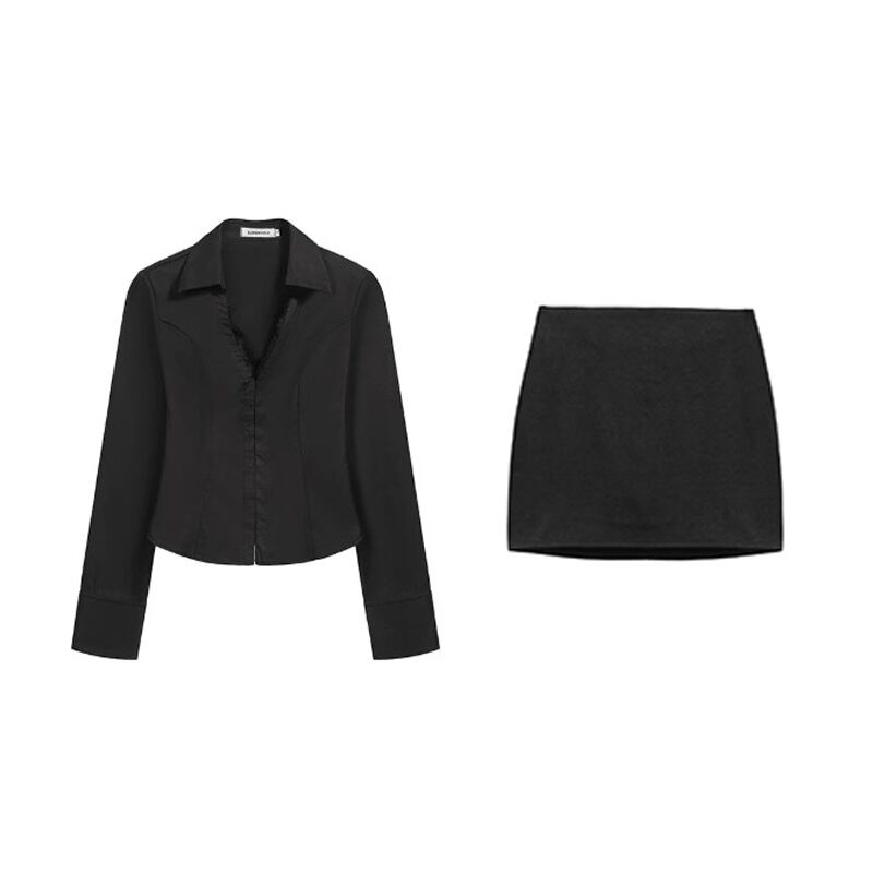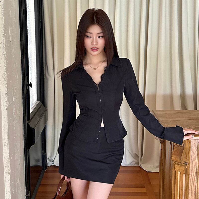 セットアップ シャツ+スカート フェミニン レース 無地 ブラック S M L