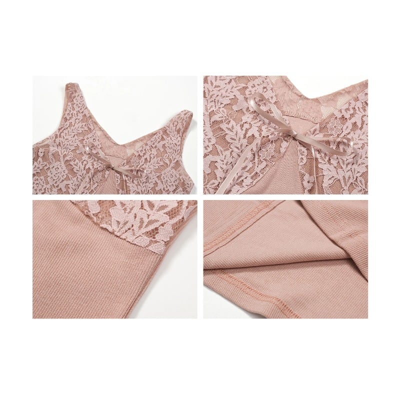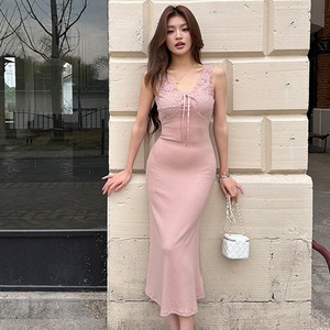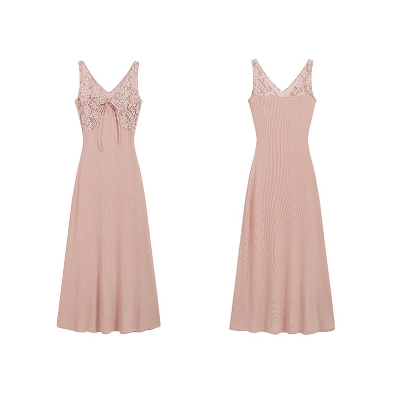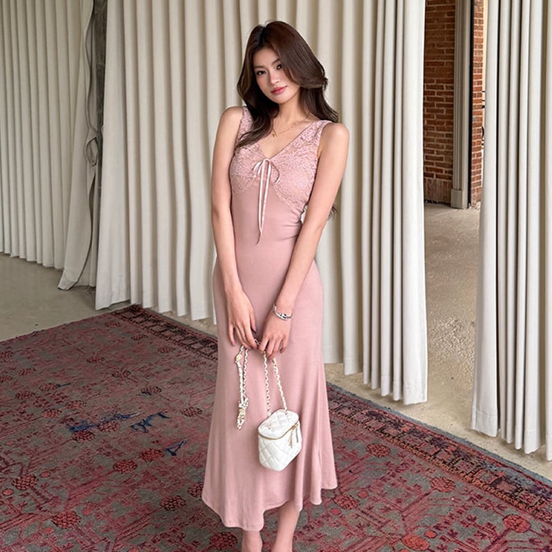 ワンピース レース Vネック 美人度アップ リボン ピンク S M L