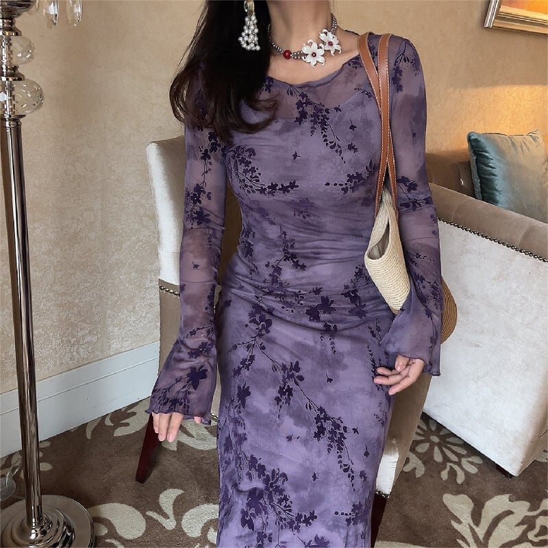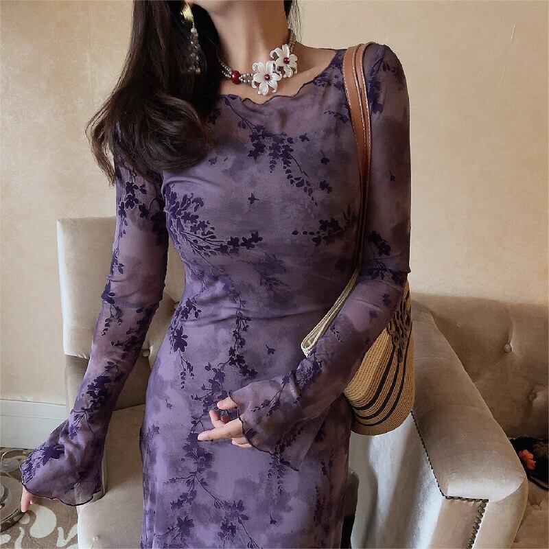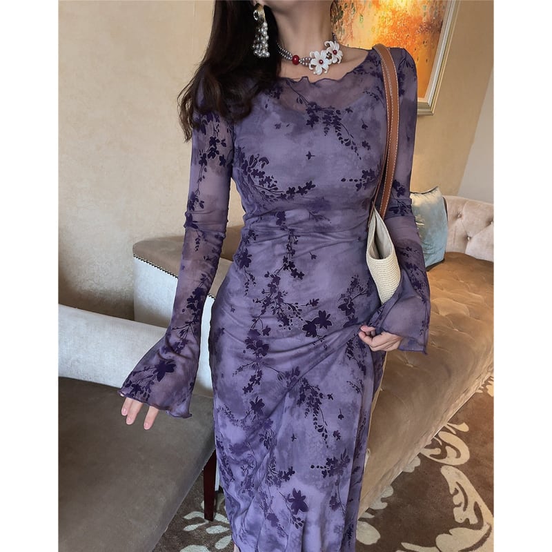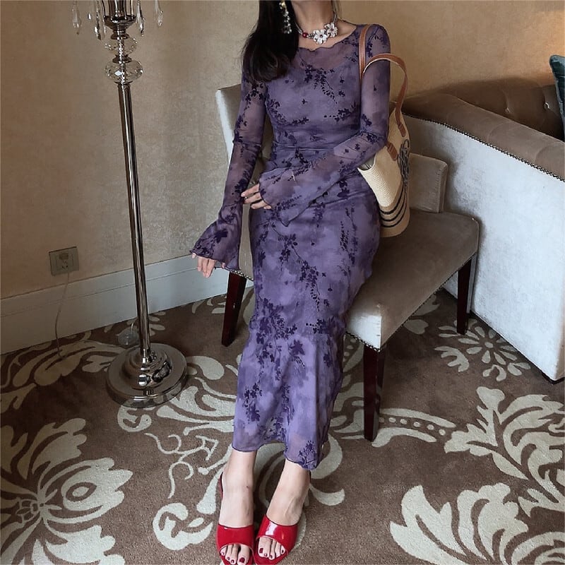 ワンピース 花柄 メッシュ 長袖 魅せられる 気質溢れる パープル S M L
