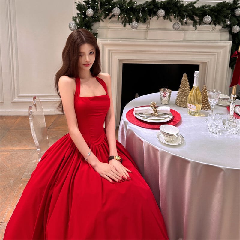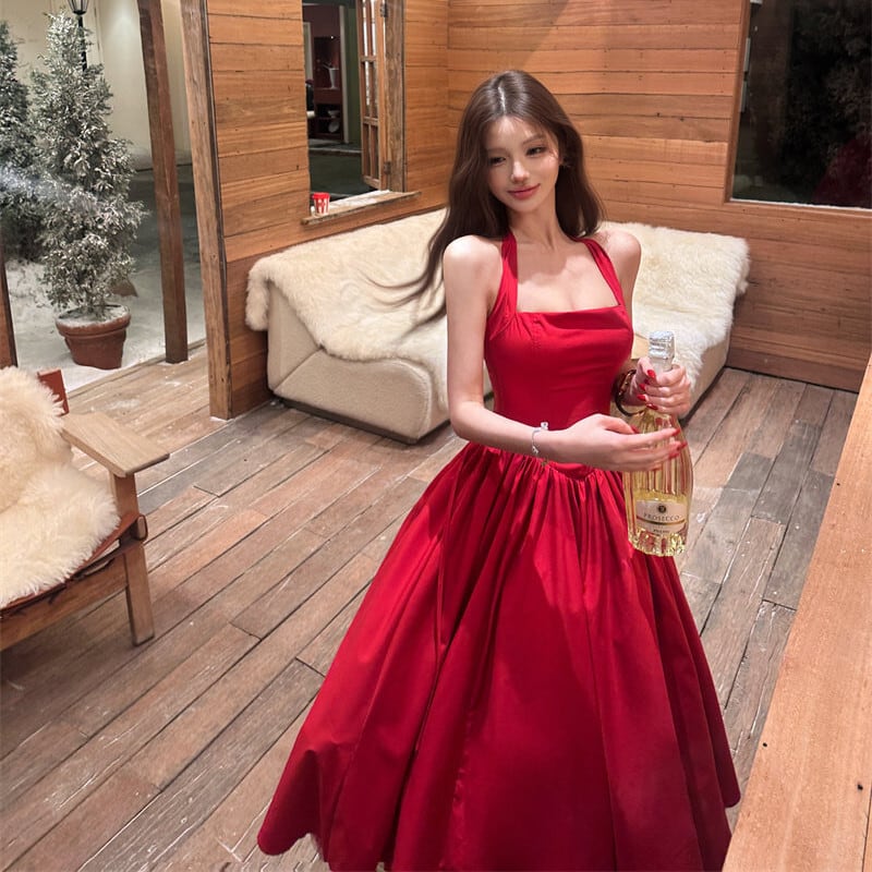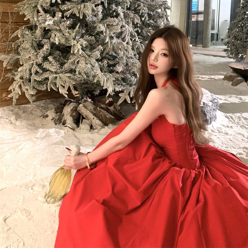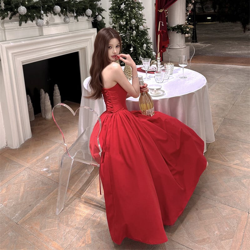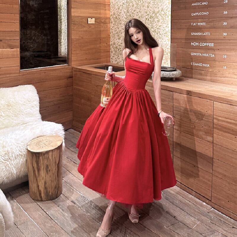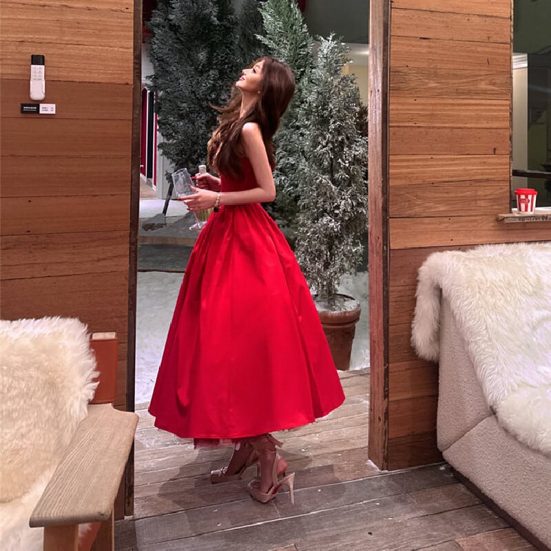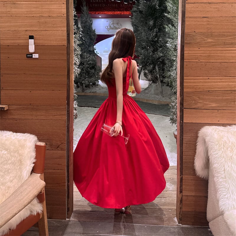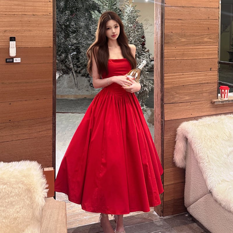 パーティードレス バックリボン フレア 視線集中 レッド S M L