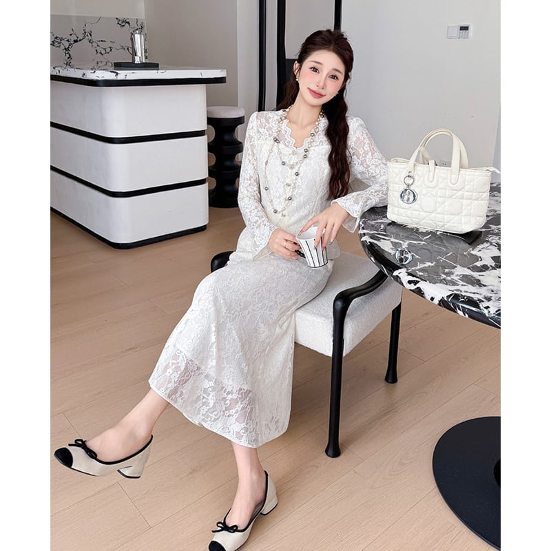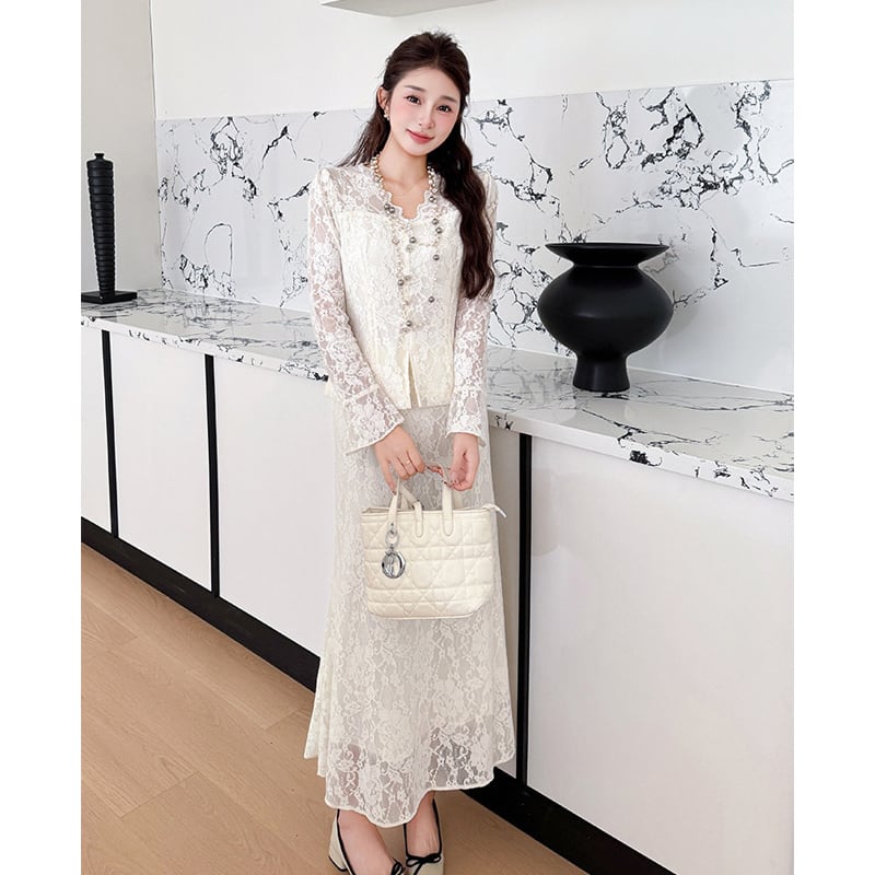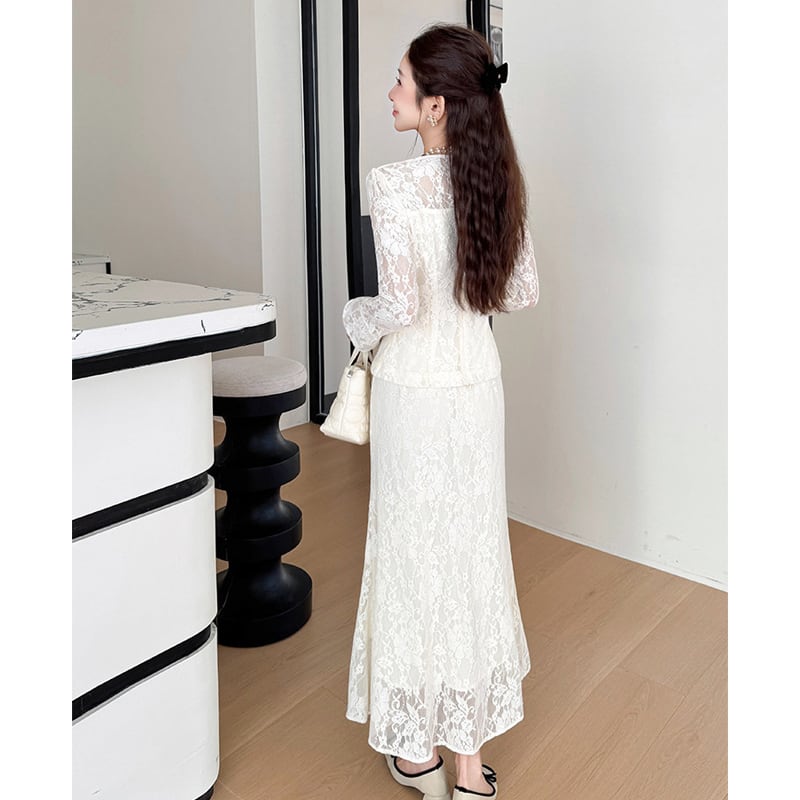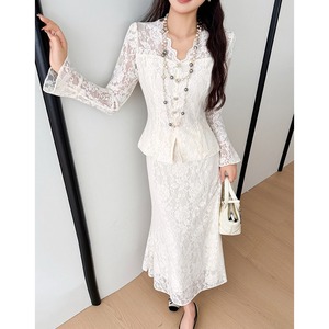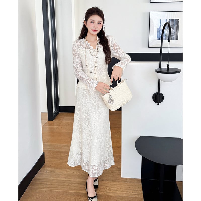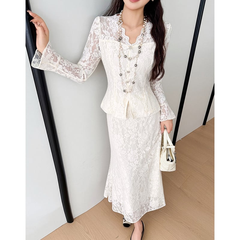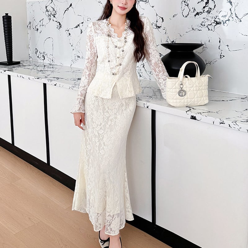 セットアップ レース Vネック トップス+フィッシュテールスカート ライトベージュ S M L XL