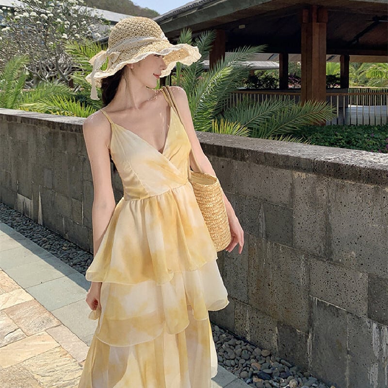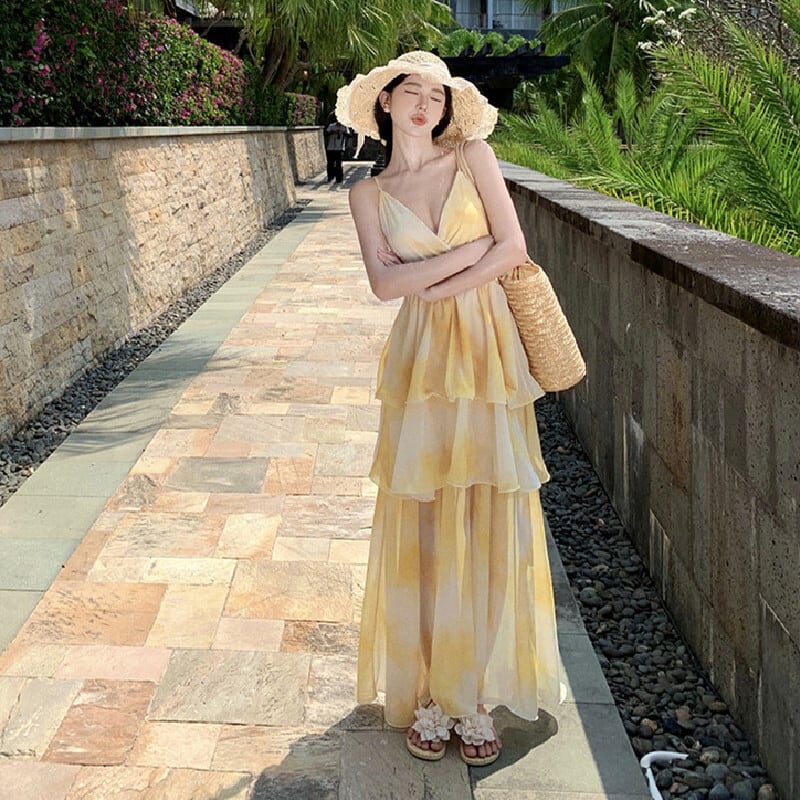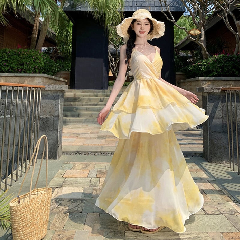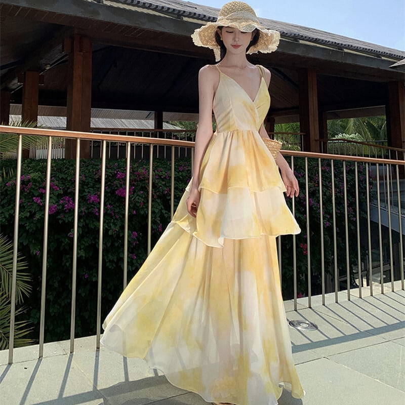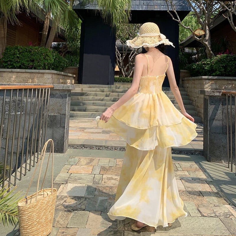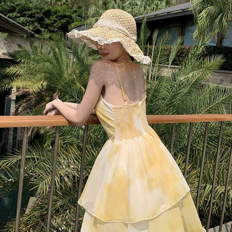 【SummerVacationシリーズ】ワンピース にじみパッチワーク ティアード イエロー S M L