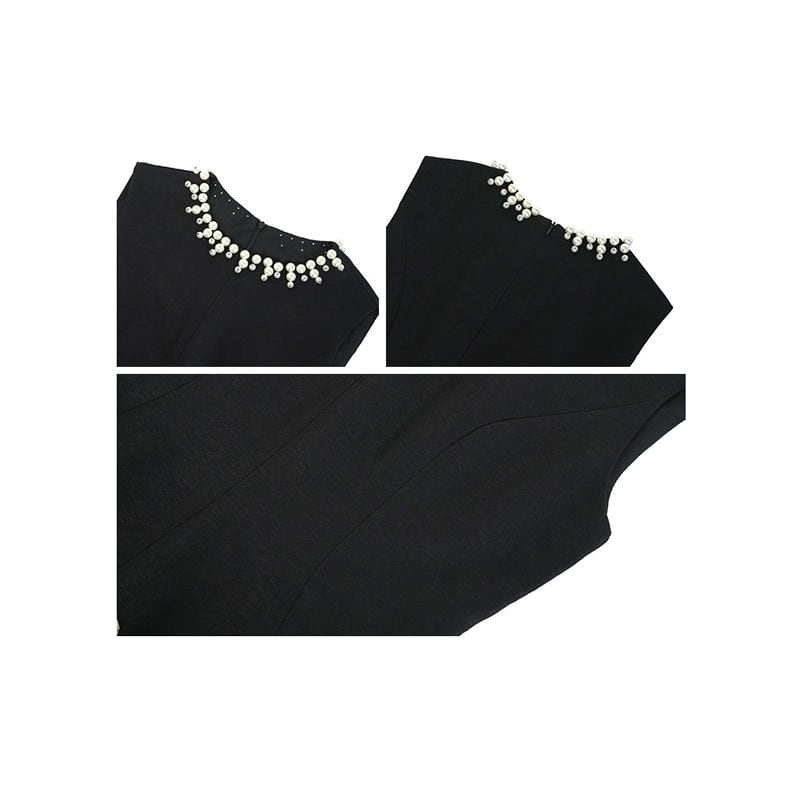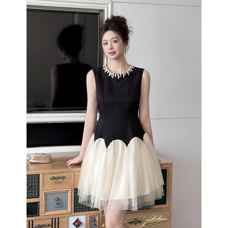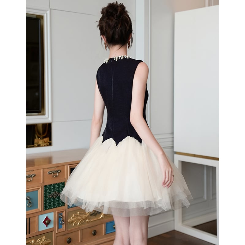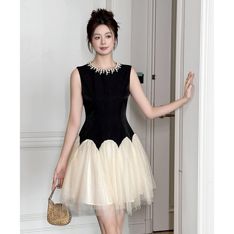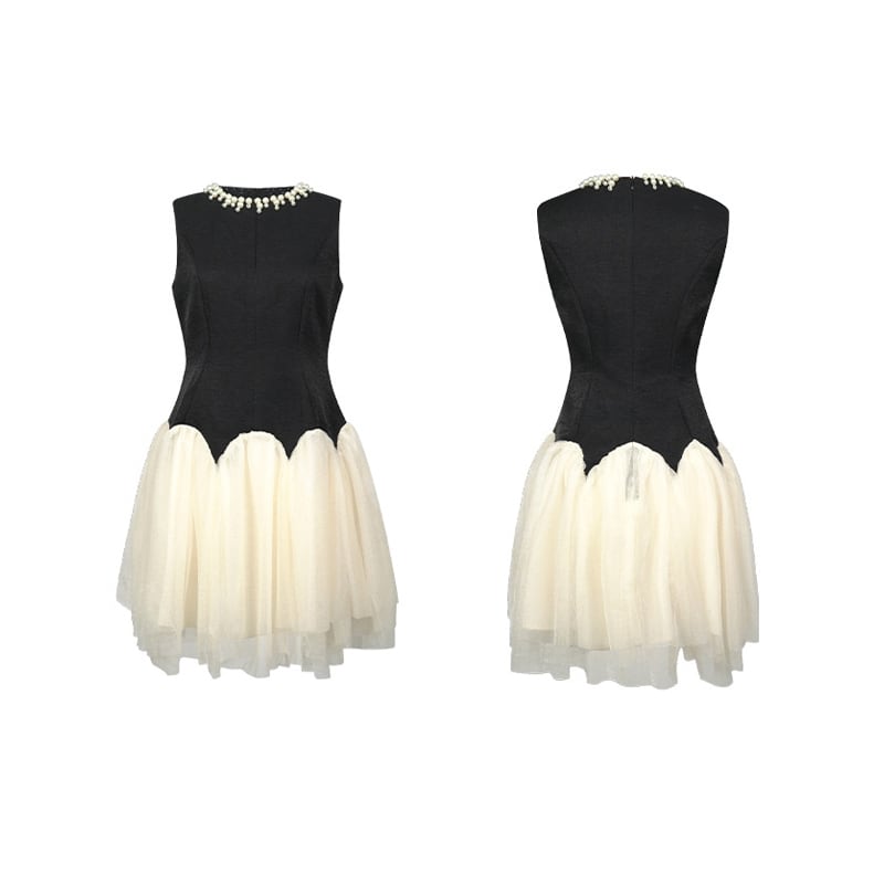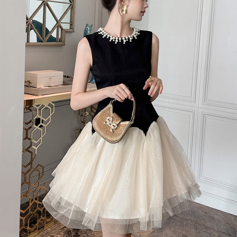 【夕暮薔薇シリーズ】ワンピース ノースリーブ パール飾り メッシュ 配色 S M L XL
