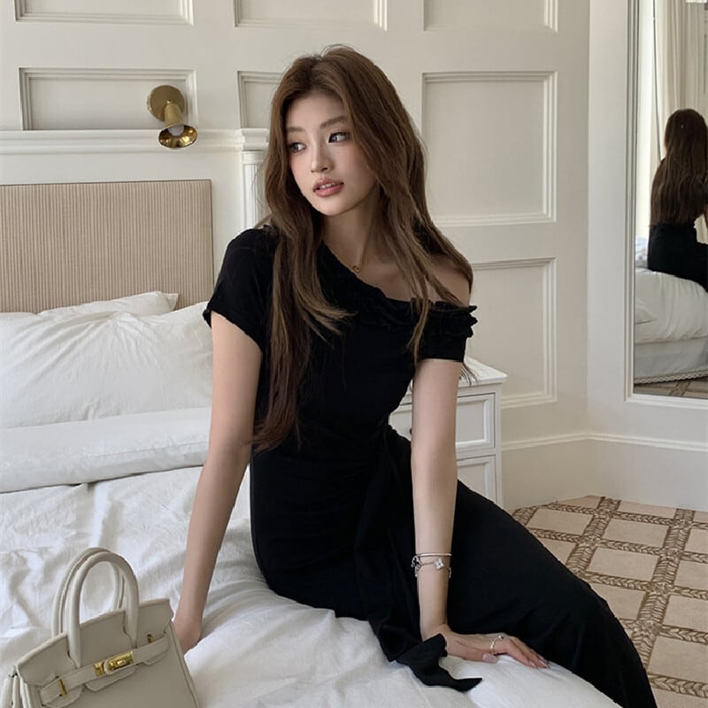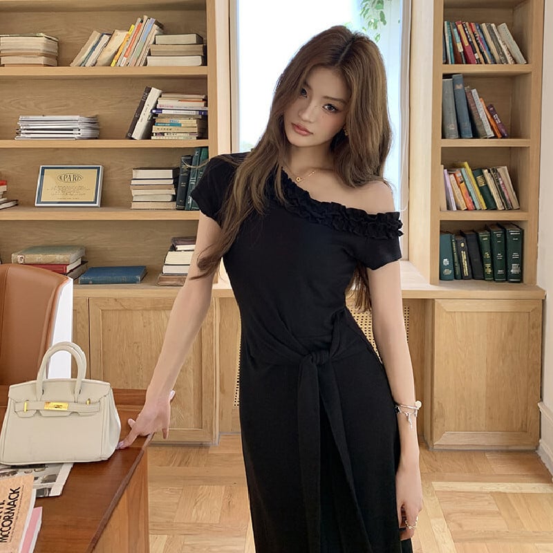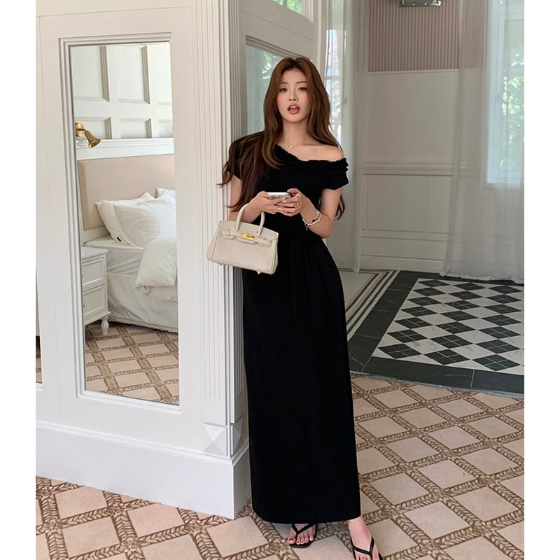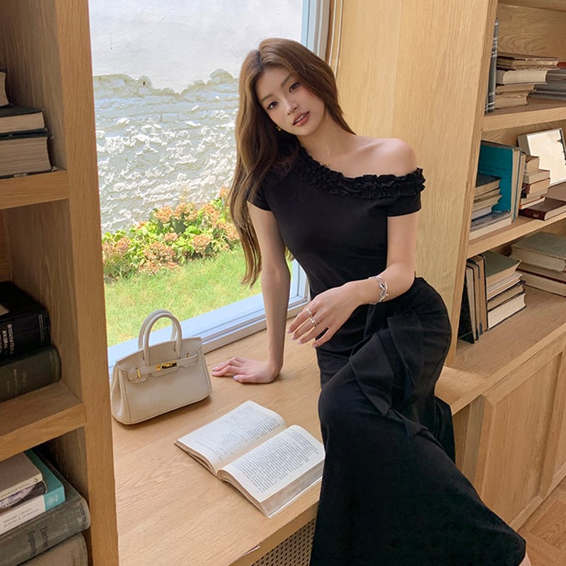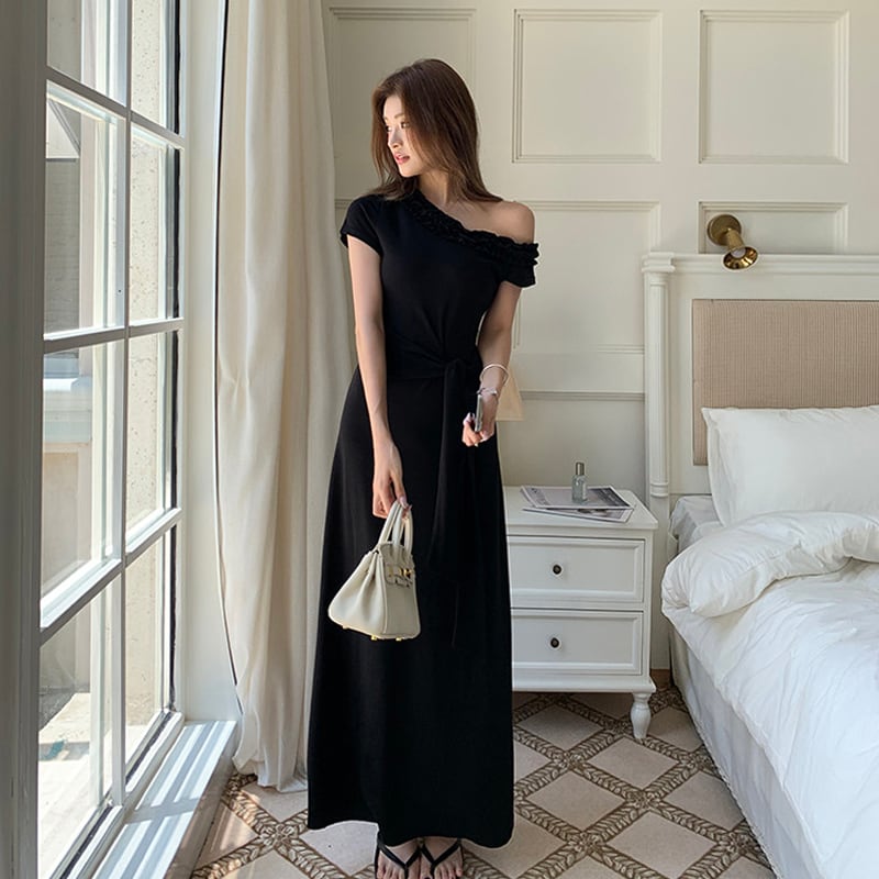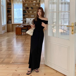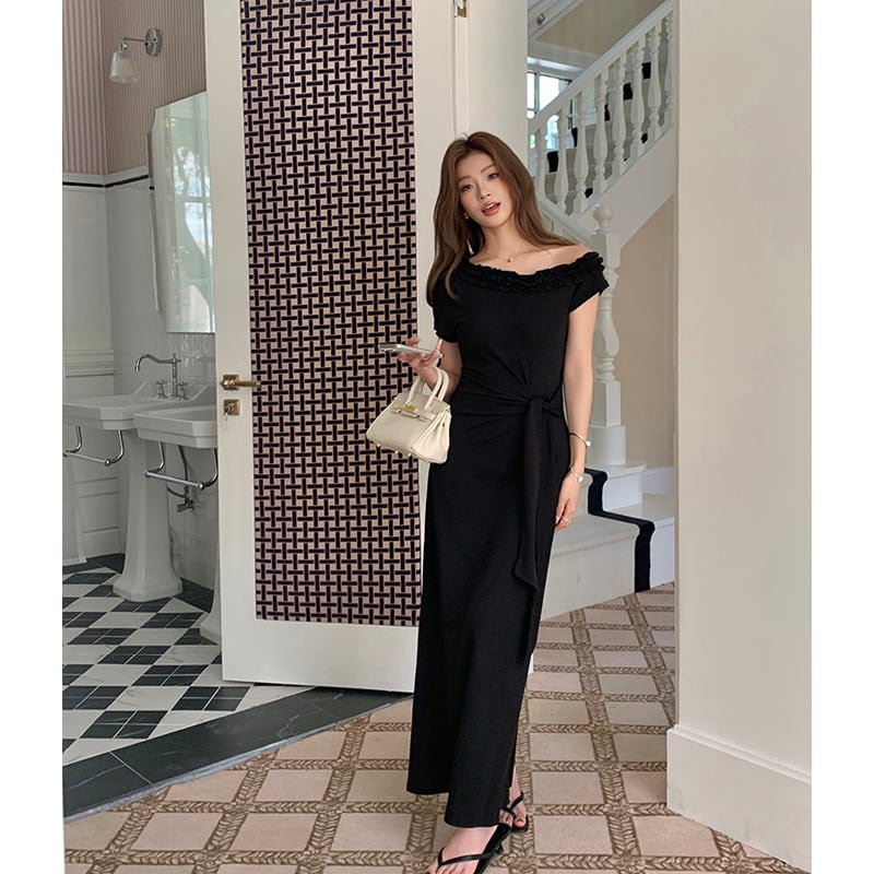 ワンピース オフショルダー ウエストリボン 無地 ブラック S M L