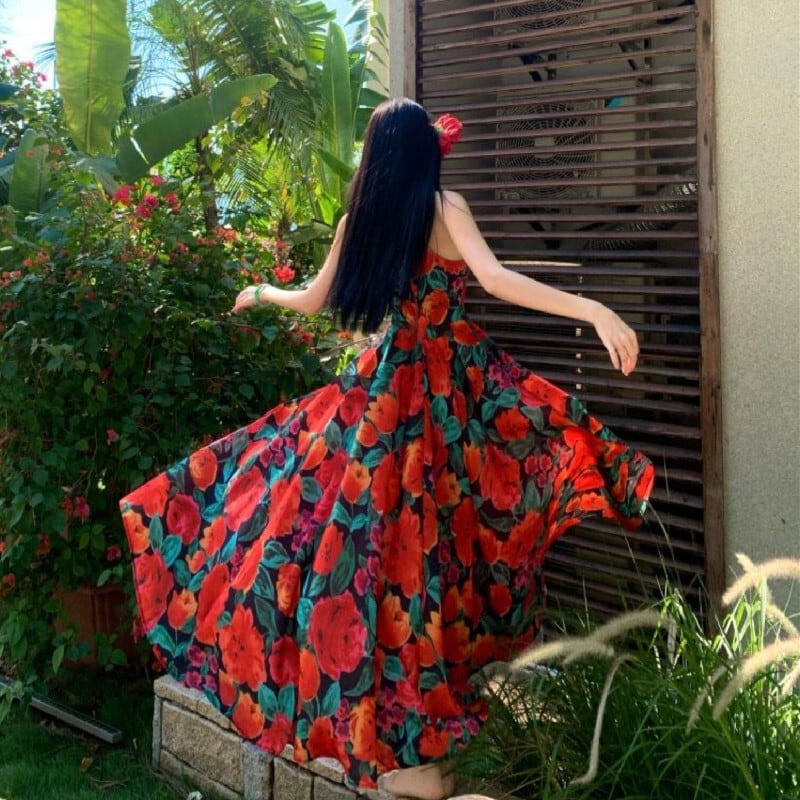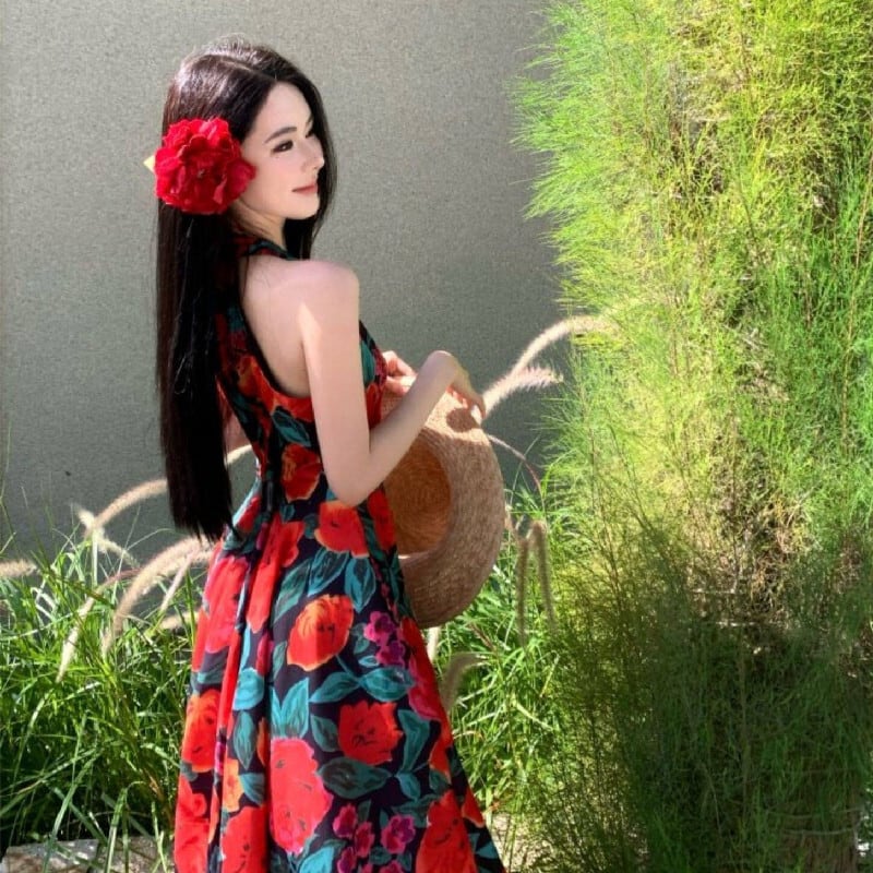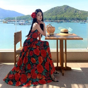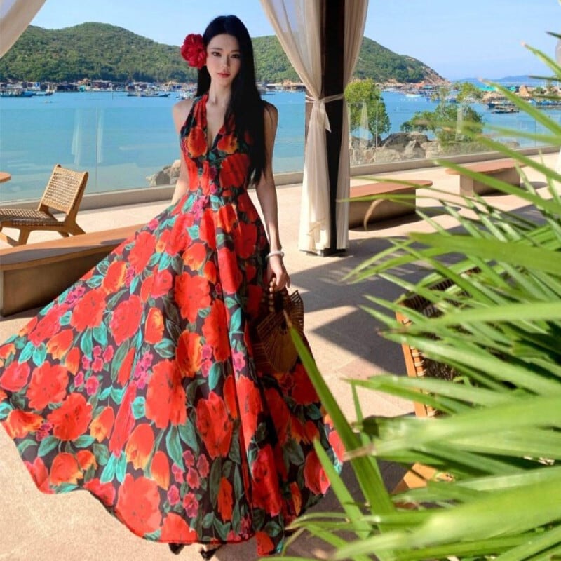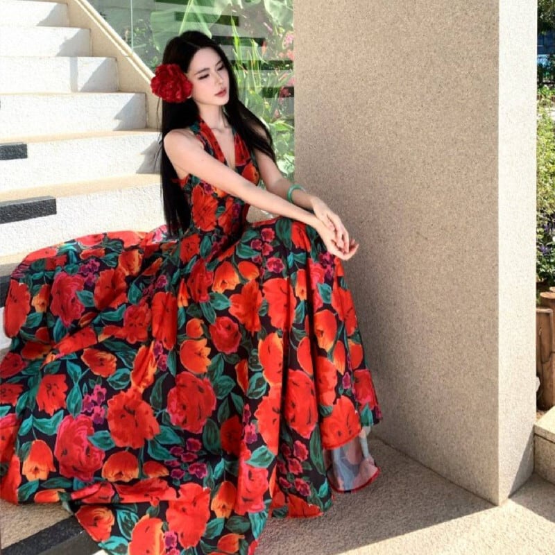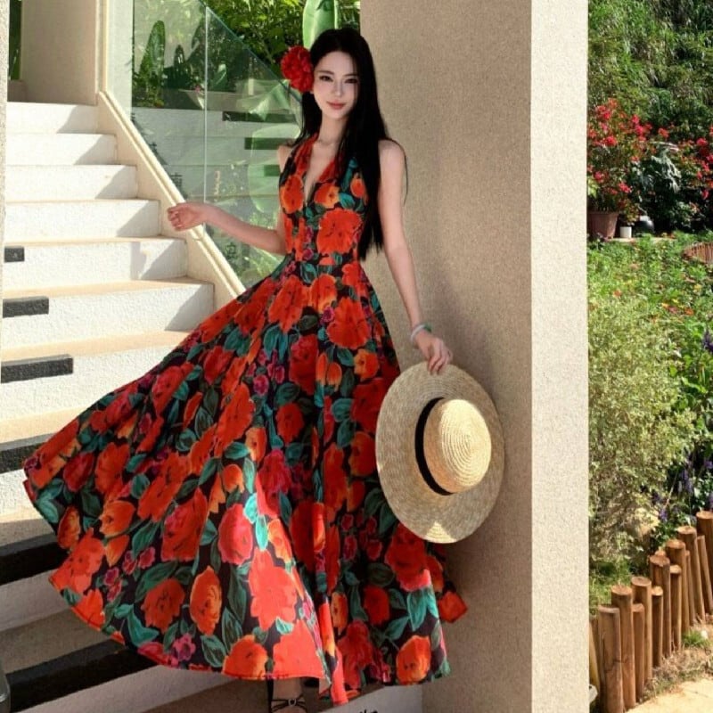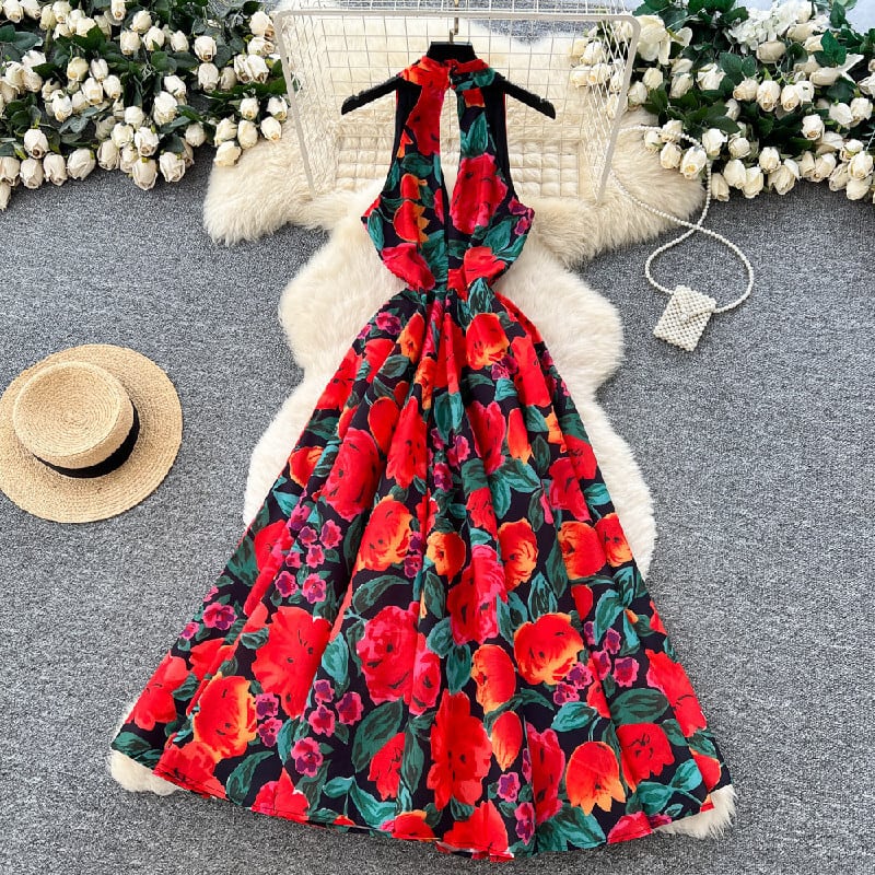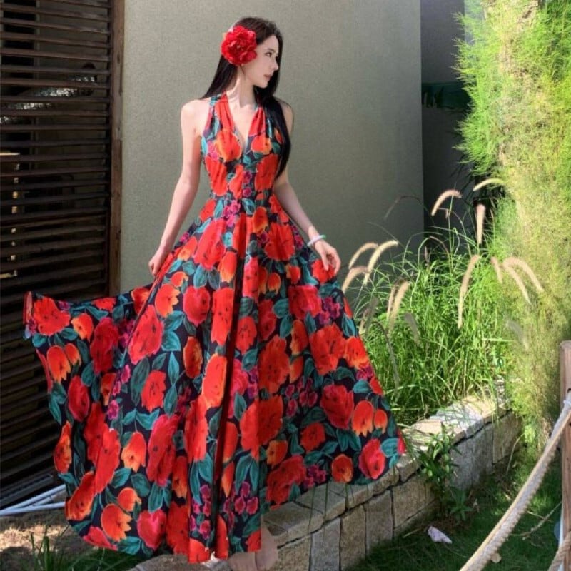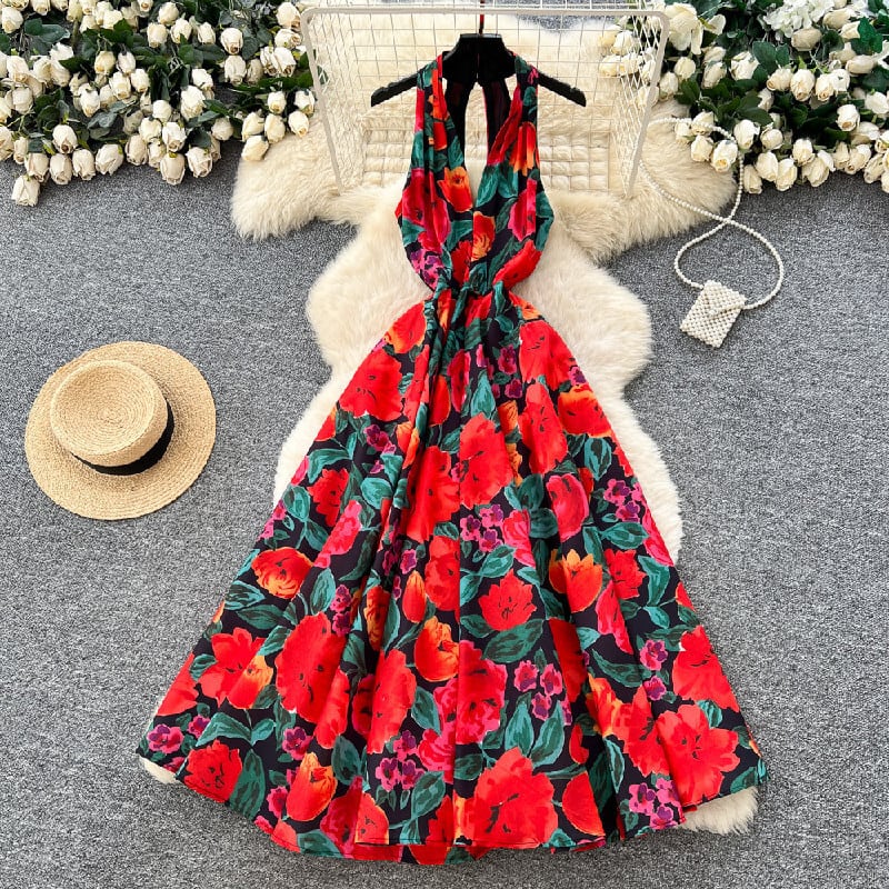 【SummerVacationシリーズ】ワンピース Vネック 花柄 プリント 鮮やか 視線集中 S M L