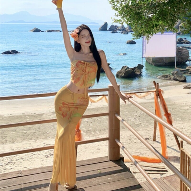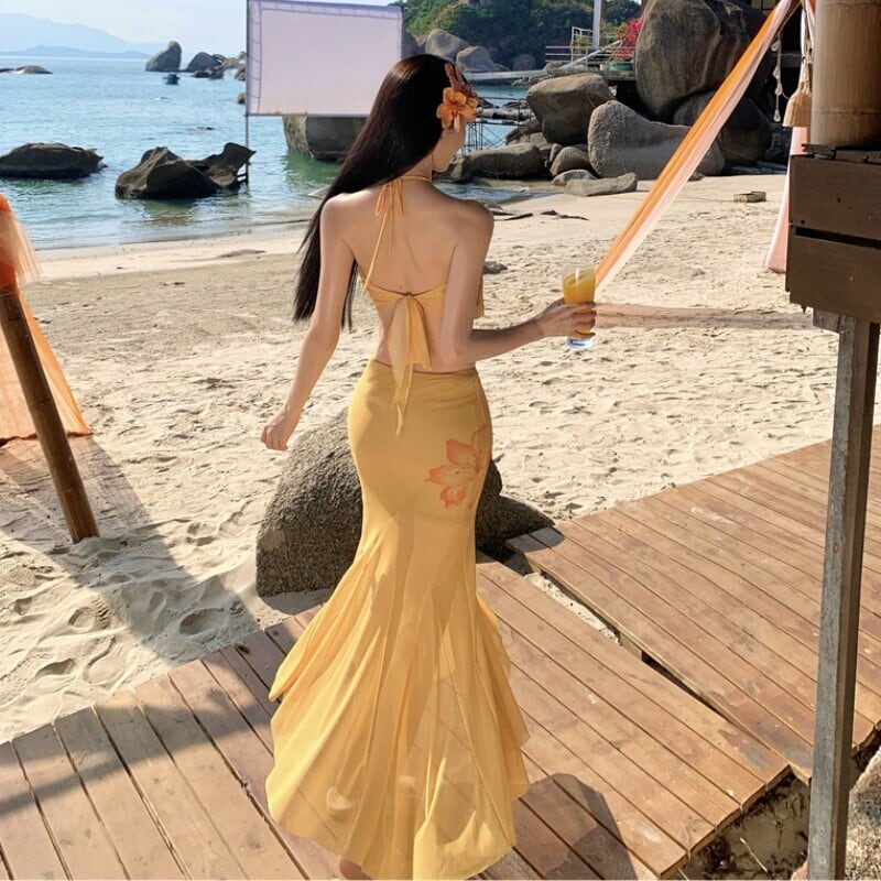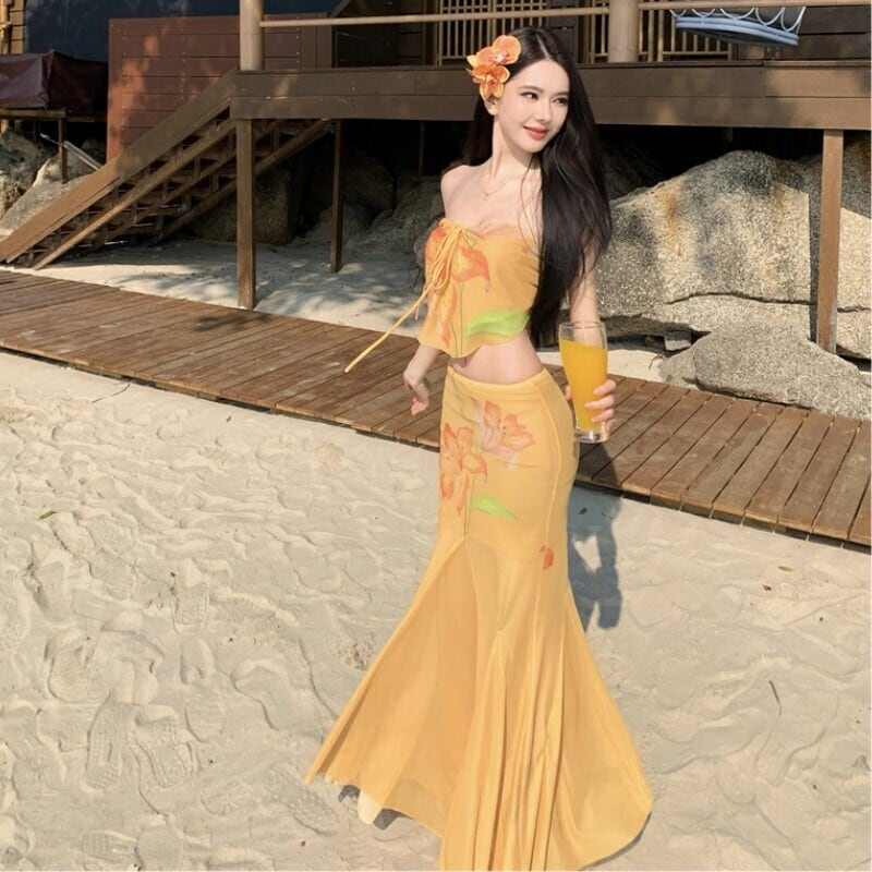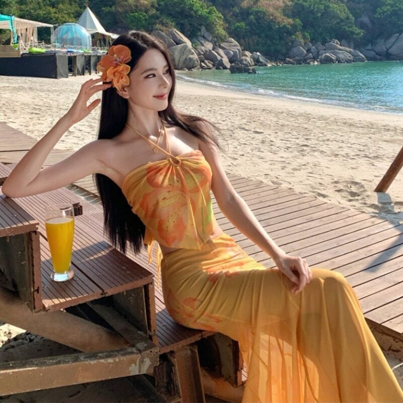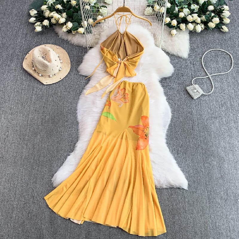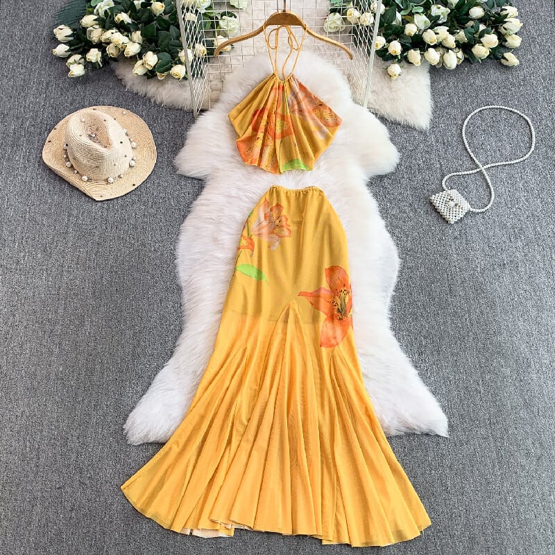 【SummerVacationシリーズ】2点セット プリントチュール ホルターネック タンクトップ +スカート イエロー