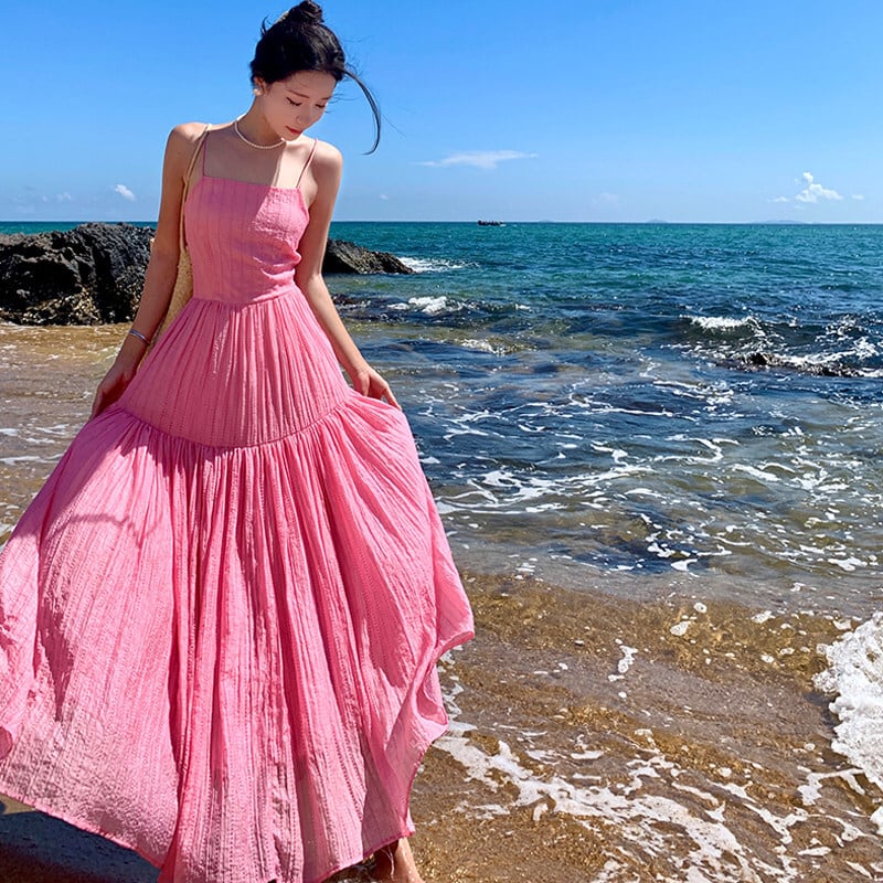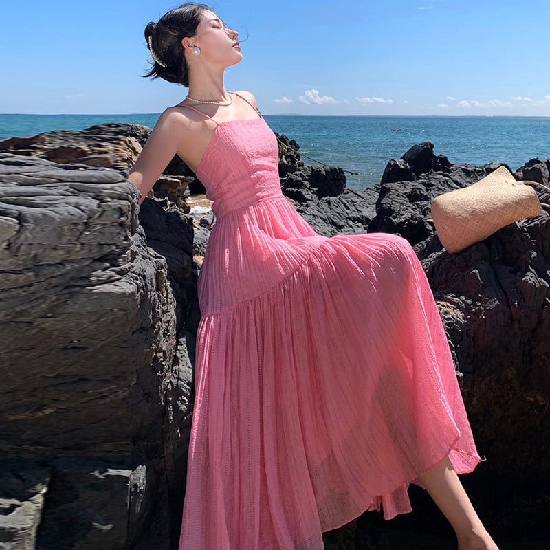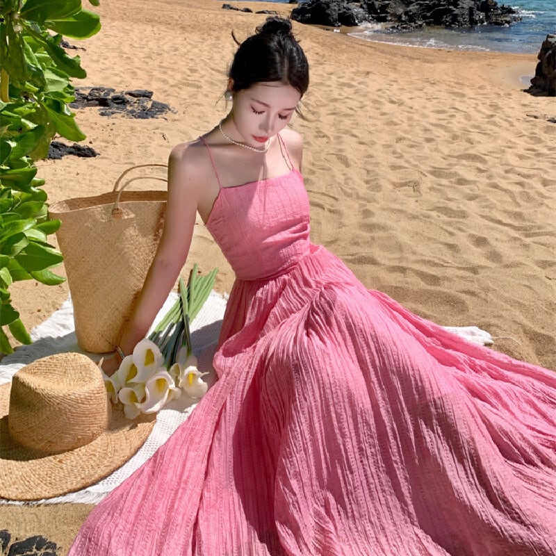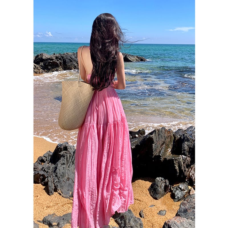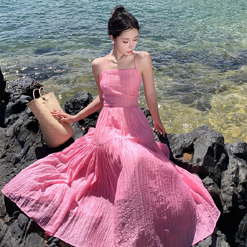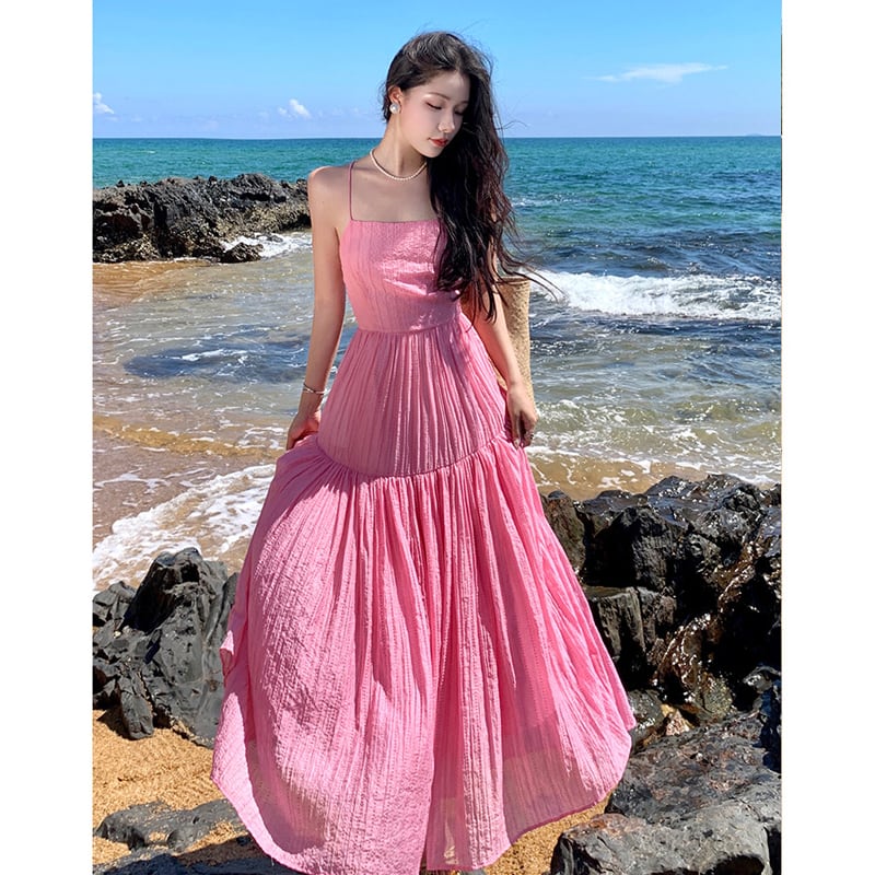 【SummerVacationシリーズ】ワンピース バックレス 無地 海 ピンク S M L