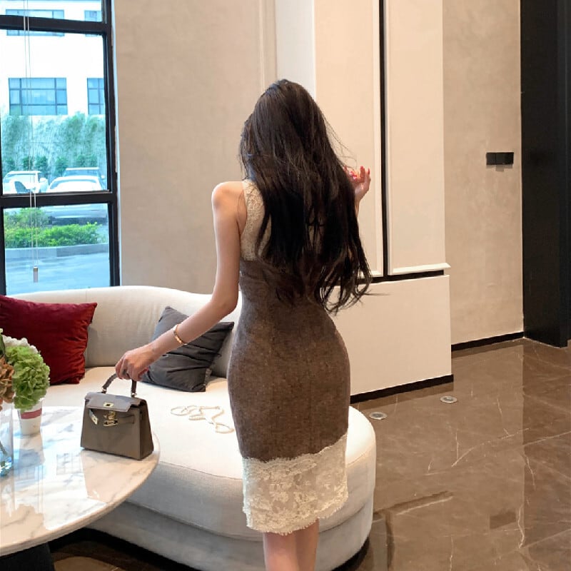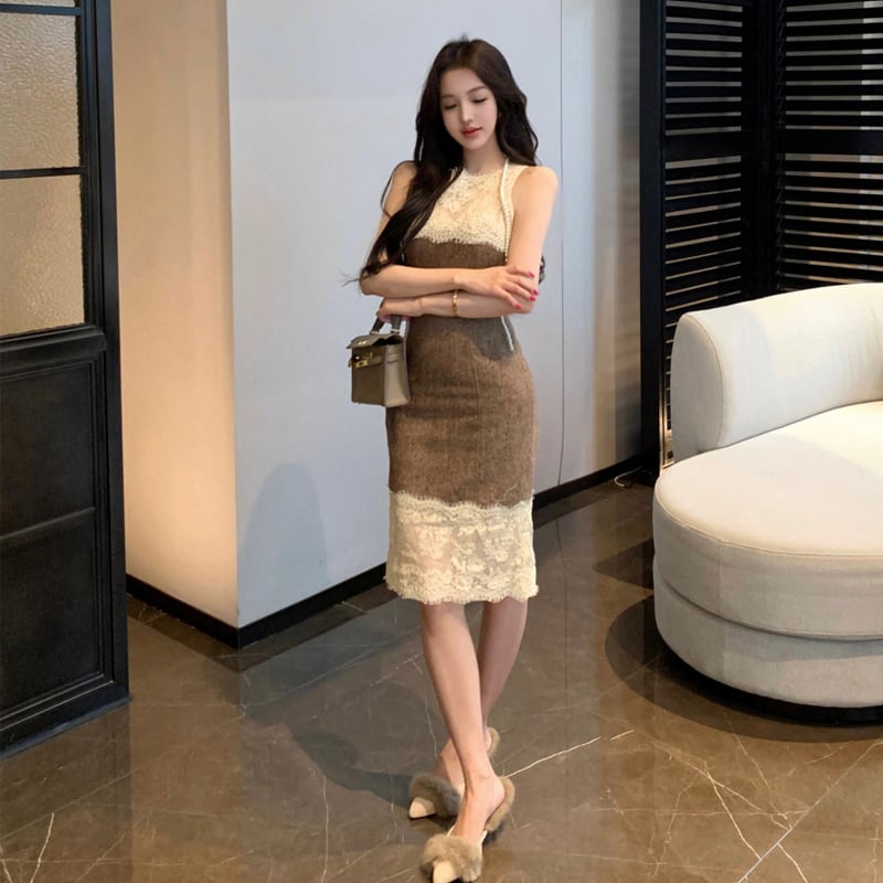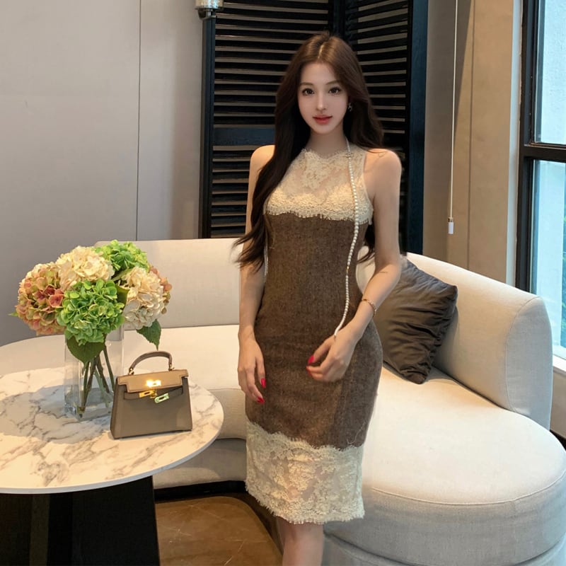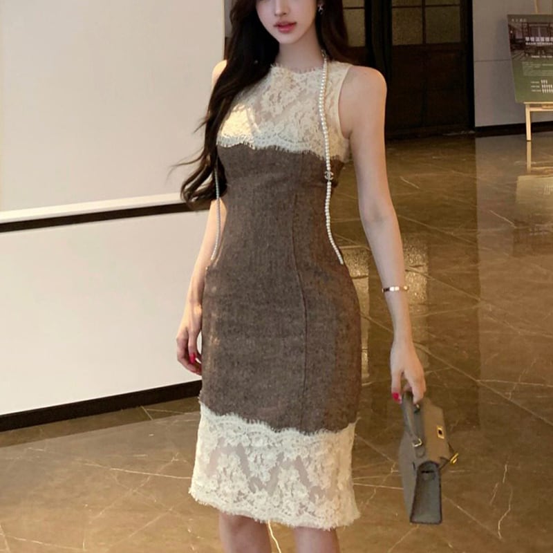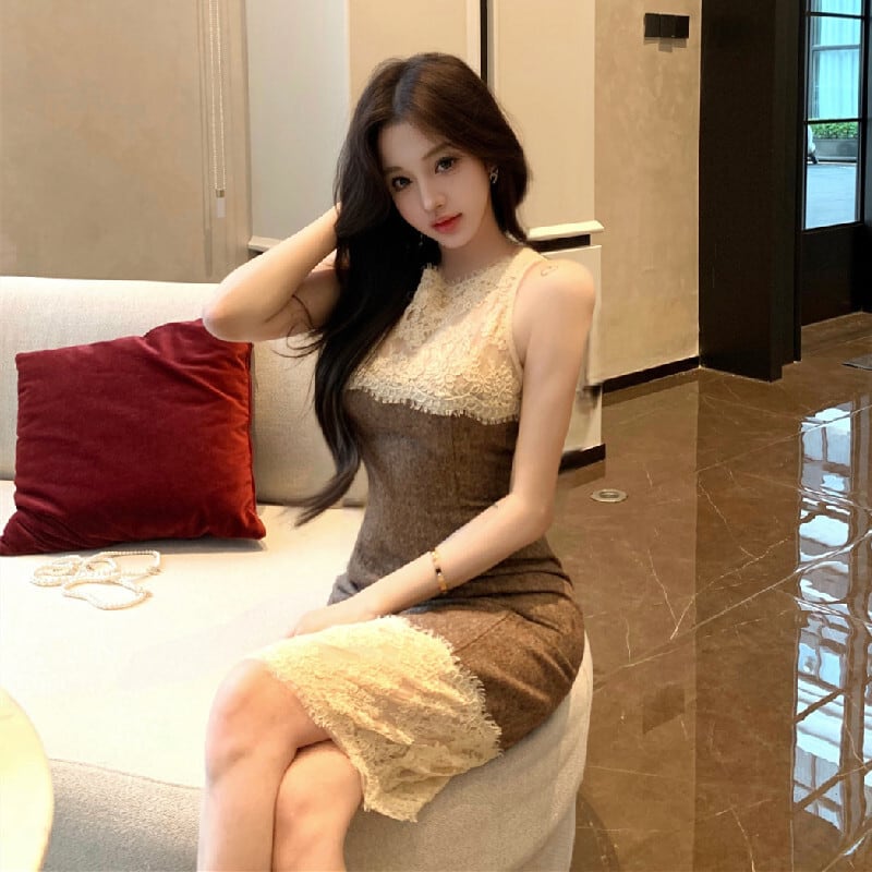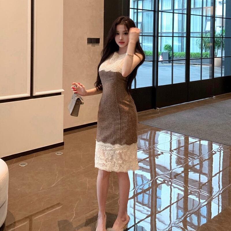 ワンピース ノースリーブ レース 気質溢れる デート ブラウン S M L