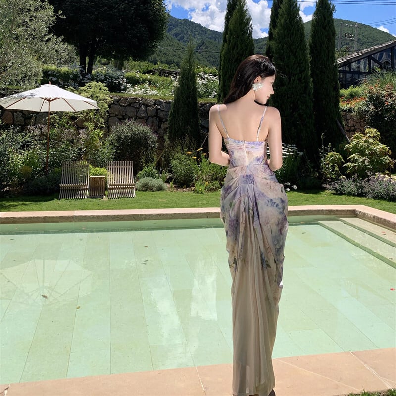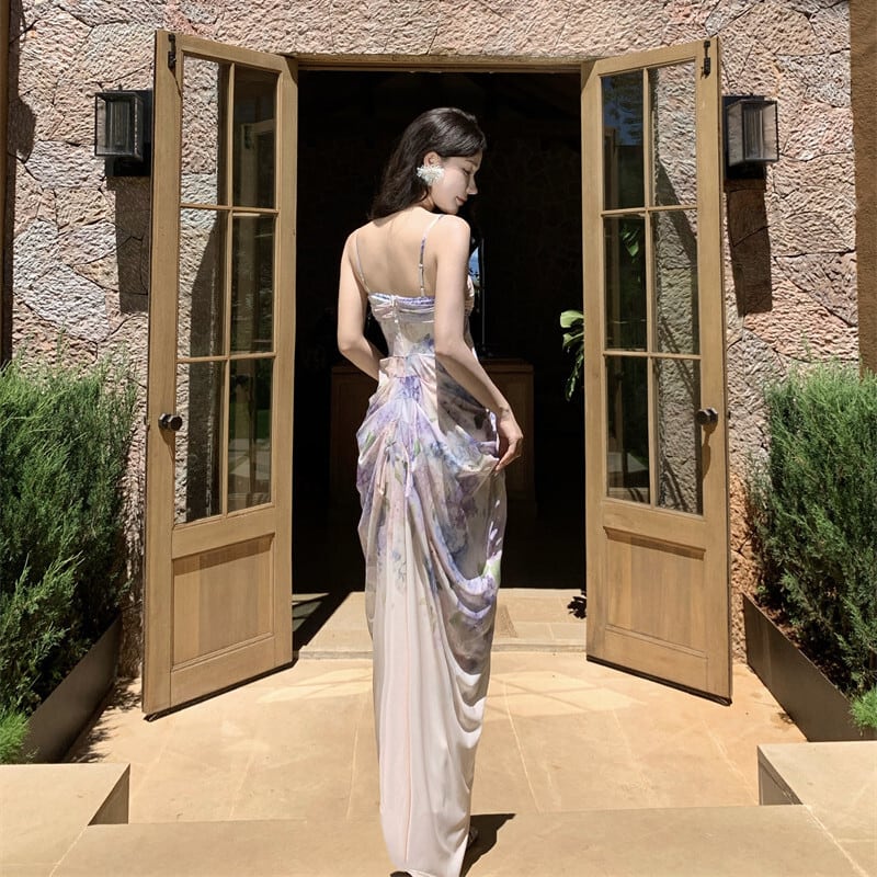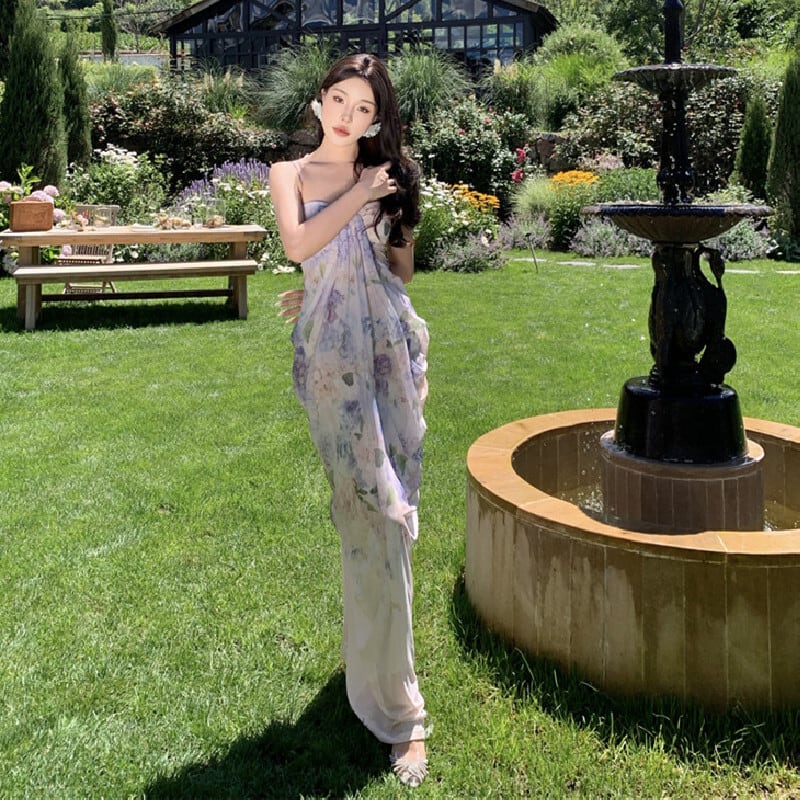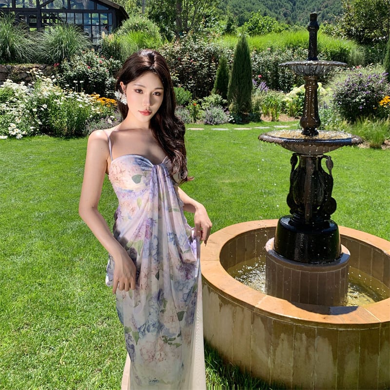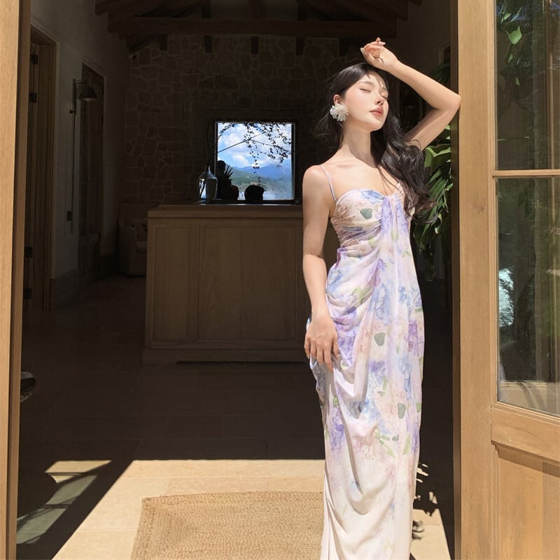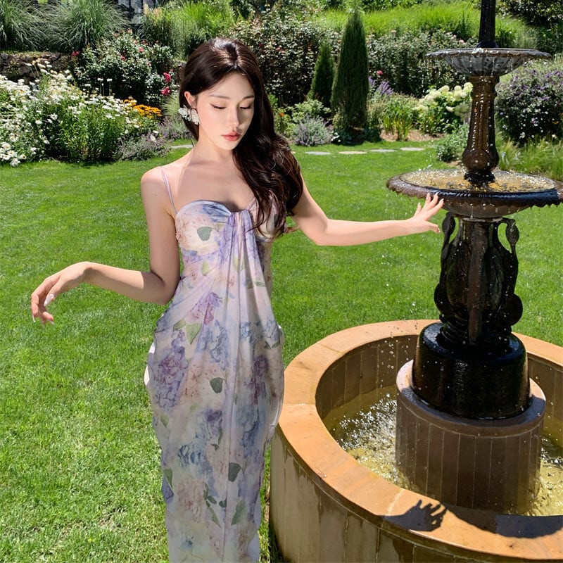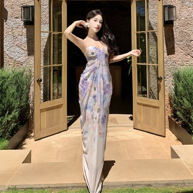 【SummerVacationシリーズ】ワンピース 花柄 リゾート風 一目惚れ ライトパープル S M L