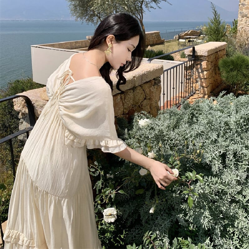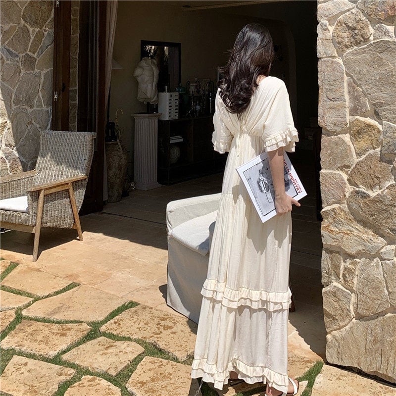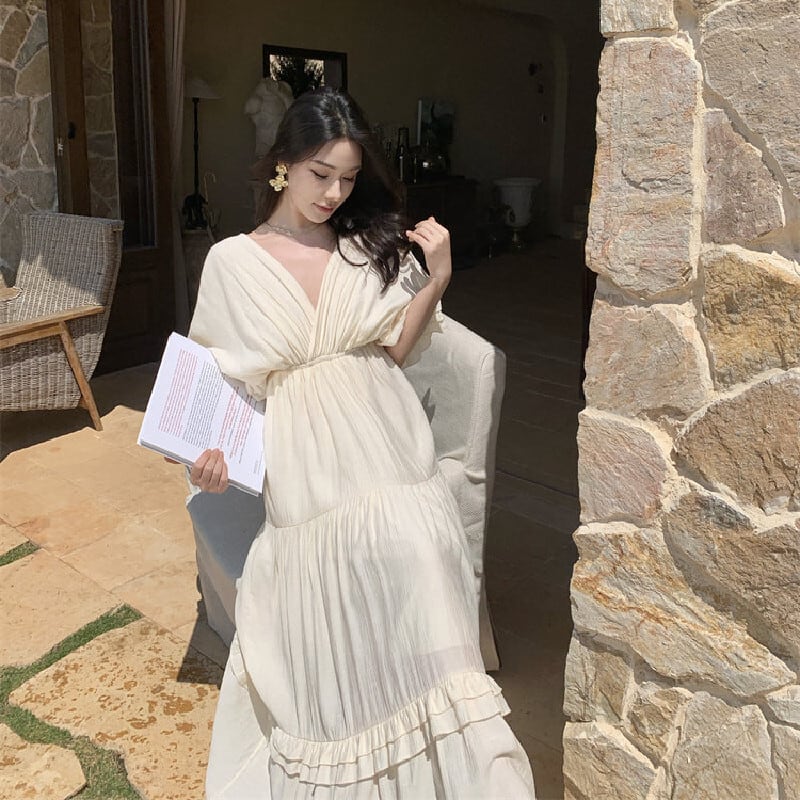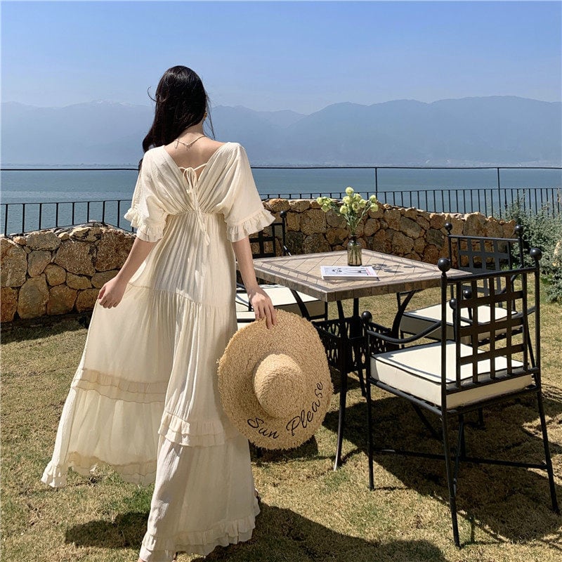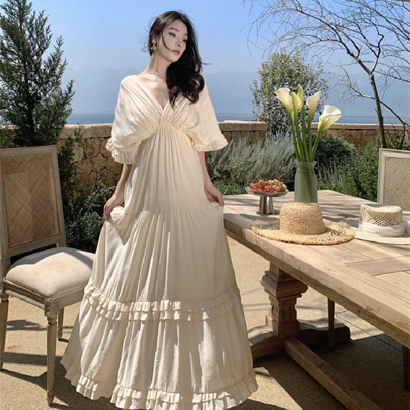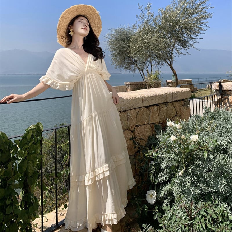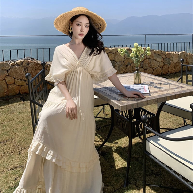 【SummerVacationシリーズ】ワンピース Vネック ゆるい 気質溢れる ベージュ S M L