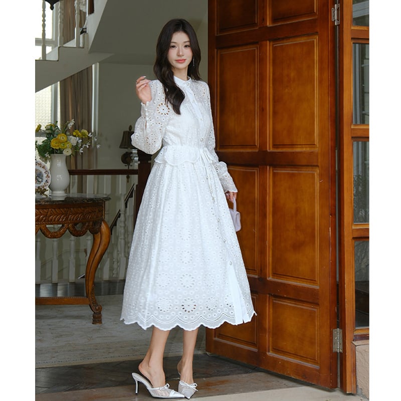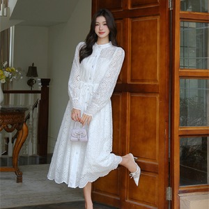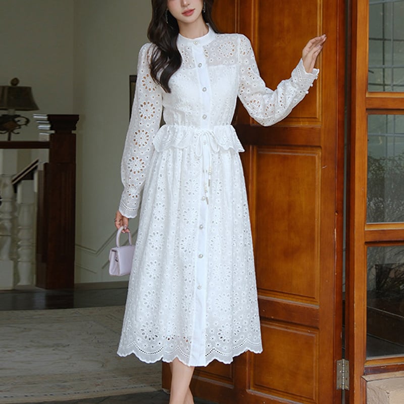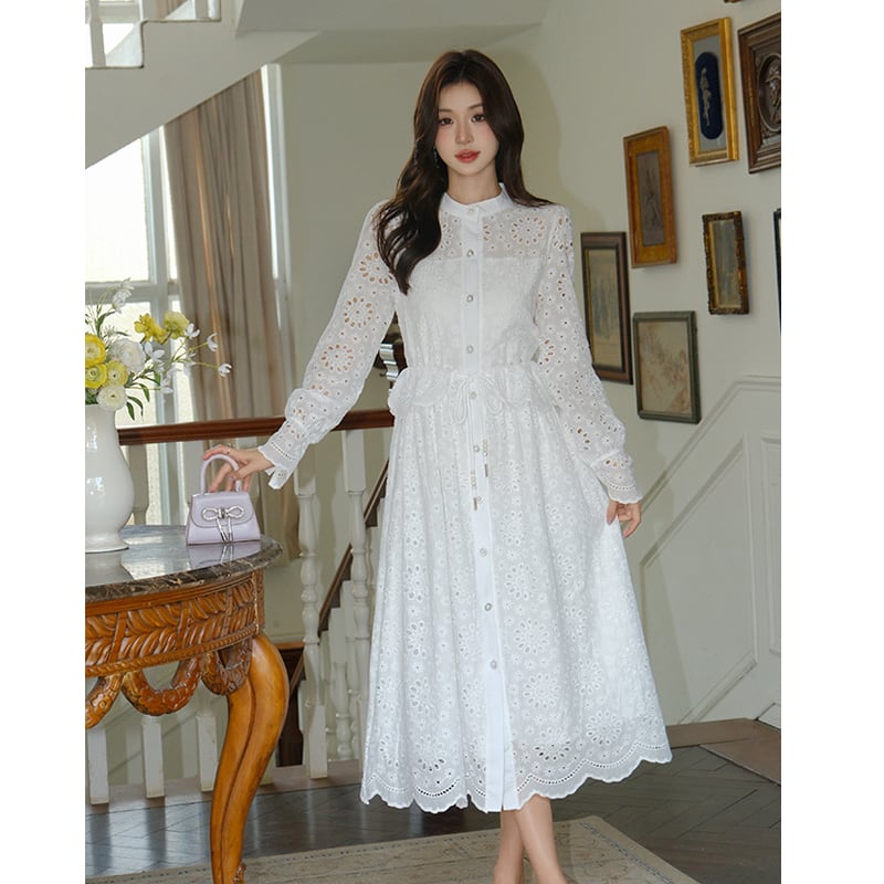 ワンピース 刺繡 エレガント 長袖 シングルブレスト ホワイト S M L XL