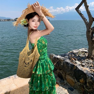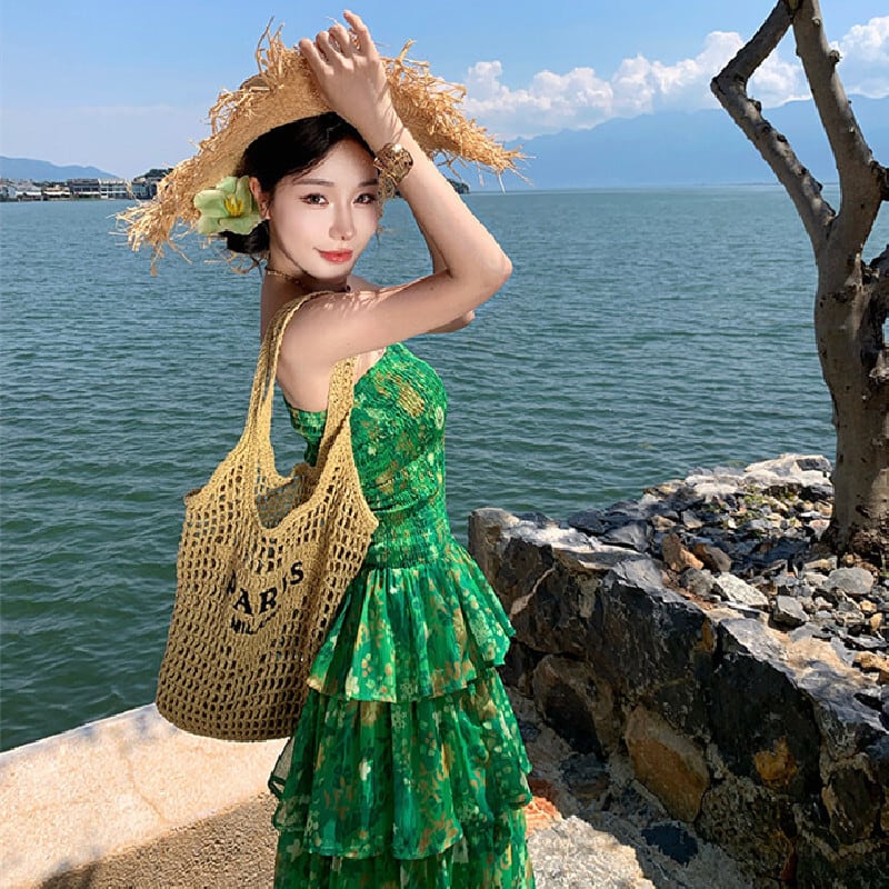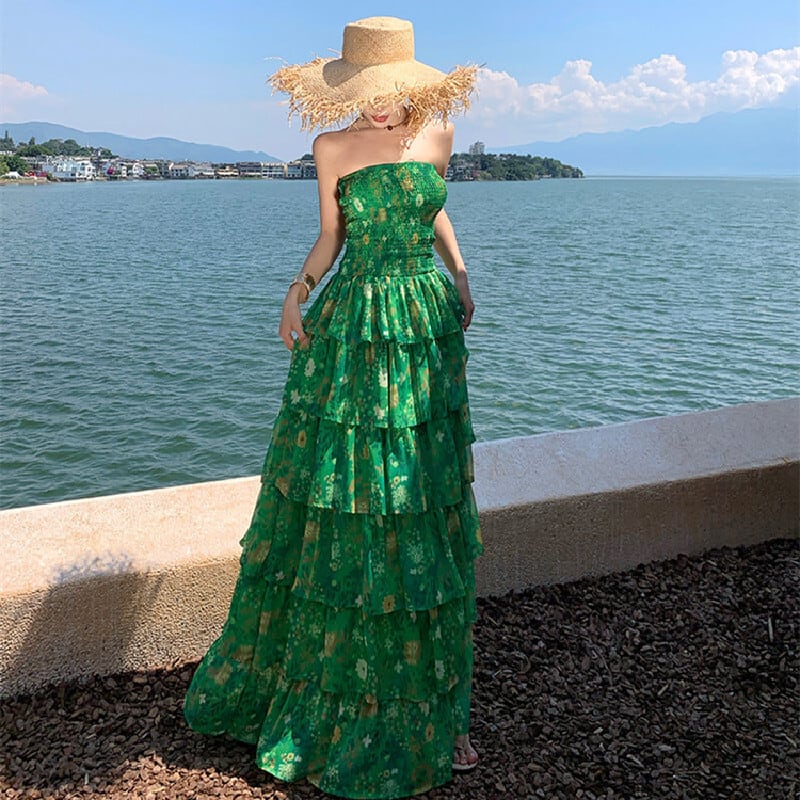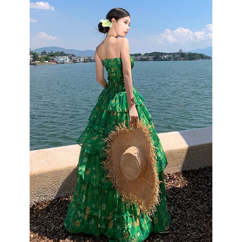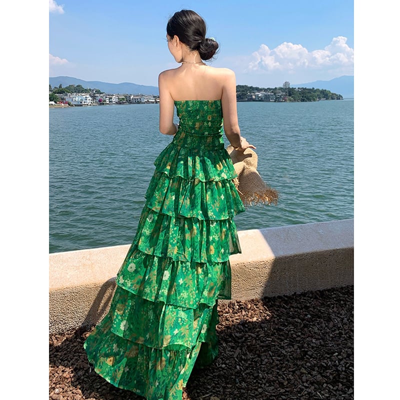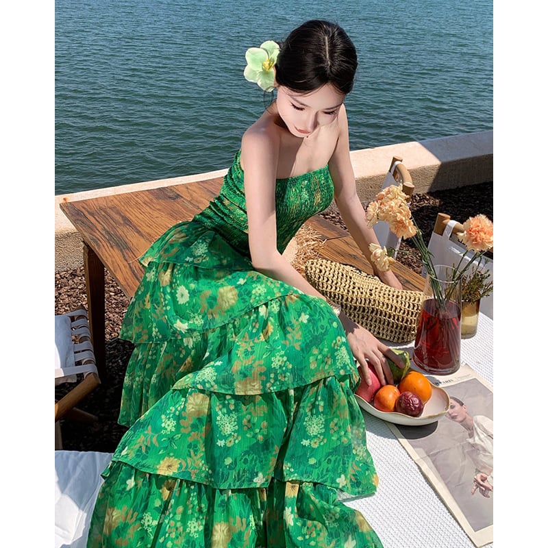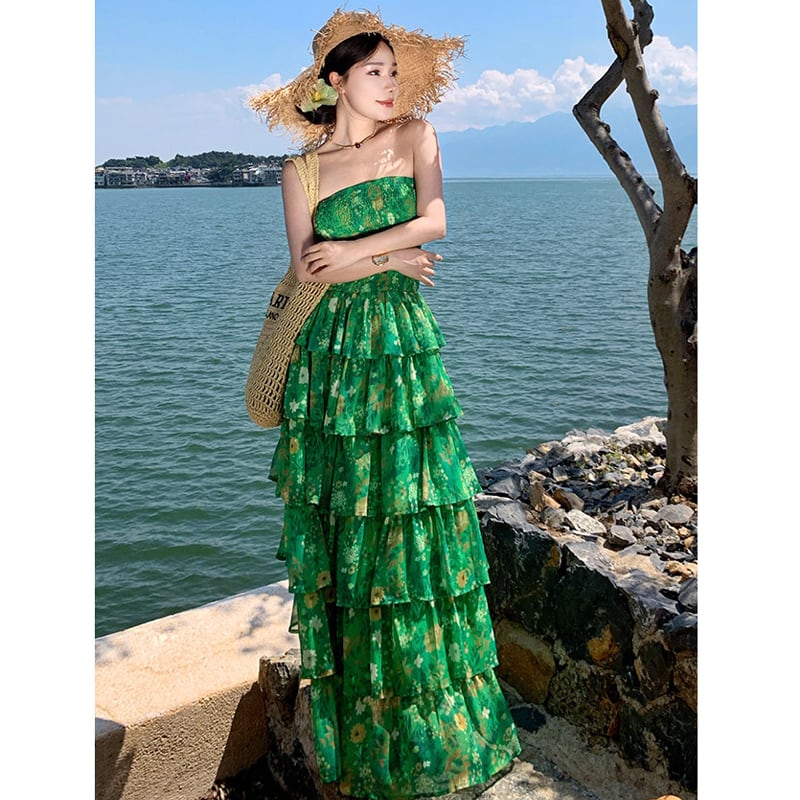 【SummerVacationシリーズ】ティアードワンピース 強い印象 花柄 グリーン S M L