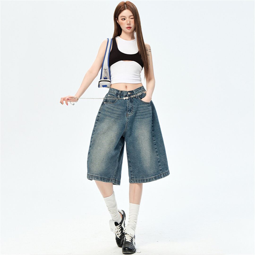 【JXシリーズ】ボトムス デニムパンツ ハイウエスト 5分丈 リラックス ブルー XS S M L XL