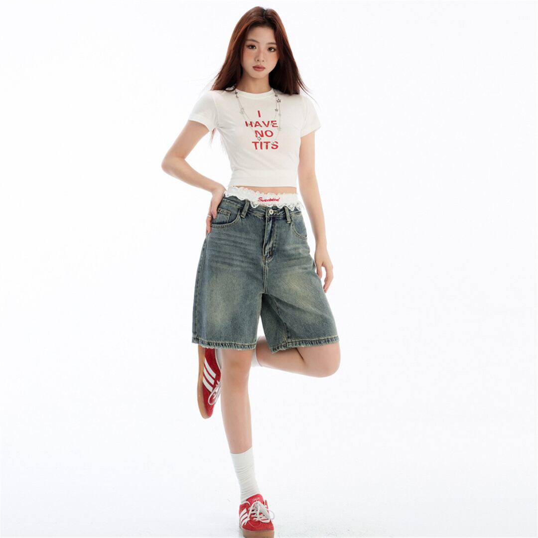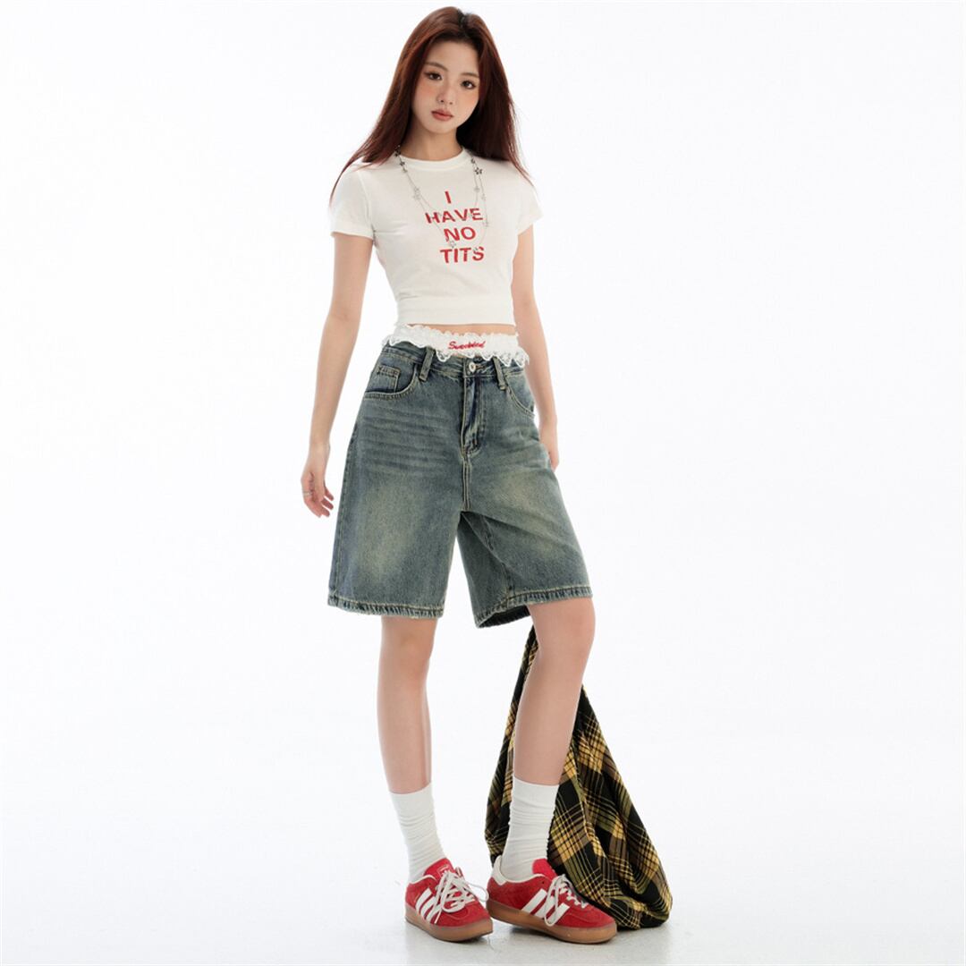 【JXシリーズ】ボトムス デニムパンツ ハイウエスト 細見え 膝丈 ブルー XS S M L XL