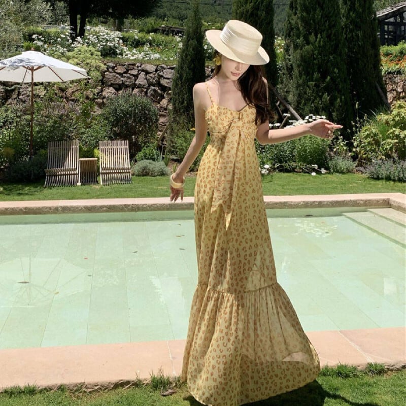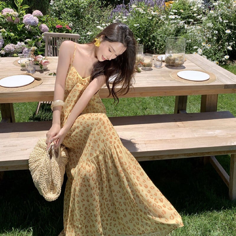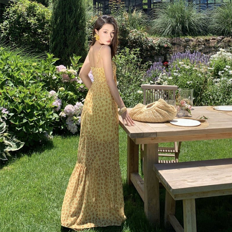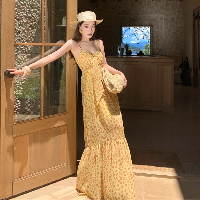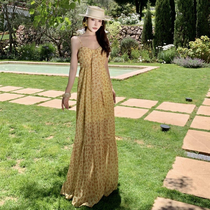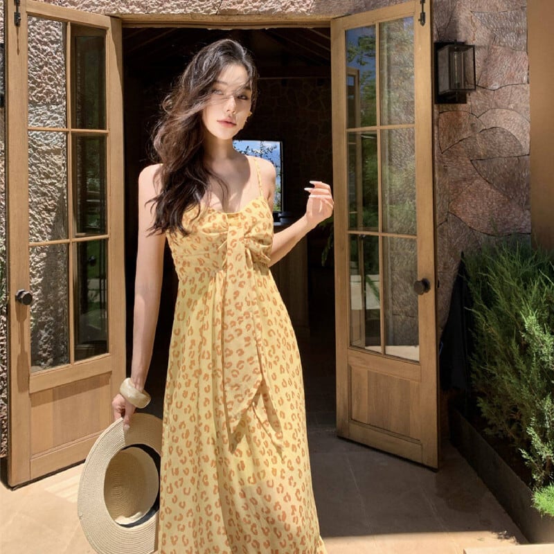 【SummerVacationシリーズ】キャミソールワンピース レオパード柄 シフォン イエロー S M L
