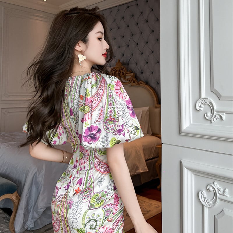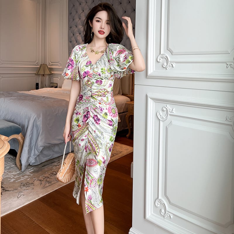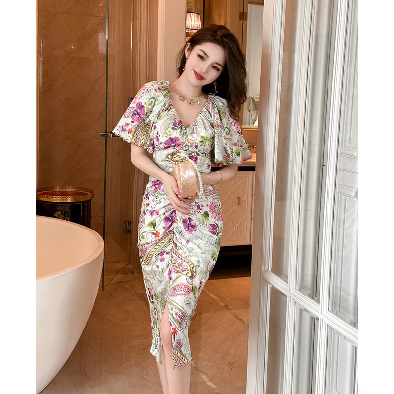 【夕暮薔薇シリーズ】ワンピース Vネック 前スリット 美人度アップ S M L XL