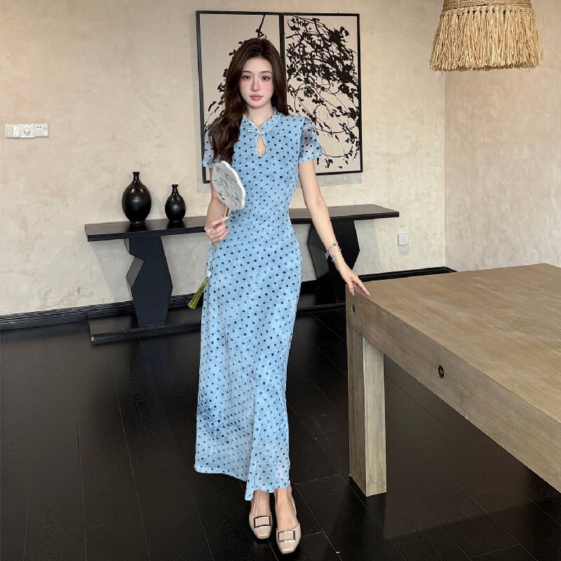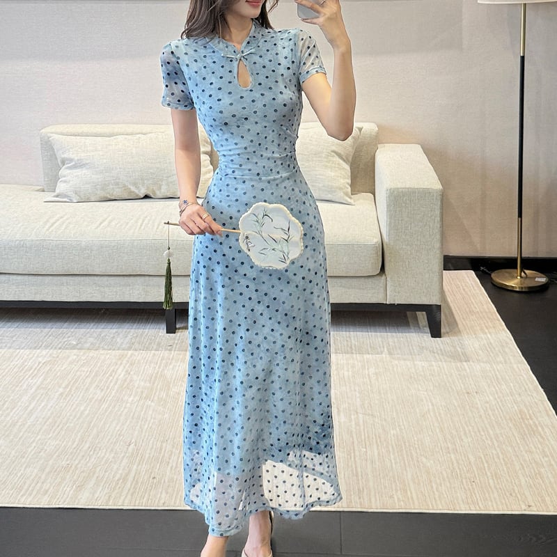 ワンピース チャイナ風 ドット柄 気質溢れる 水玉模様 ブルー S M L XL