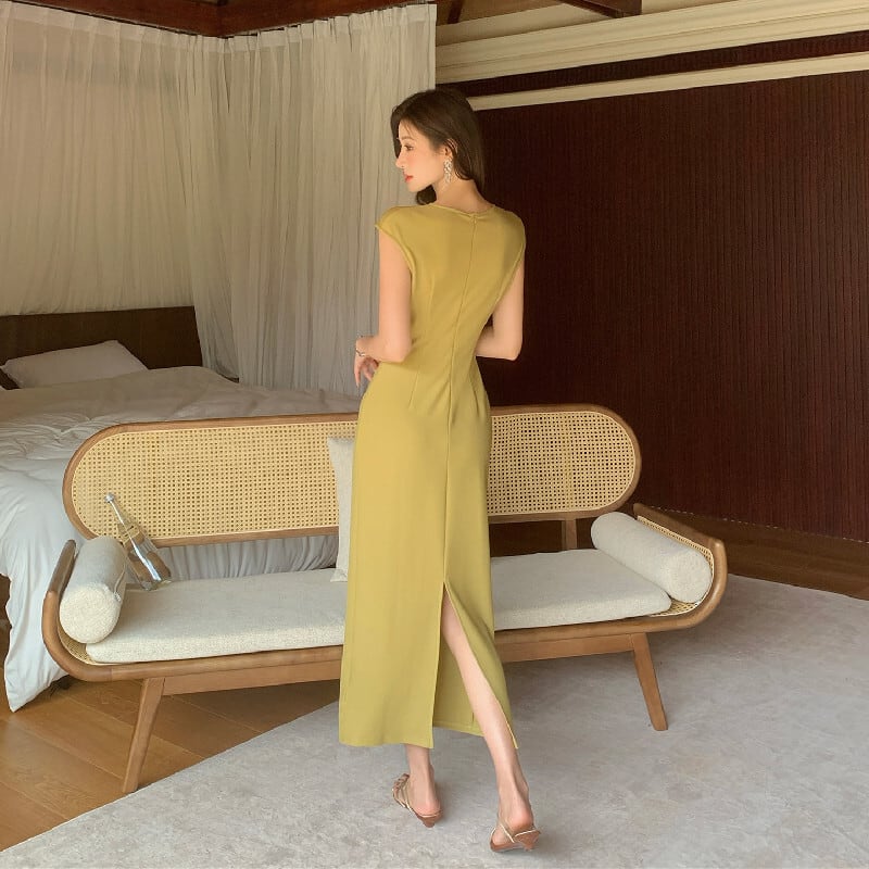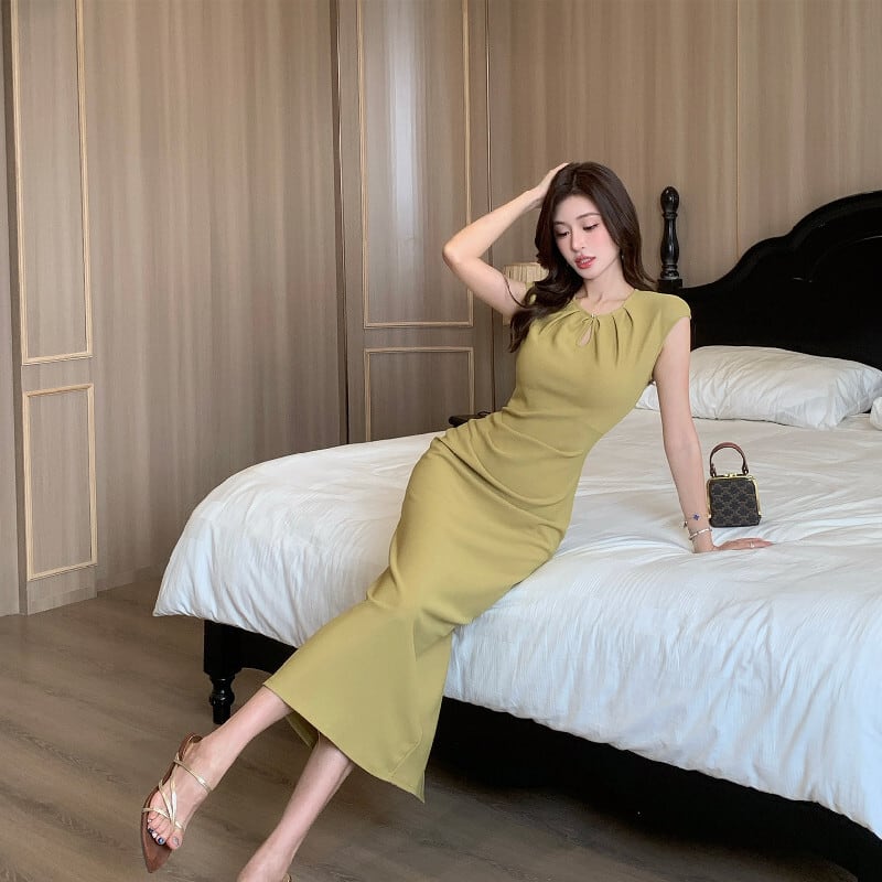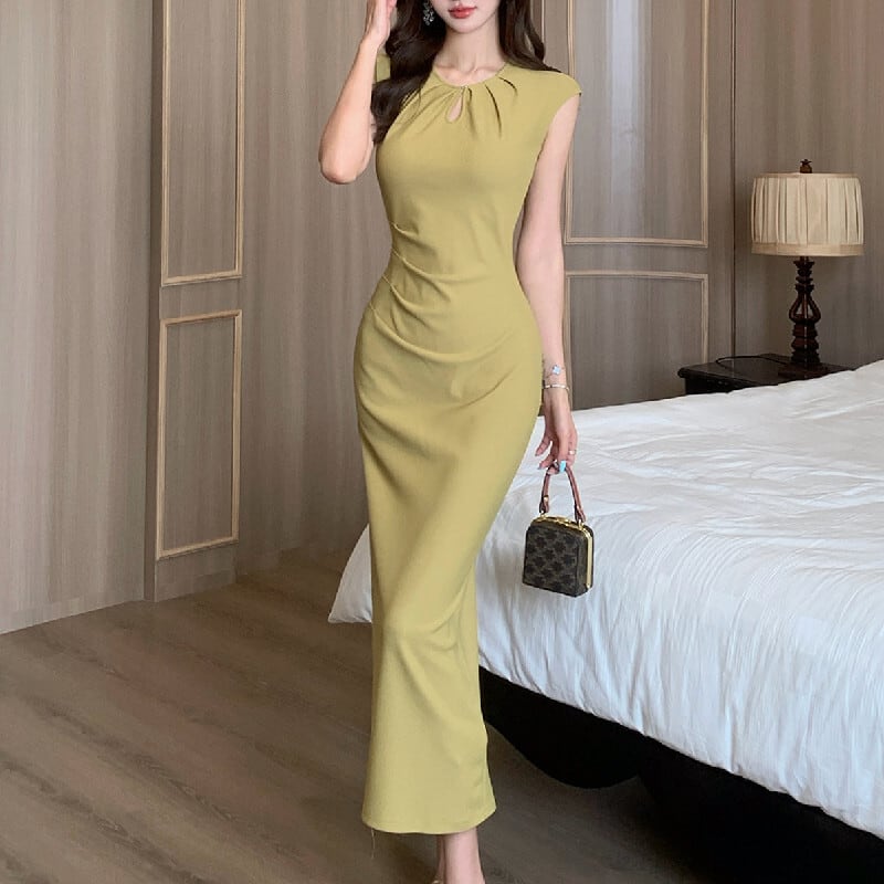 ワンピース ノースリーブ フェミニン 無地 くびれ強調 S M L XL