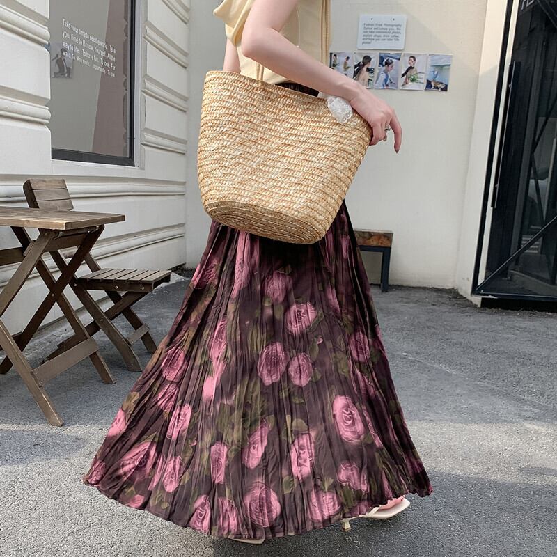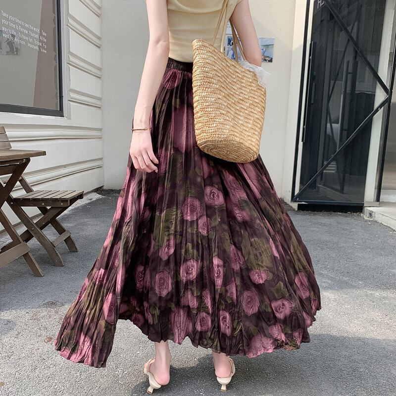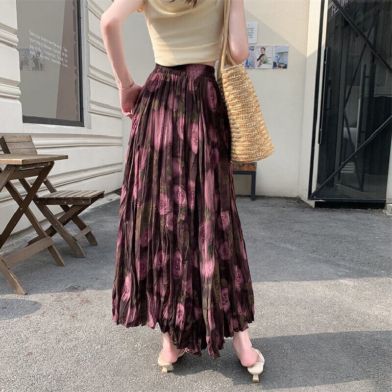ボトムス スカート 大振り 不規則プリーツ ロングスカート バラ柄 パープル