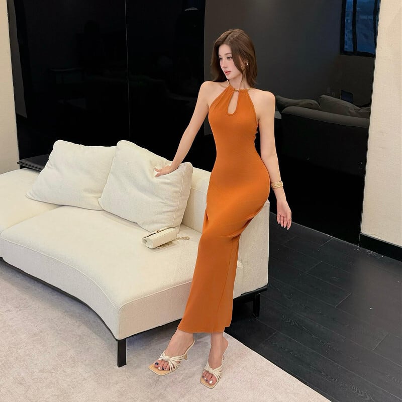 2colors ワンピース ホルターネック セクシー バックスリット オレンジ ブラック