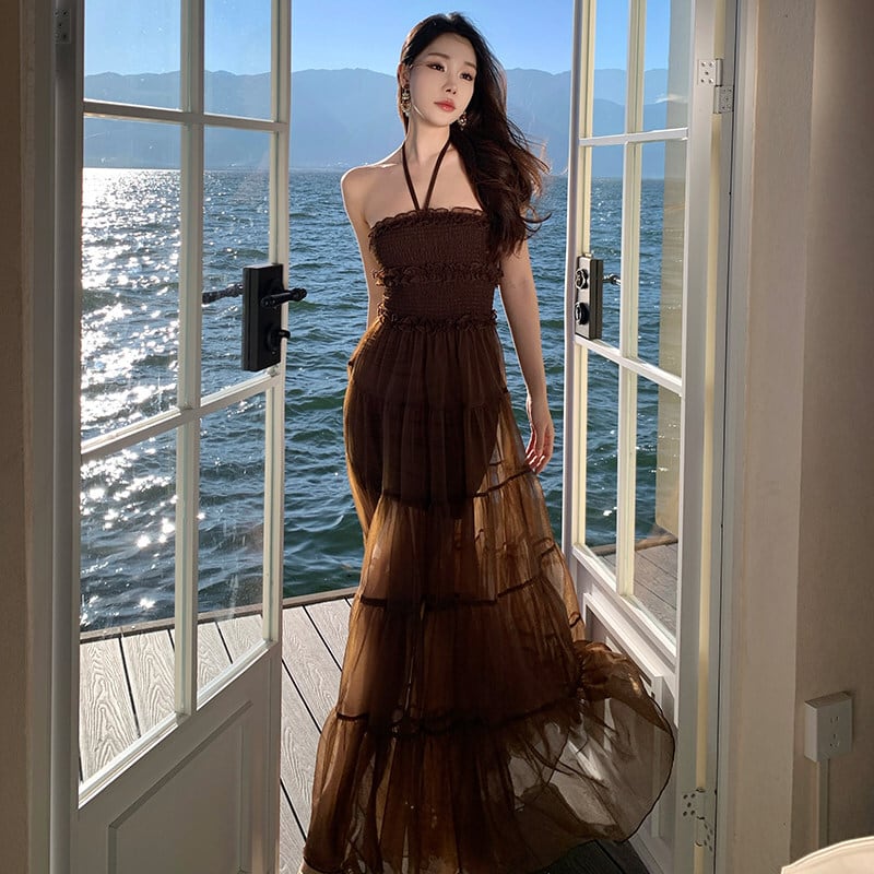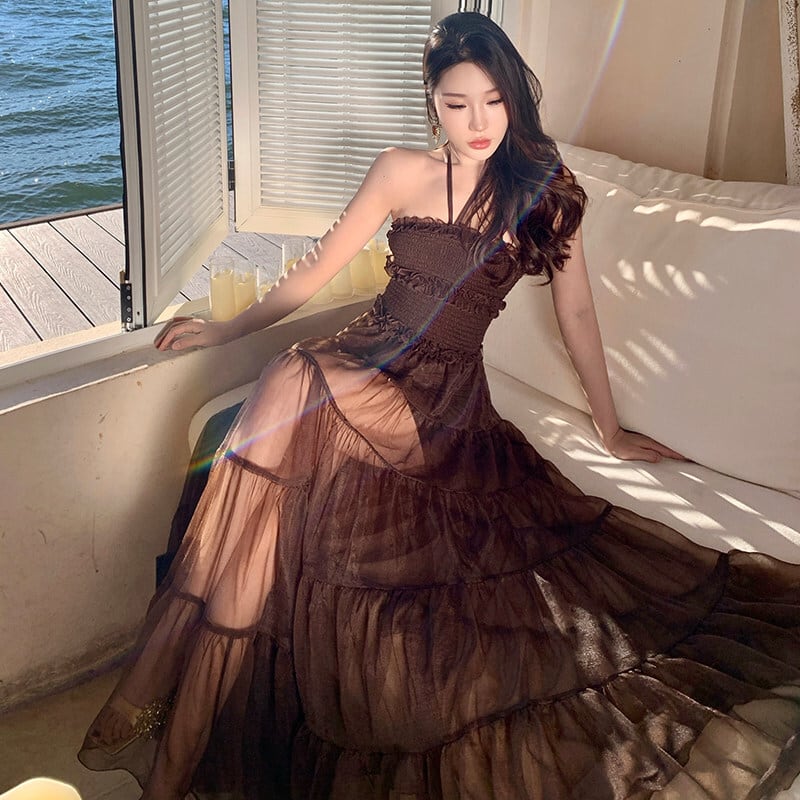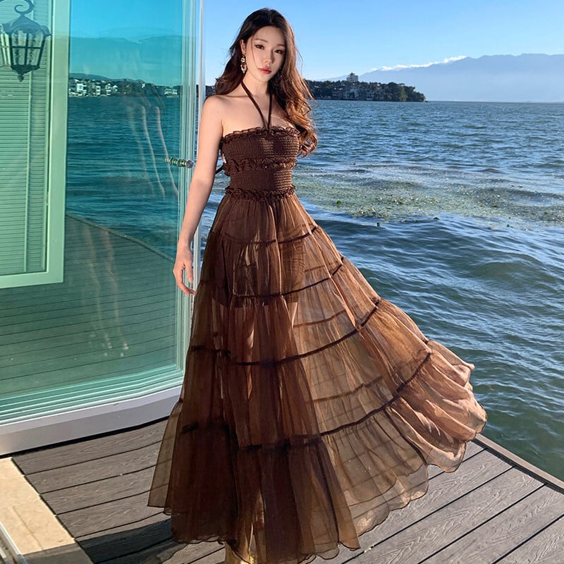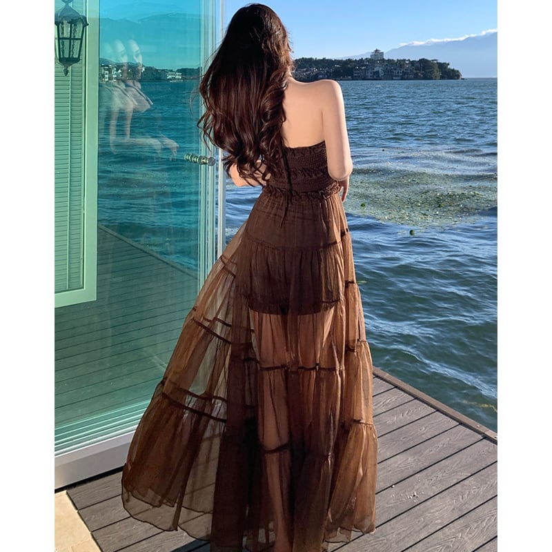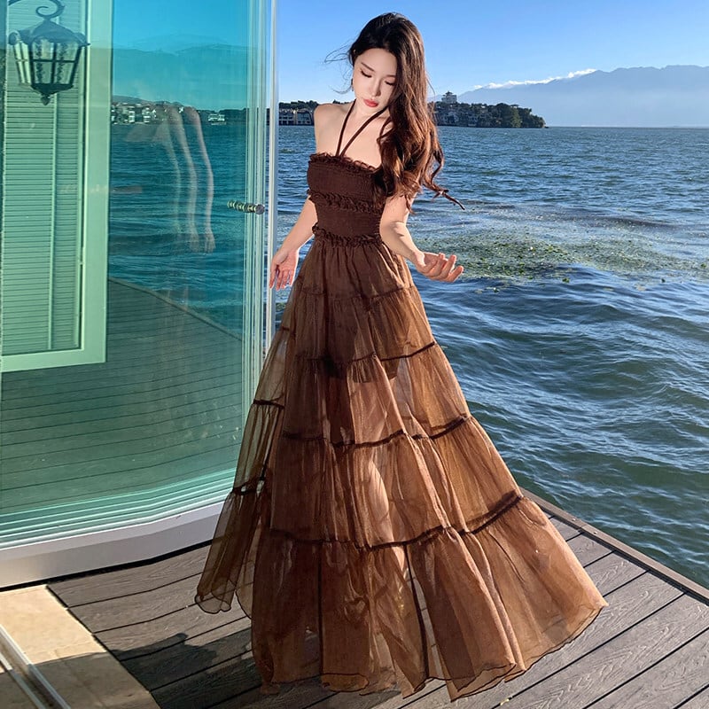 【SummerVacationシリーズ】ワンピース メッシュ 無地 フレア コーヒー色 S M L XL