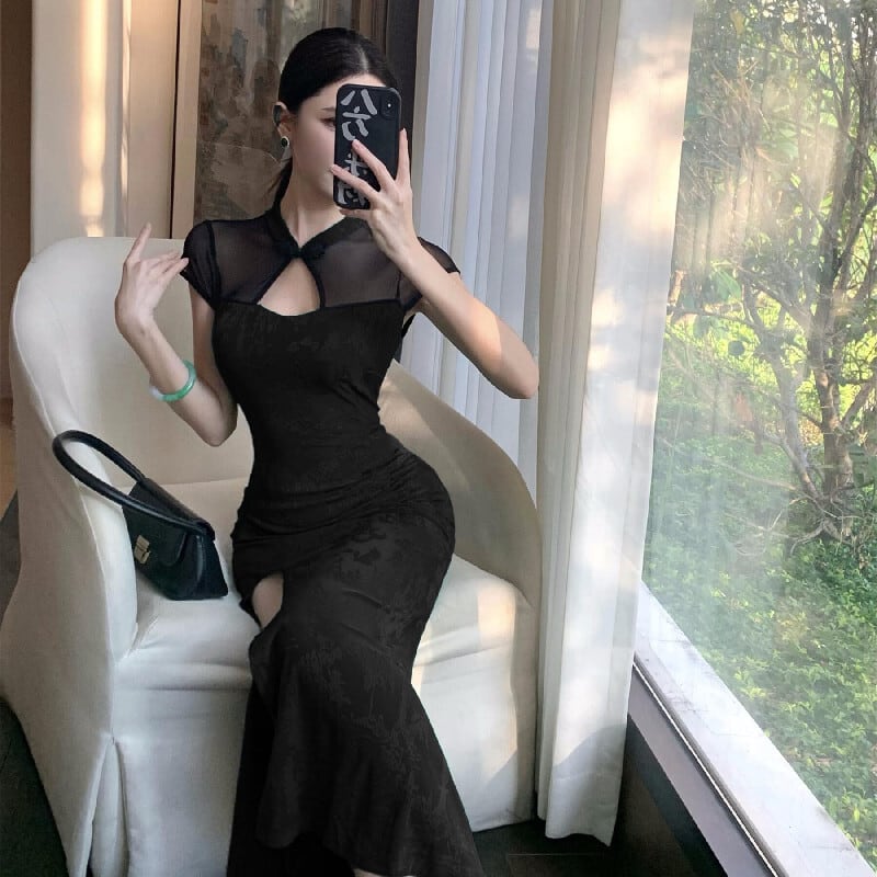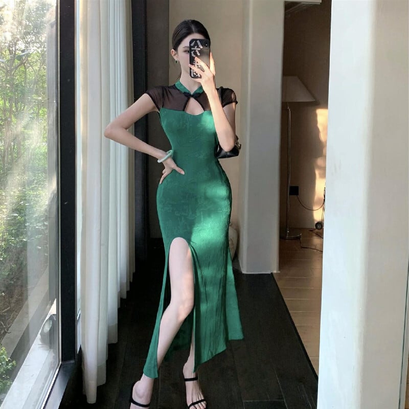 2colors ワンピース チャイナ風 スリット メッシュ グリーン ブラック S M L