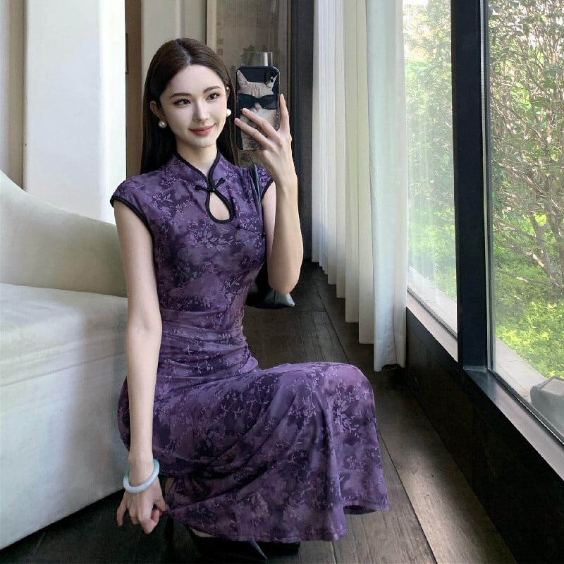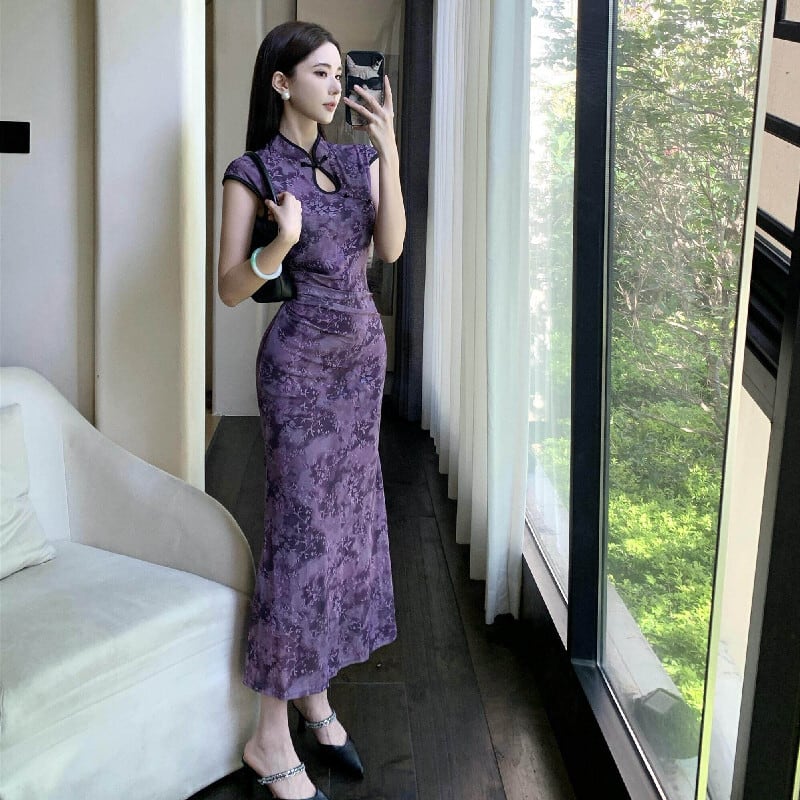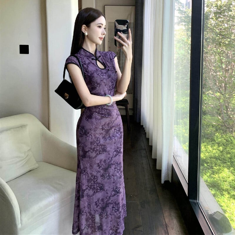 ワンピース チャイナ風 花柄 メッシュ 着まわし抜群 パープル S M L