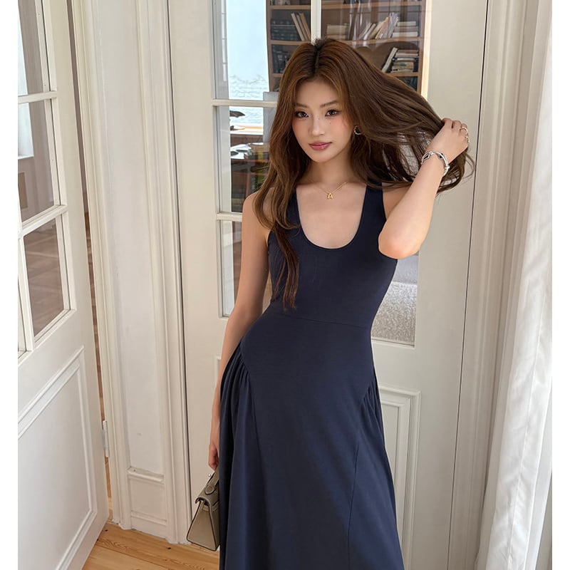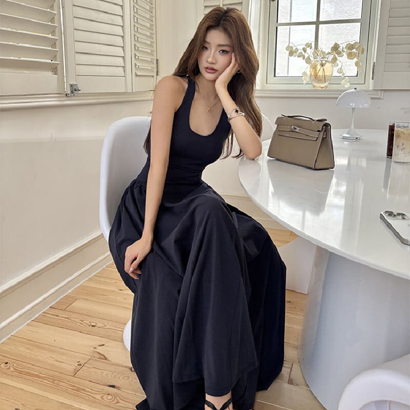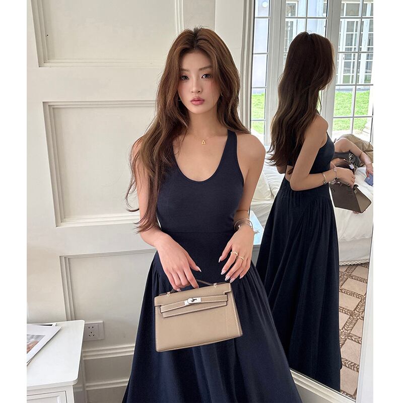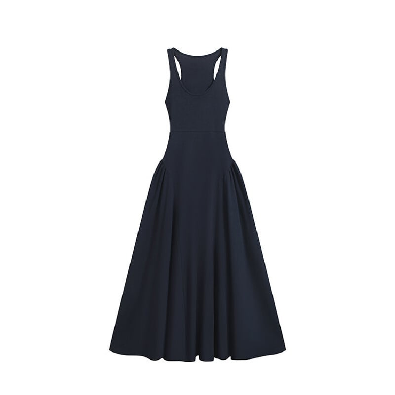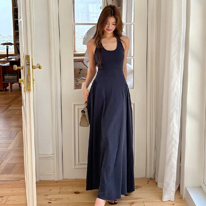 ロングワンピース ウエストオープン 無地 フレアワンピース ダークブルー S M L