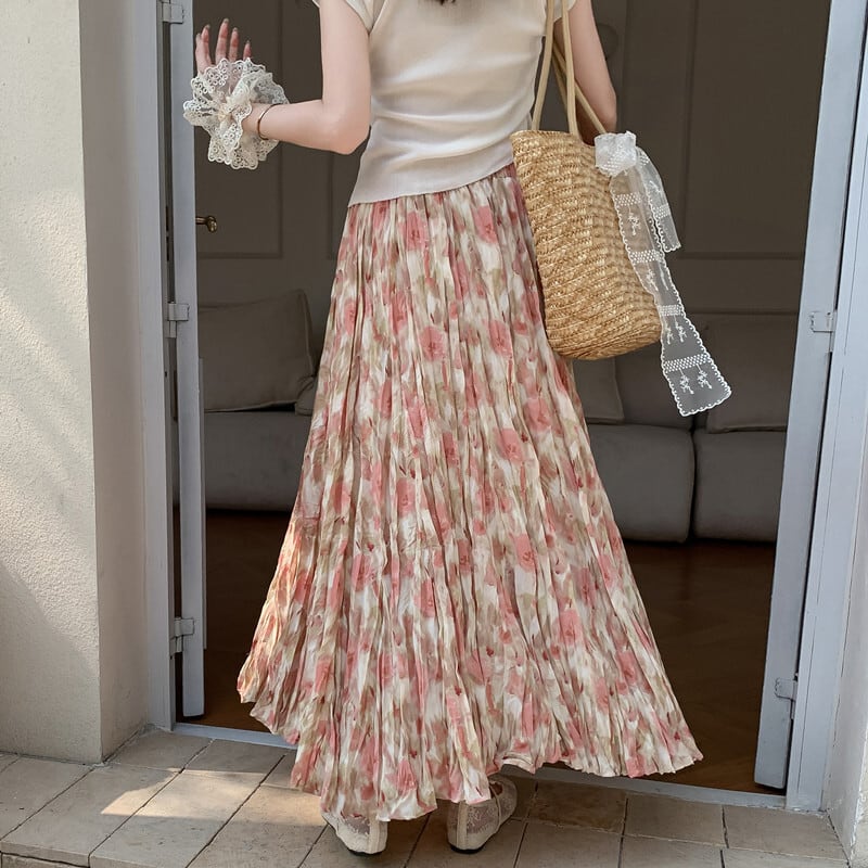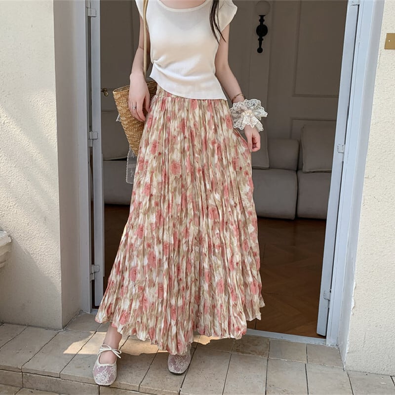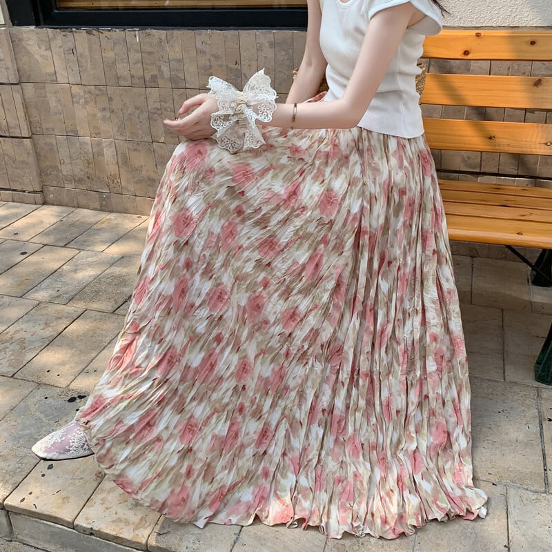 ボトムス スカート 配色 不規則プリーツ ロングスカート バラ柄 ピンク