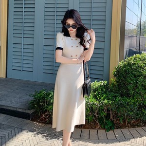 ワンピース 配色 半袖 ハイウエスト レーヨンニット 通勤 ベージュ S M L XL