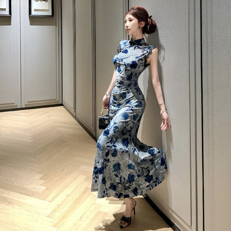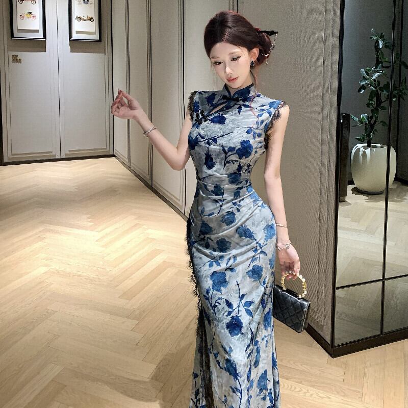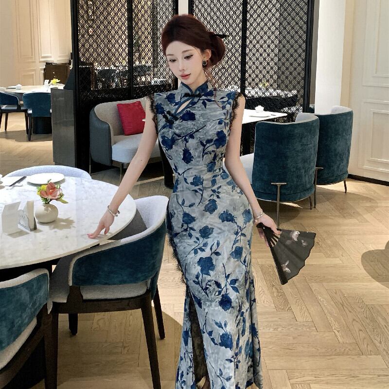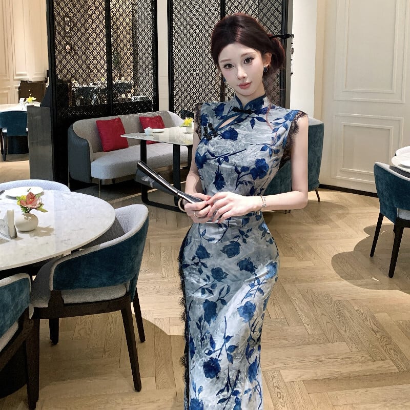 ワンピース チャイナ風 レトロ レース 花柄 スリット ブルー S M L
