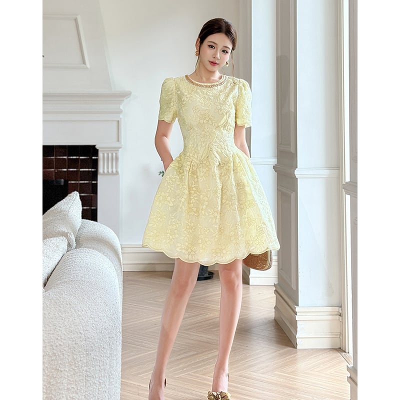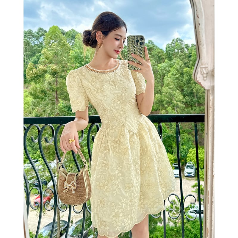 【夕暮薔薇シリーズ】ワンピース 刺繡 スパンコール Aライン ライトイエロー S M L