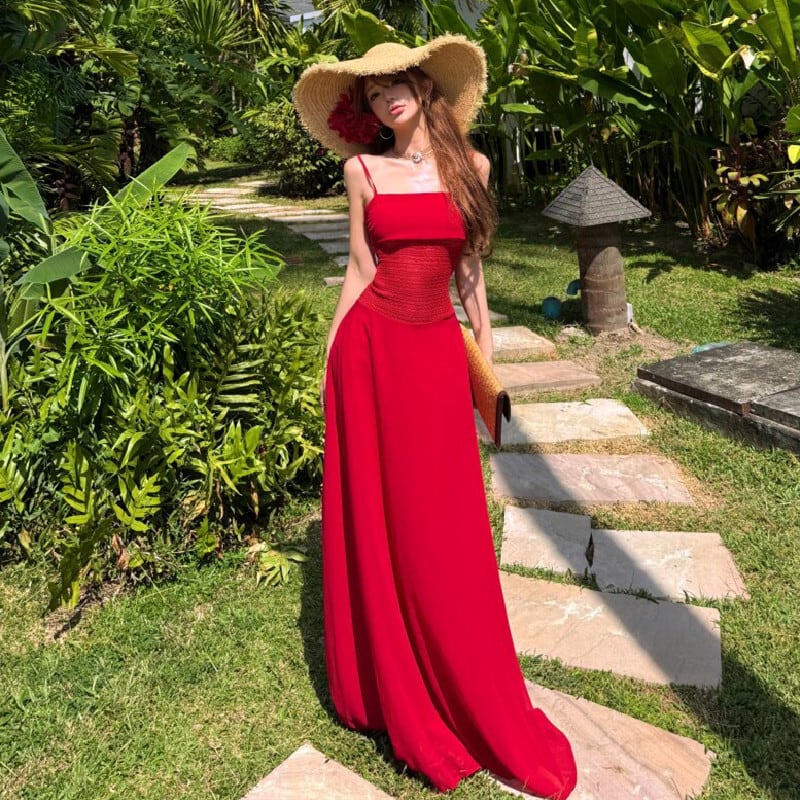 【SummerVacationシリーズ】ワンピース バックリボン ウエスト透け 魅せられる レッド S M L