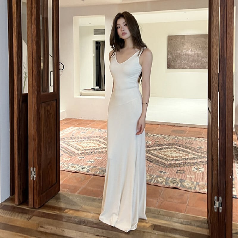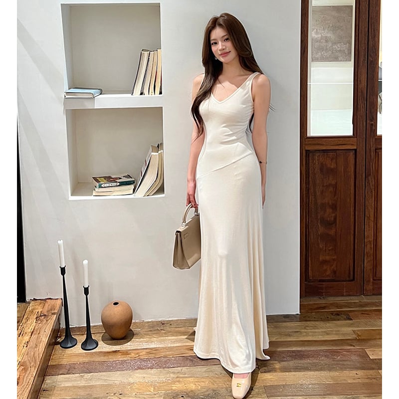 ロングワンピース シンプルデザイン 無地 スタイリッシュ ベージュ S M L