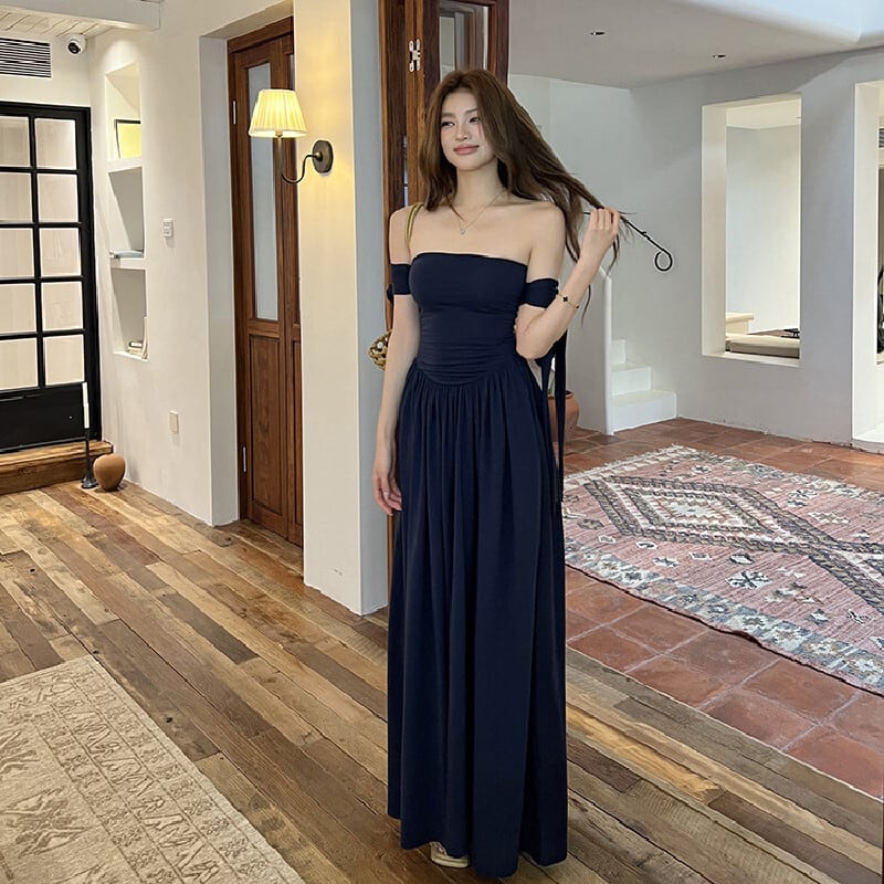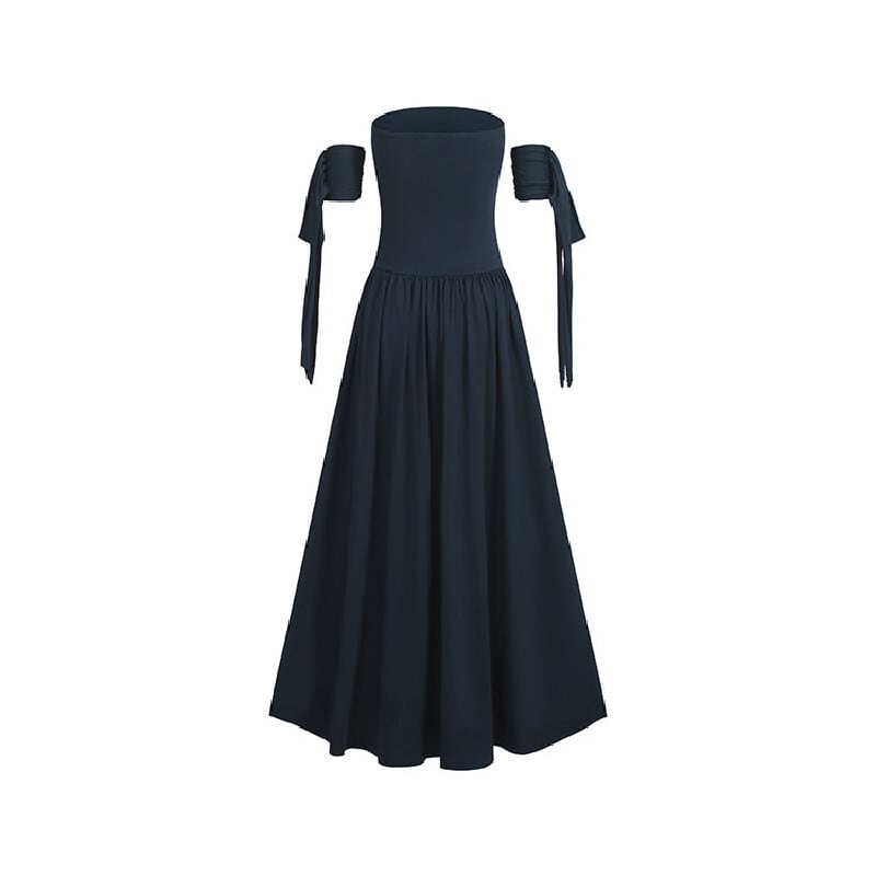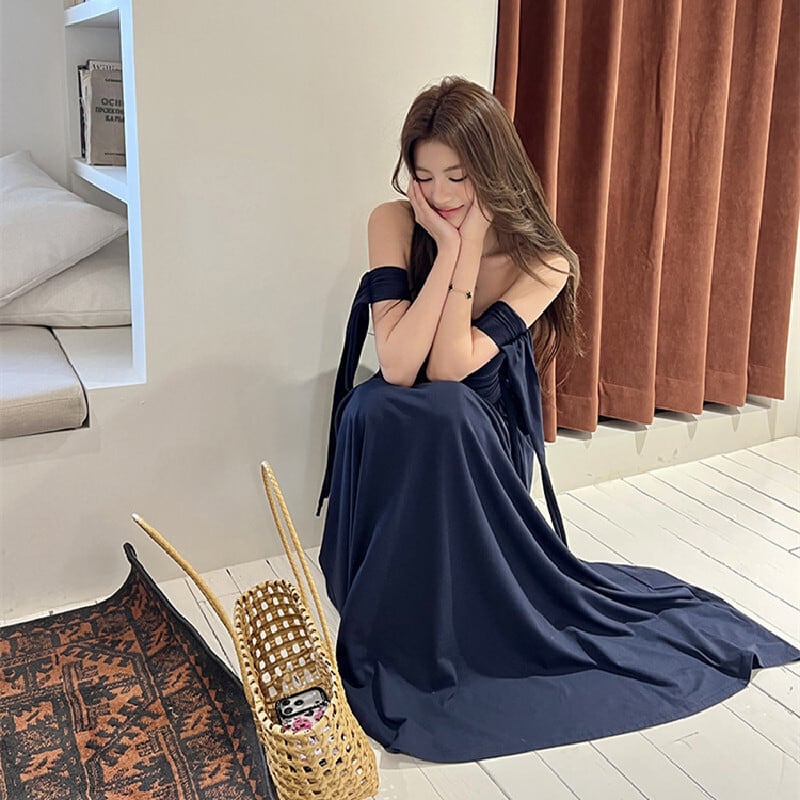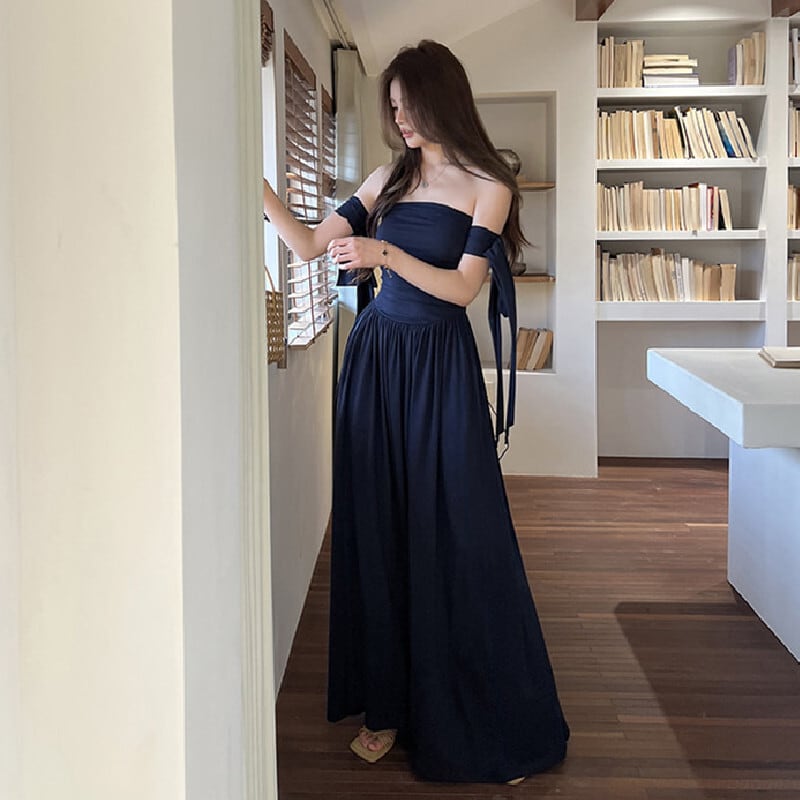 ロングワンピース リボン フレア カジュアル 一目惚れ ダークブルー S M L