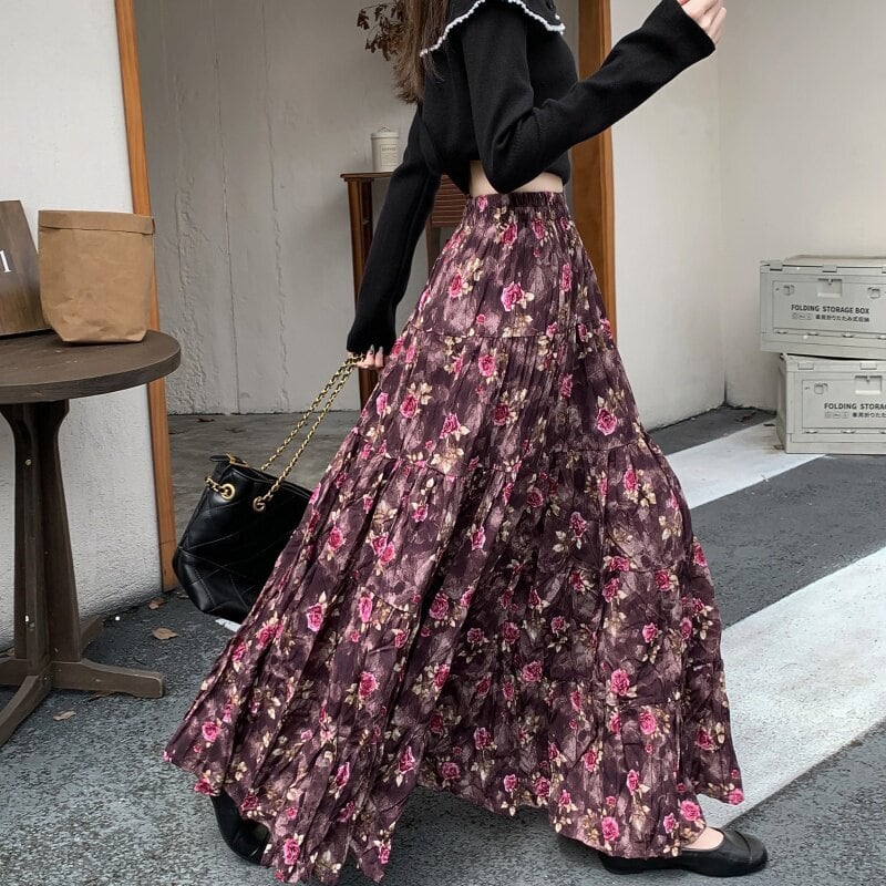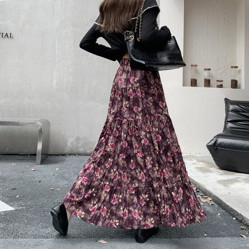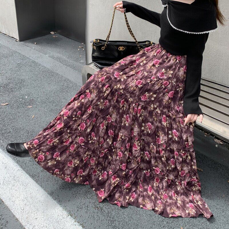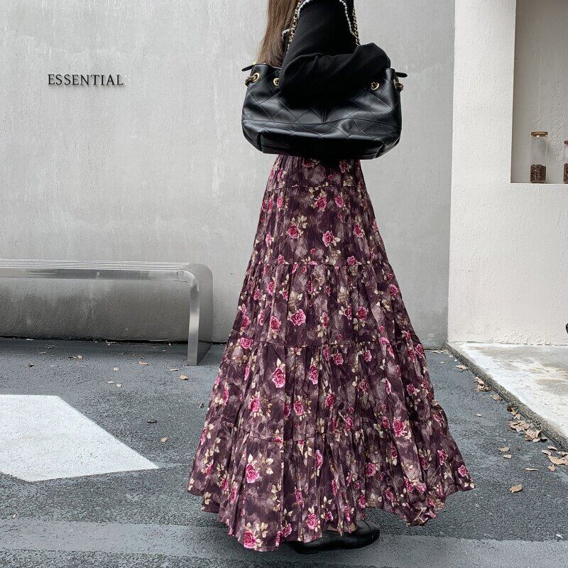 ボトムス スカート 花柄 カジュアル 不規則プリーツ ロングスカート 美人度アップ