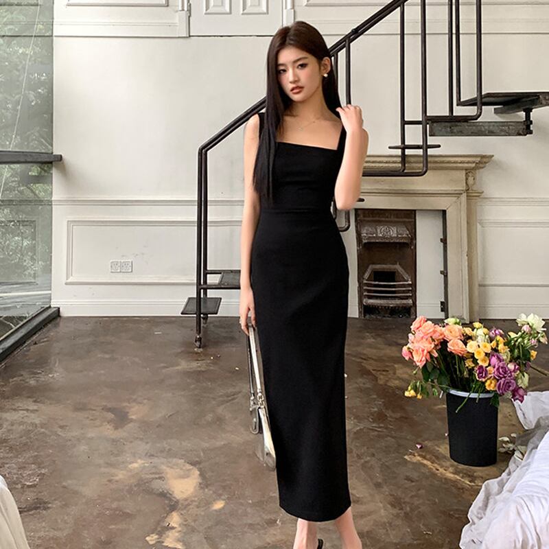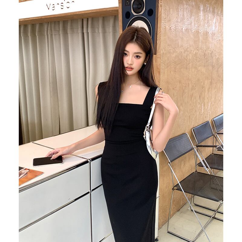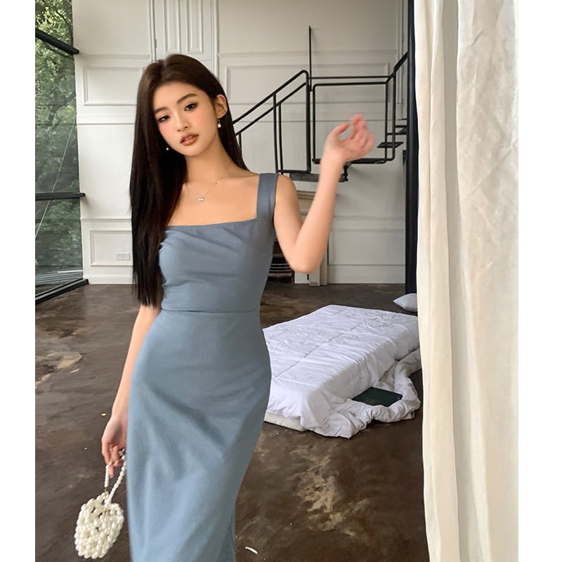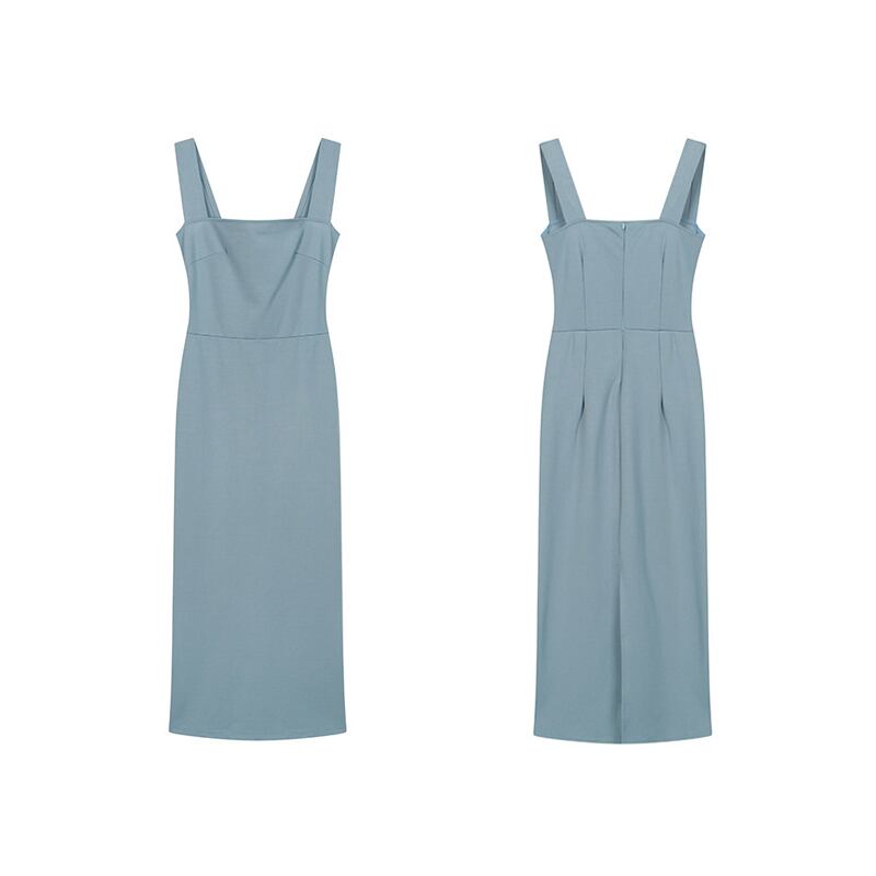 2colors ワンピース スクエアネック 無地 バックスリット ブラック ブルー S M L