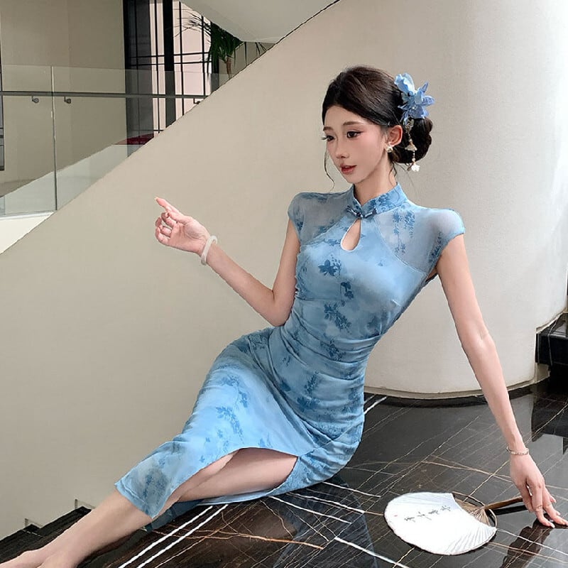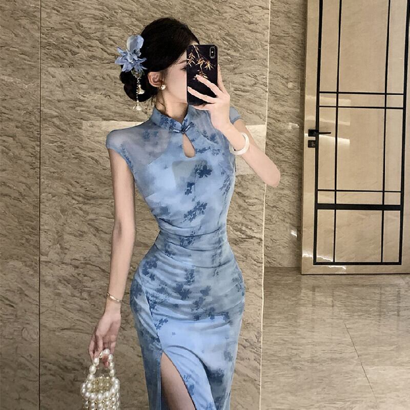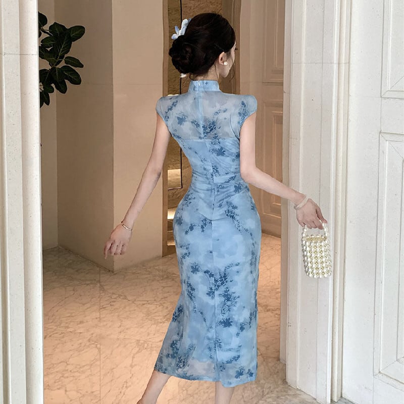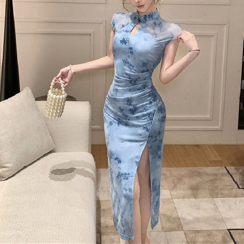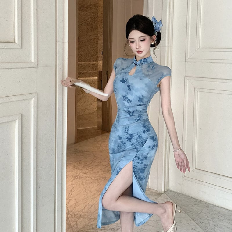 ワンピース チャイナ風 花柄 ハイウエスト スリット メッシュ ブルー S M L