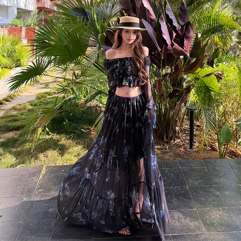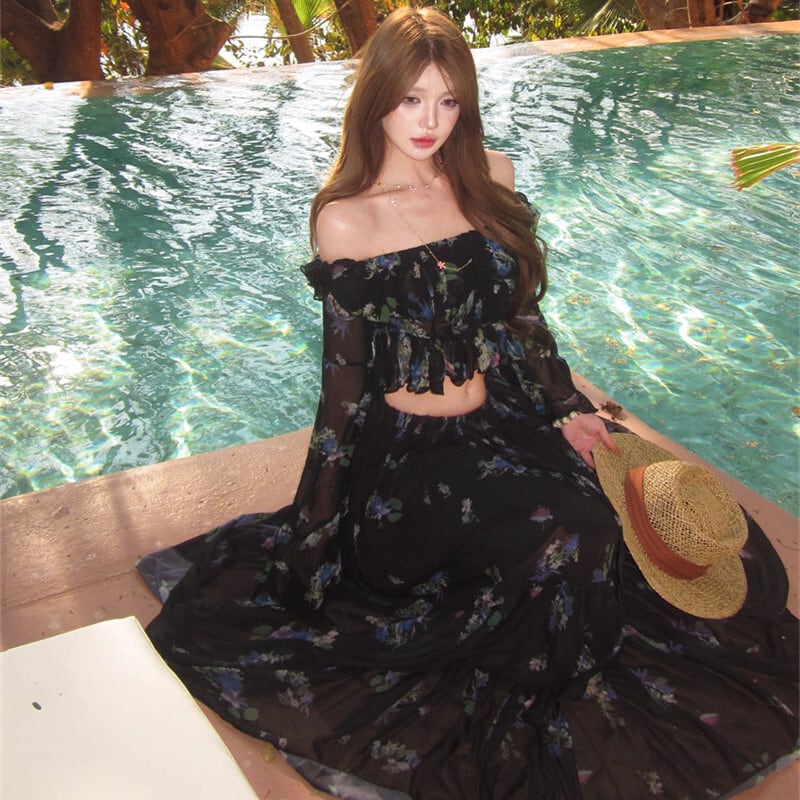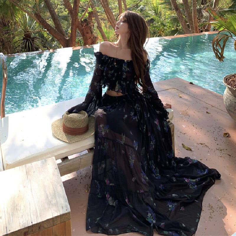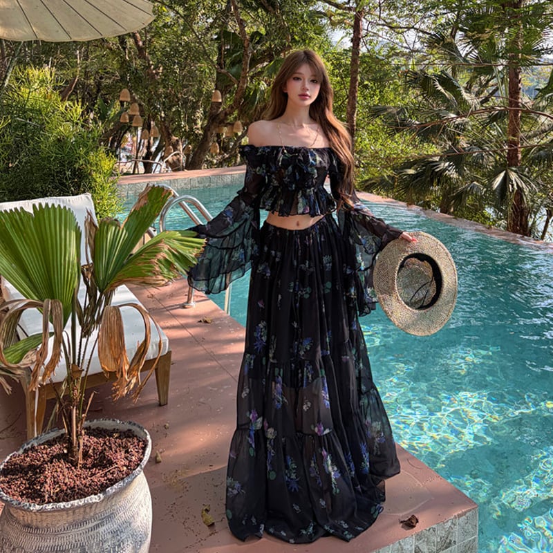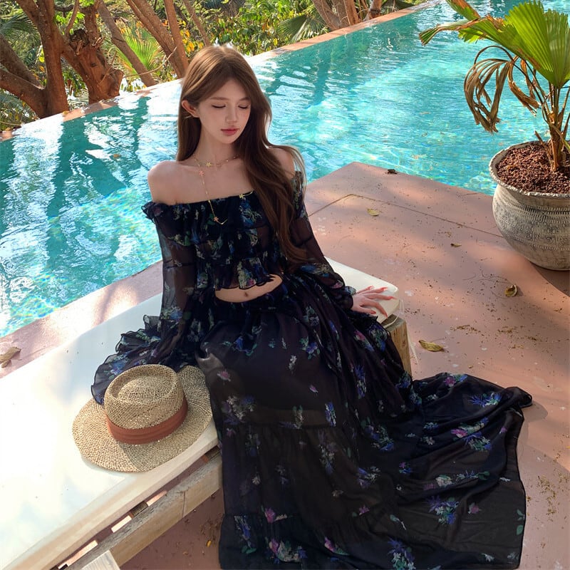 【SummerVacationシリーズ】セットアップ ボートネック トップス+フレアスカート ペプラム 花柄 S M L