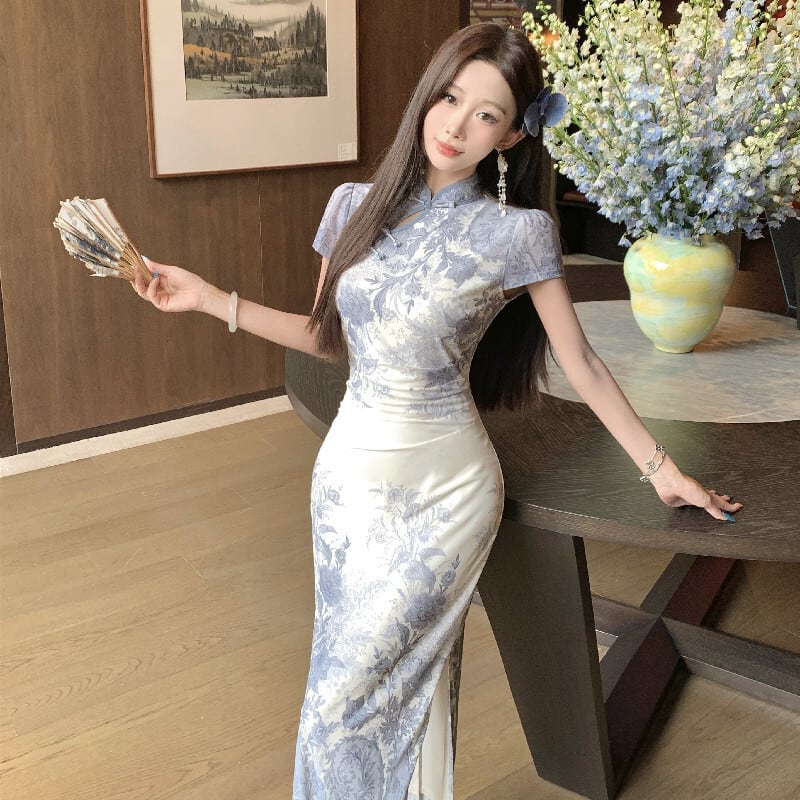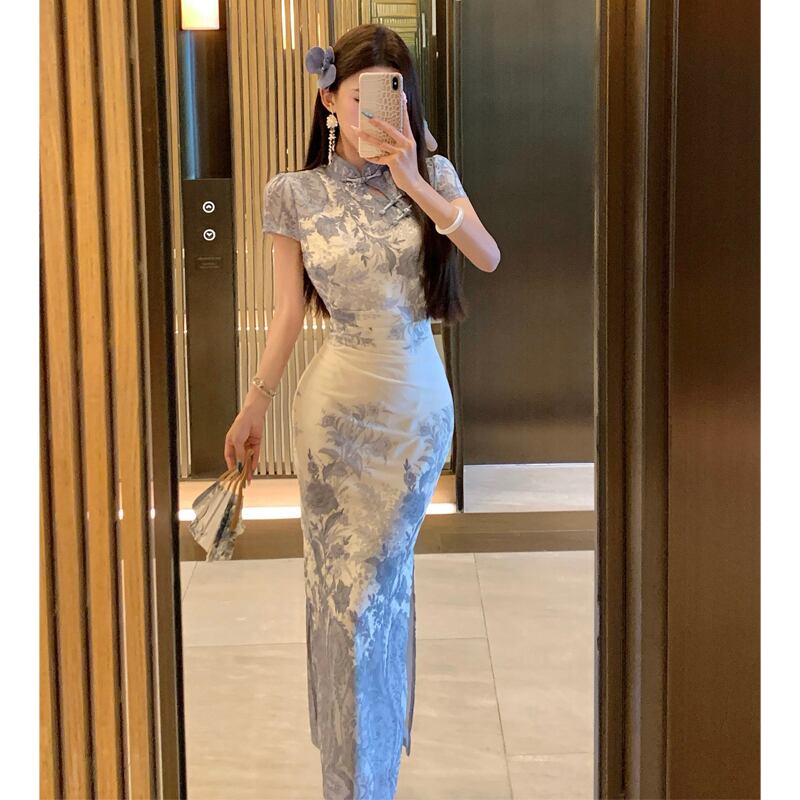 チャイナドレス スリット 配色 プリント フィットウエスト 気質溢れる S M L