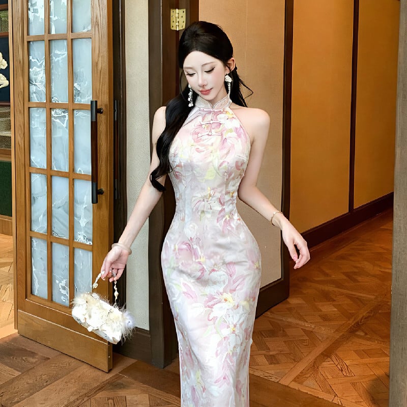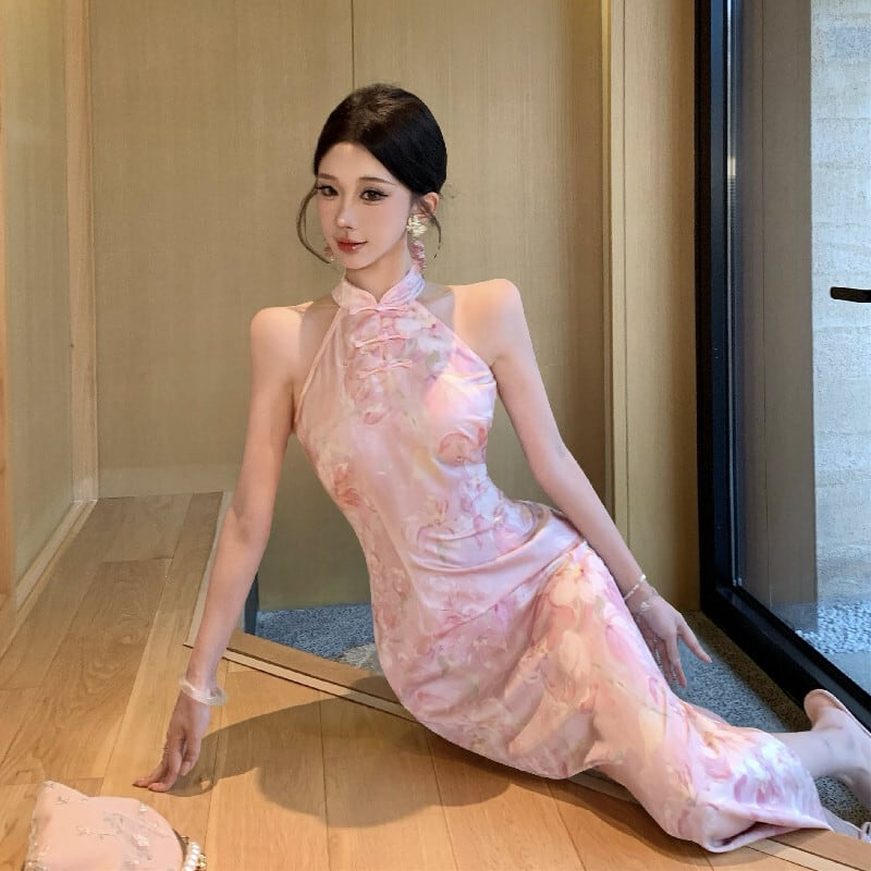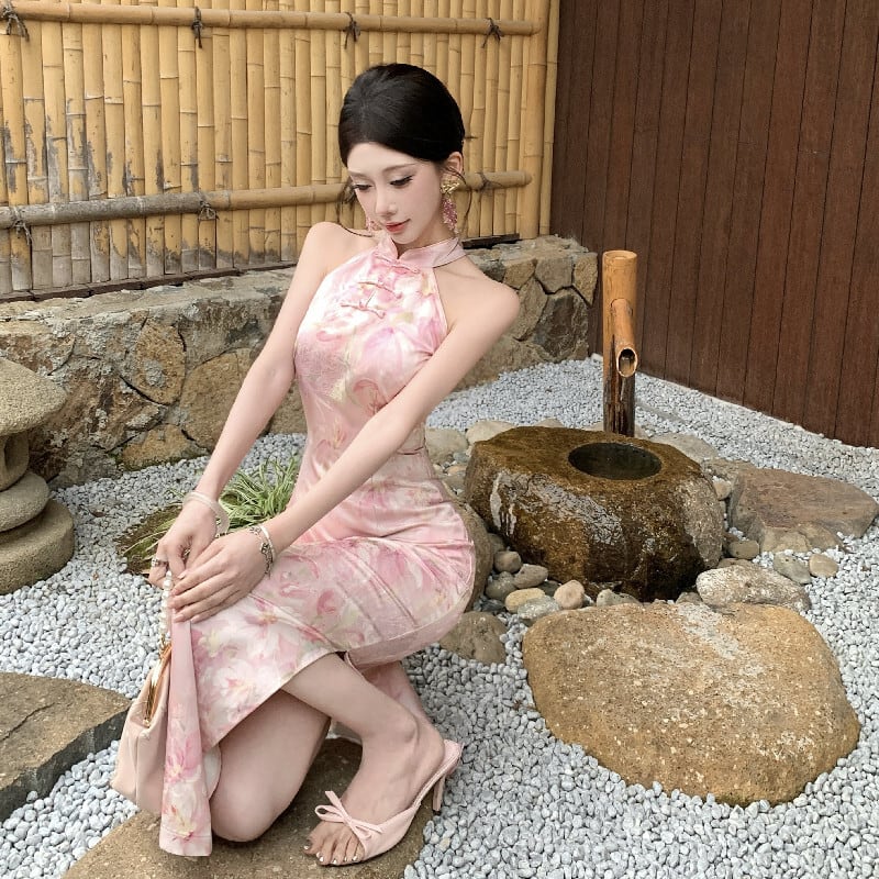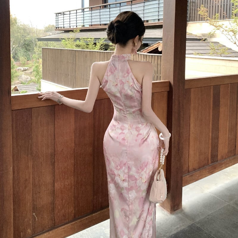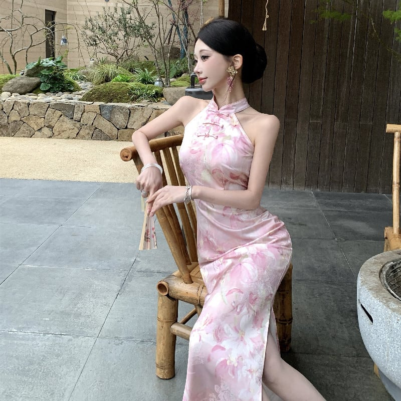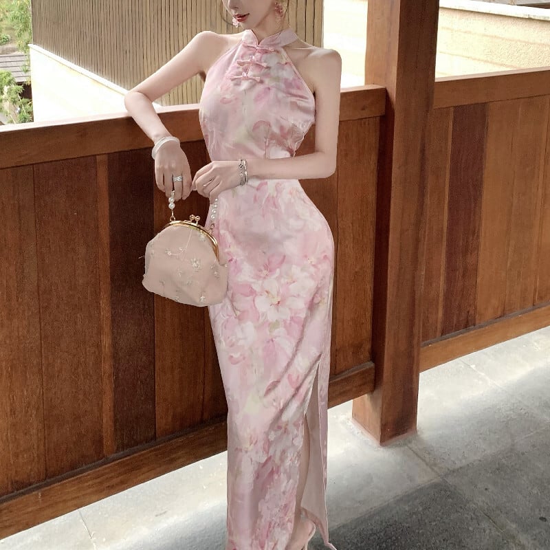 チャイナドレス ノースリーブ 美人度アップ スリット ピンク S M L