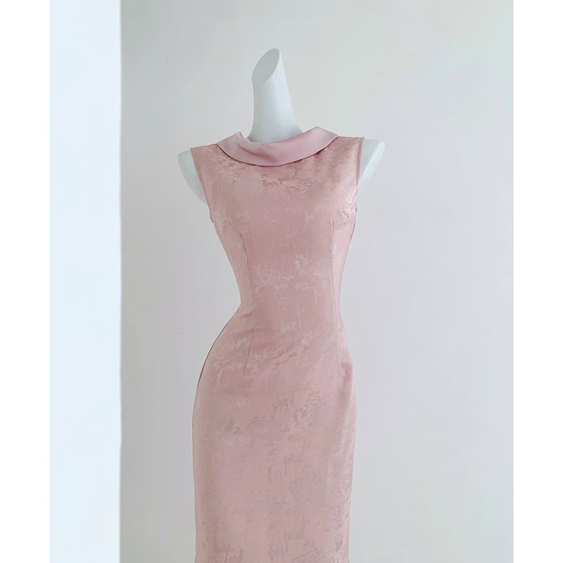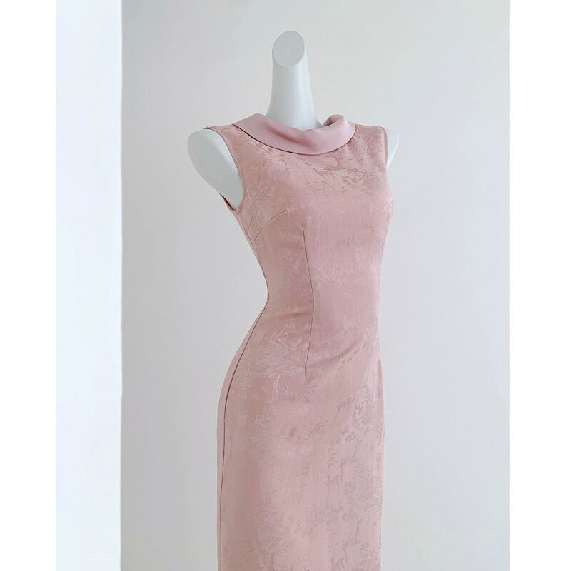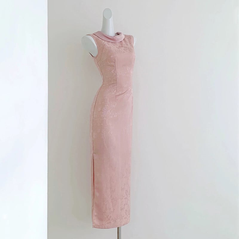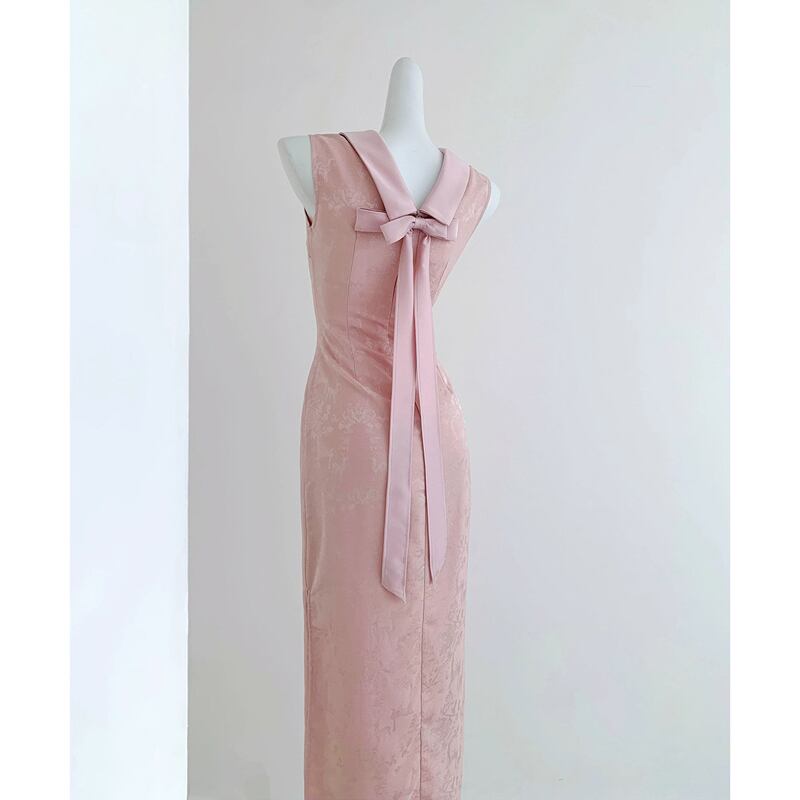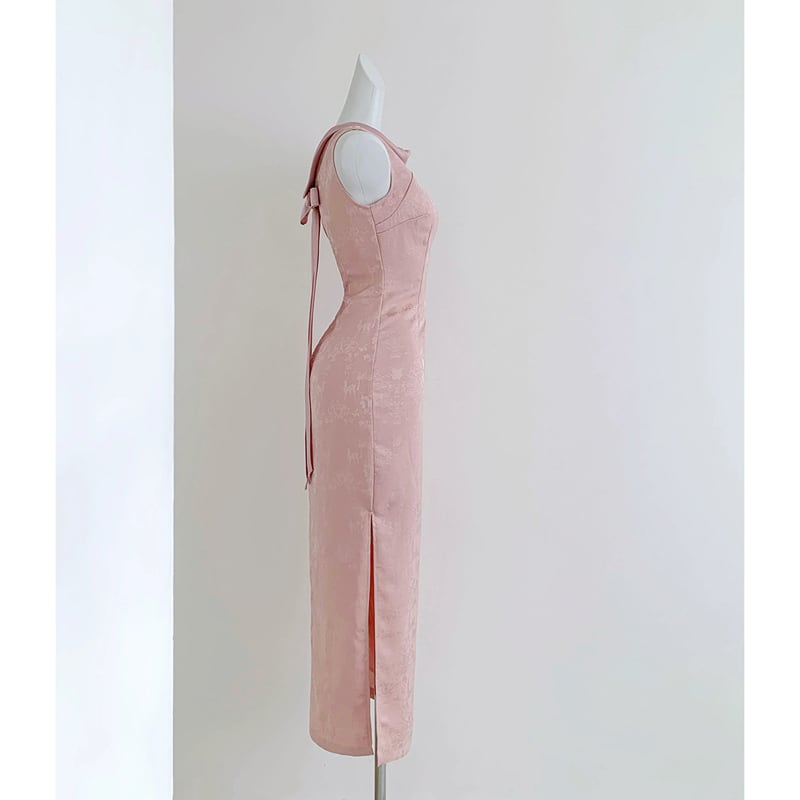 ワンピース ノースリーブ バックリボン レトロ サイドスリット ピンク S M L XL