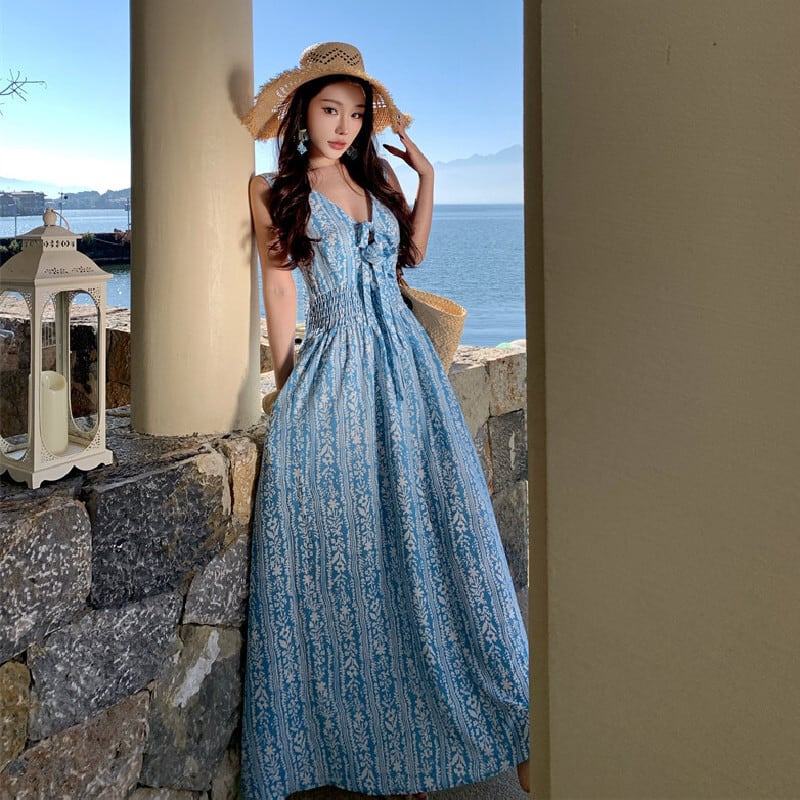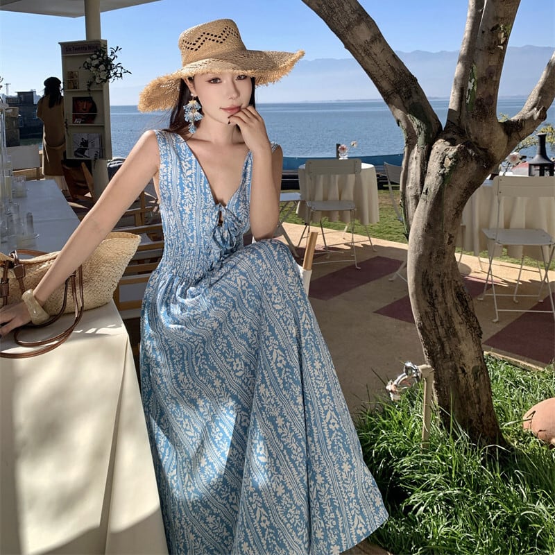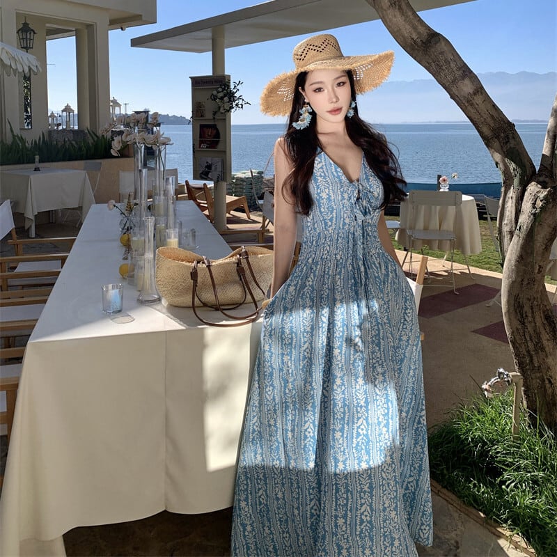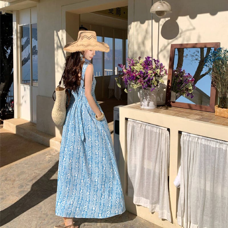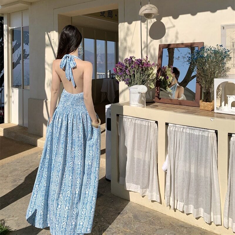 【SummerVacationシリーズ】ワンピース Vネック ボヘミアン バックレス ブルー S M L