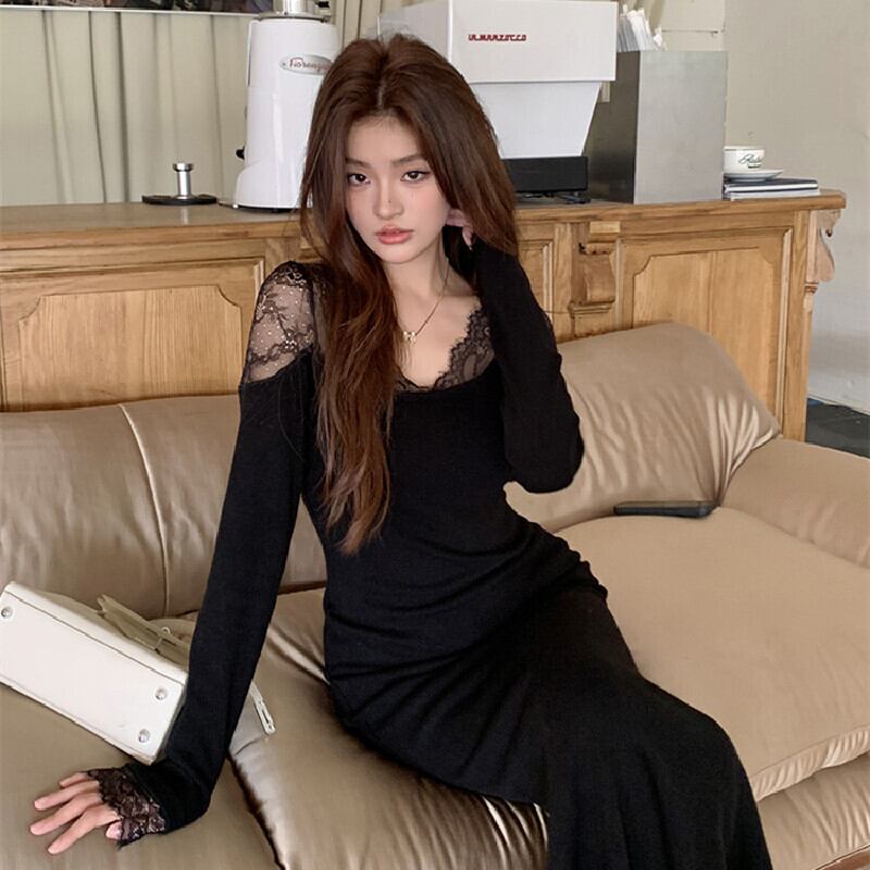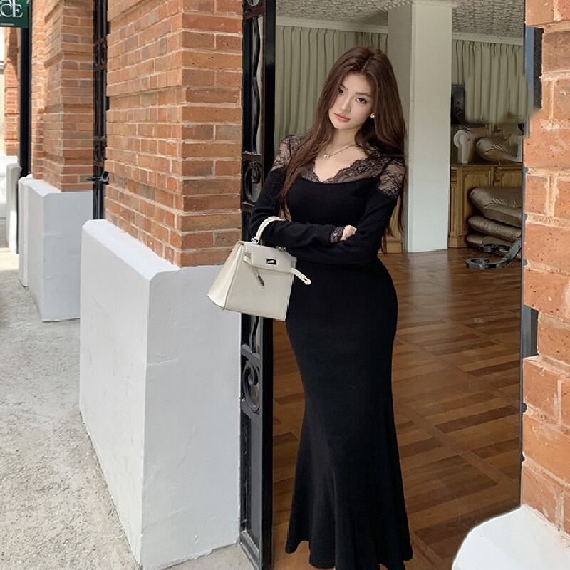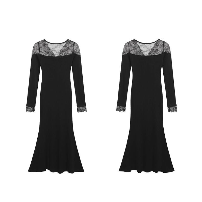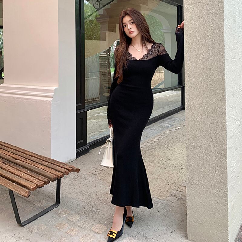 【在庫処分 50%OFF 】S1点残り✿ワンピース✿ Vネック レース 長袖 魅せられる ブラック