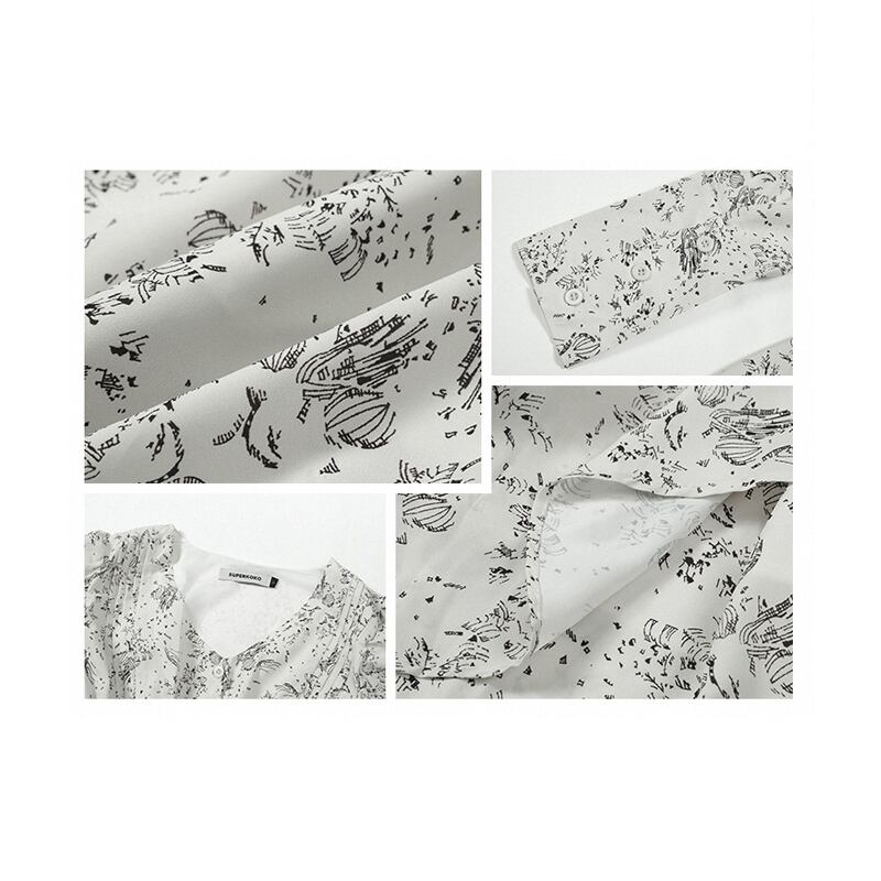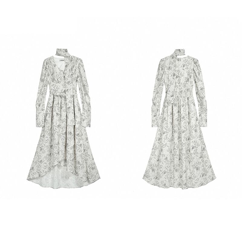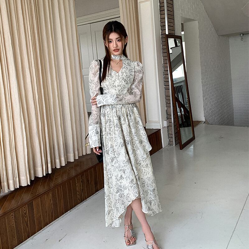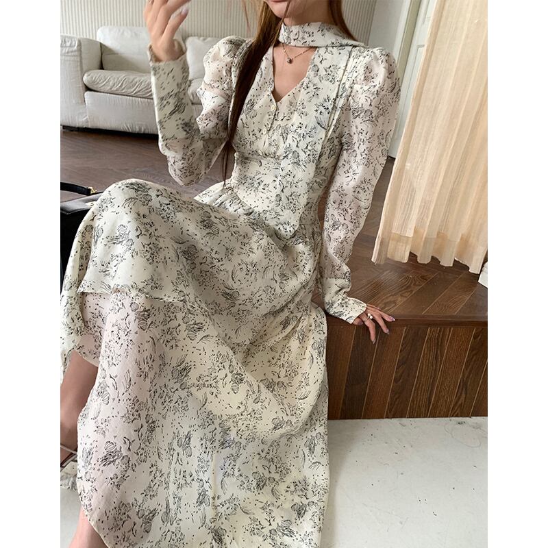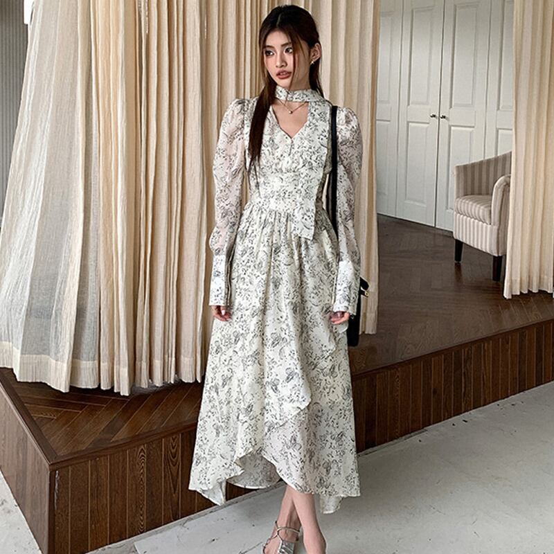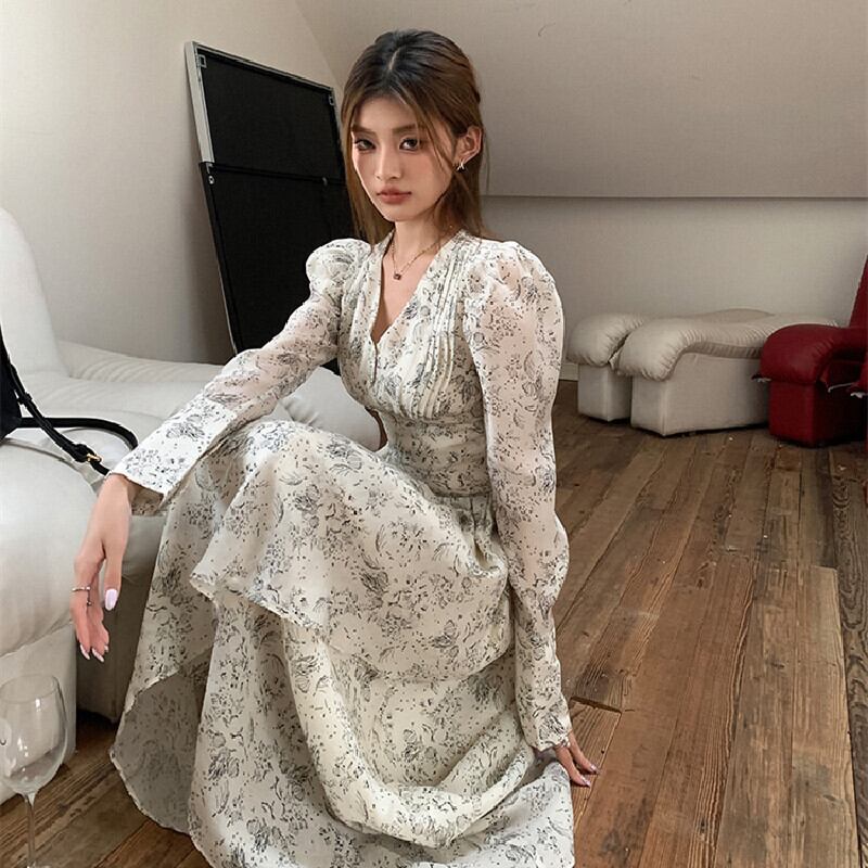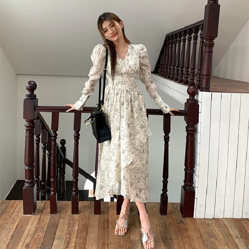 【在庫処分 50%OFF 】S1点残り✿ワンピース✿ Vネック 肩パフ 長袖 ロング丈 花柄 気質溢れる