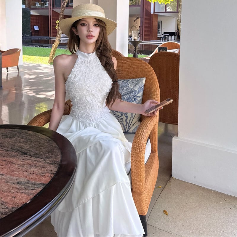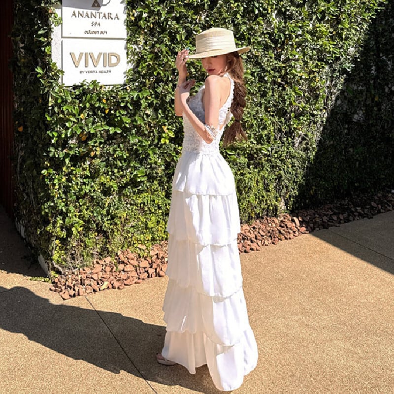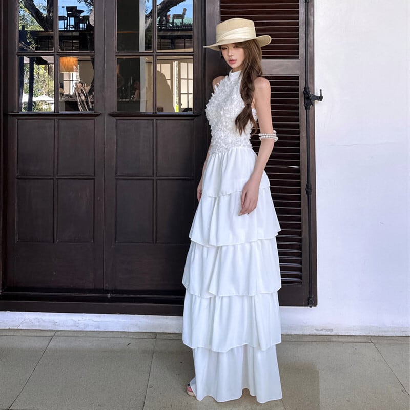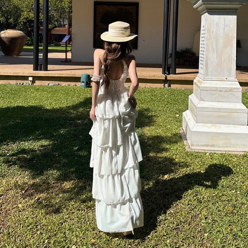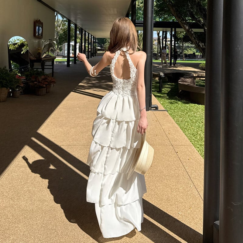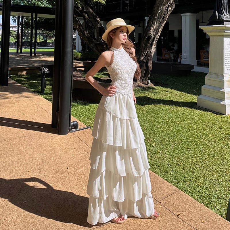 ロングワンピース ティアード バックレス プリンセス風 ホワイト S M L