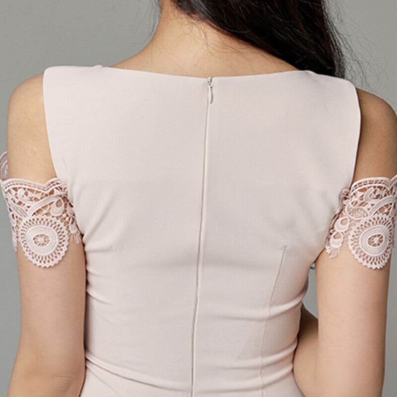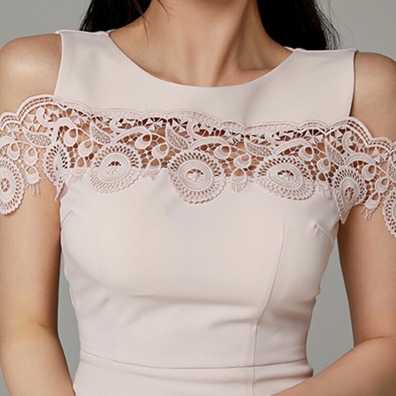 ワンピース セクシー 女性らしい パーティードレス ラウンドネック 切り替え 透かし彫り レース ライトピンク S M L XL